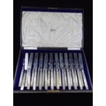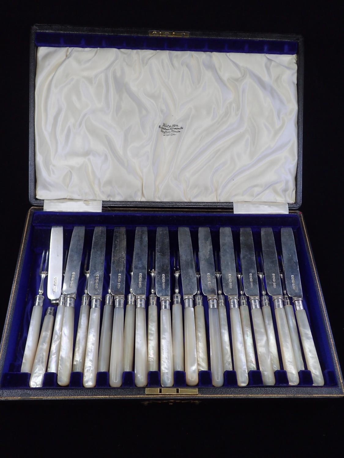 A boxed set of silver and mother of pearl dessert knives and forks. Sheffield 1904 (we note one knife is damaged). (Box name West & Son Grafton Street Dublin)