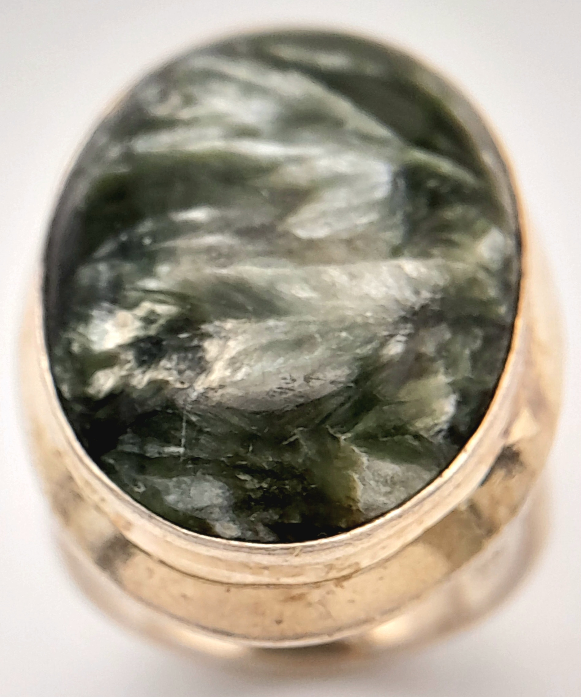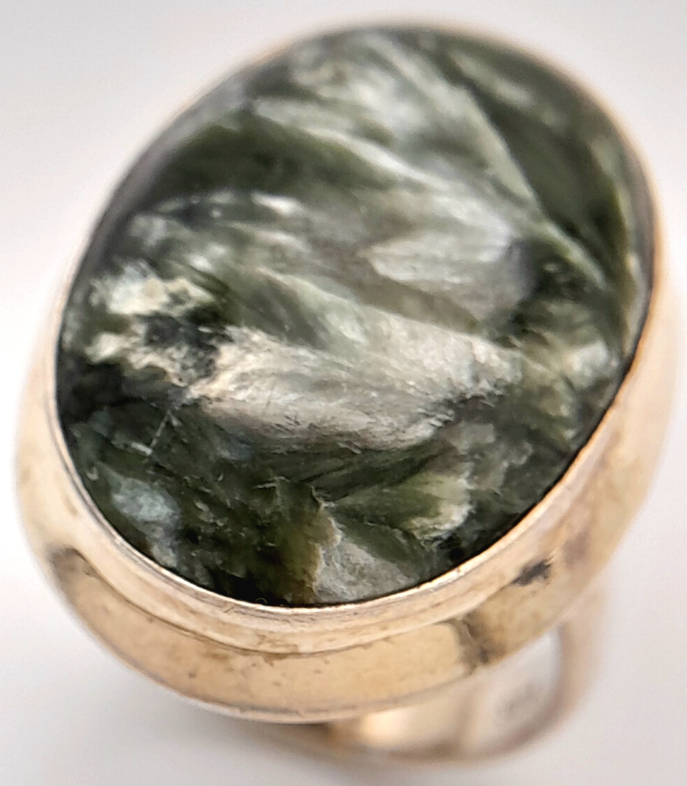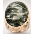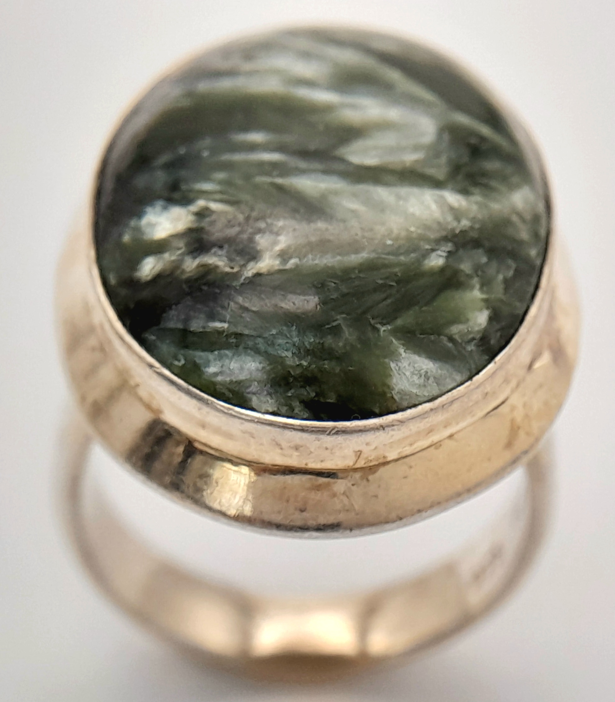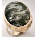 An Early 21 st Century Sterling Silver and Seraphinite Cabochon Ring, Size N. Seraphinite is reputed to be a healing stone and is also known as Chlorite Jade, The Ring measures 2.6cm Long at the Crown and weighs 9.74 Grams.