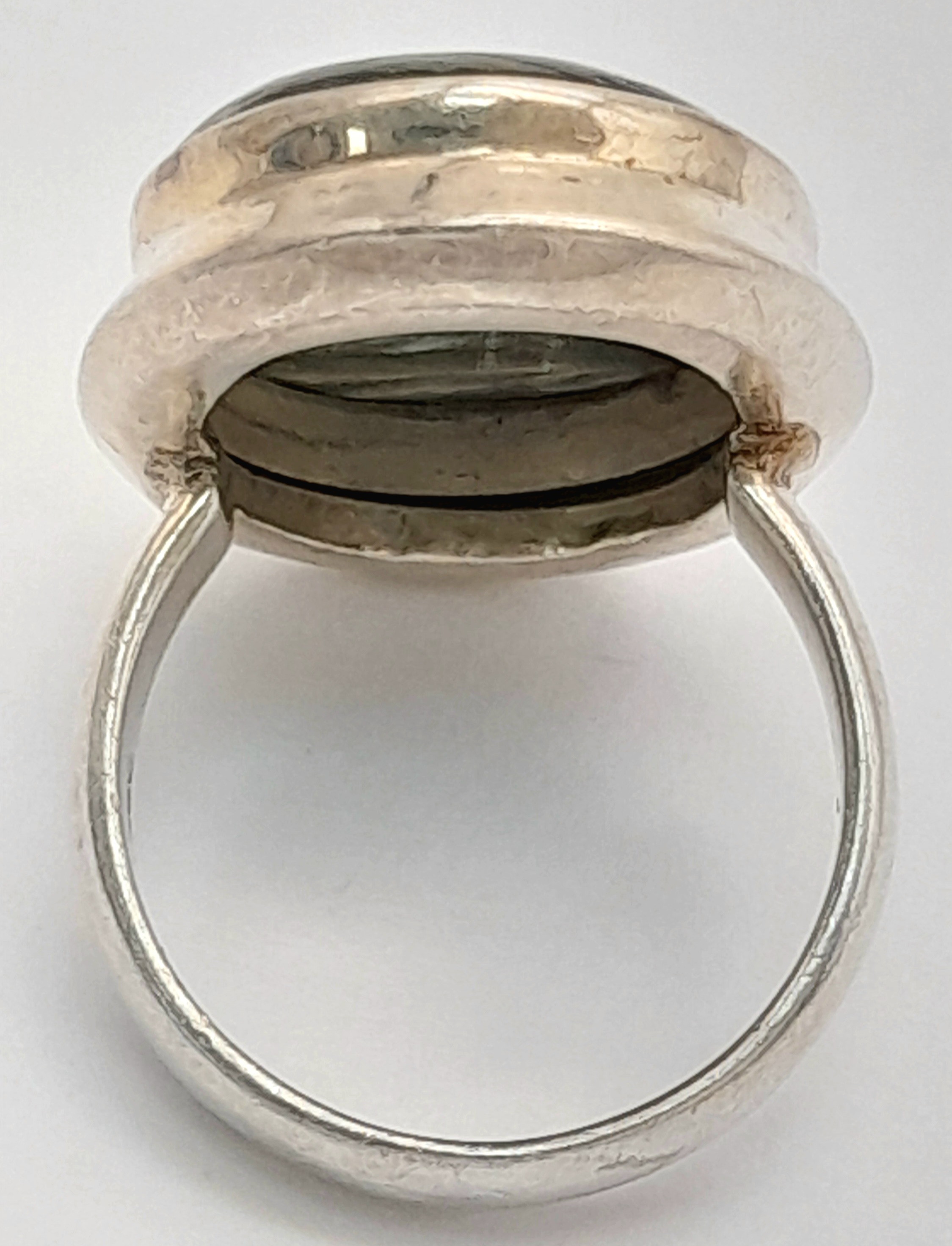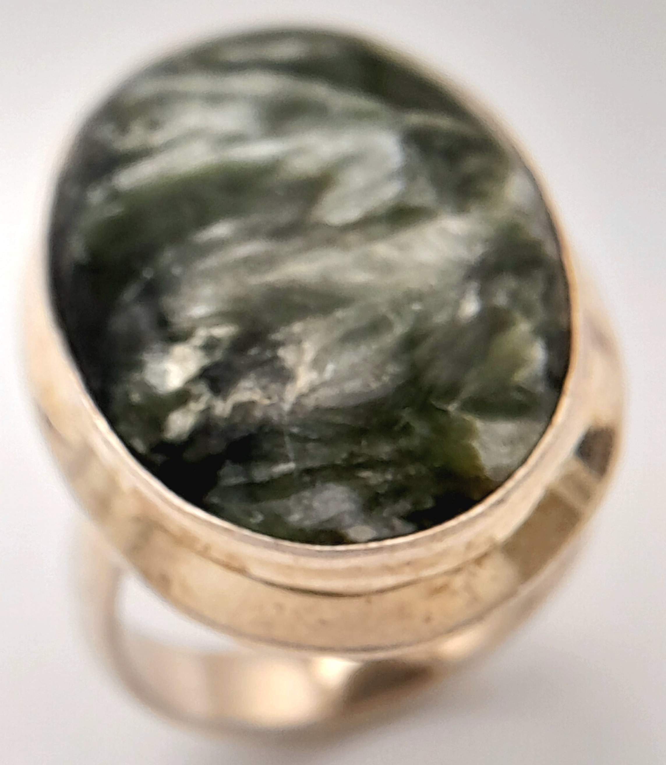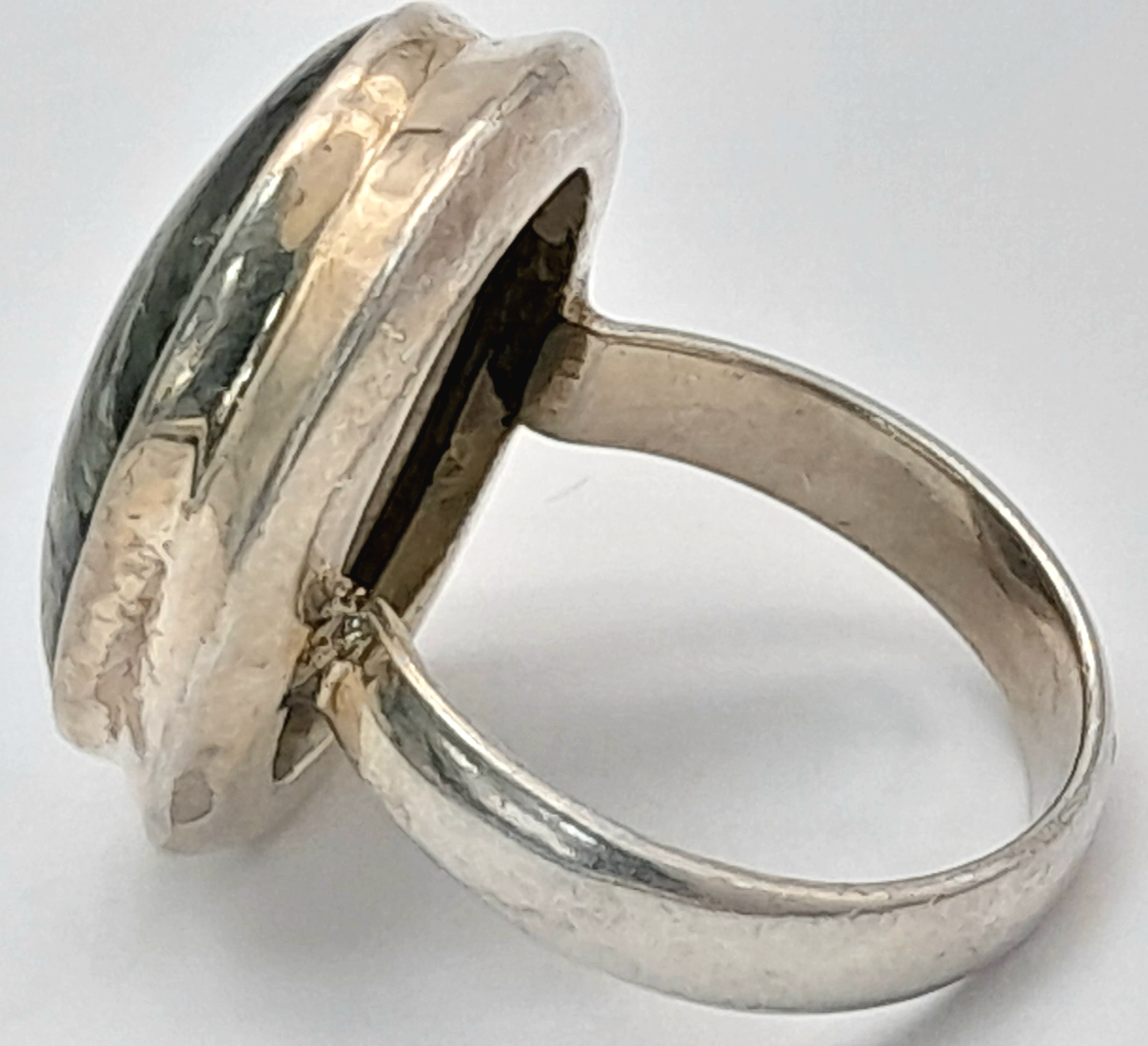 An Early 21 st Century Sterling Silver and Seraphinite Cabochon Ring, Size N. Seraphinite is reputed to be a healing stone and is also known as Chlorite Jade, The Ring measures 2.6cm Long at the Crown and weighs 9.74 Grams.