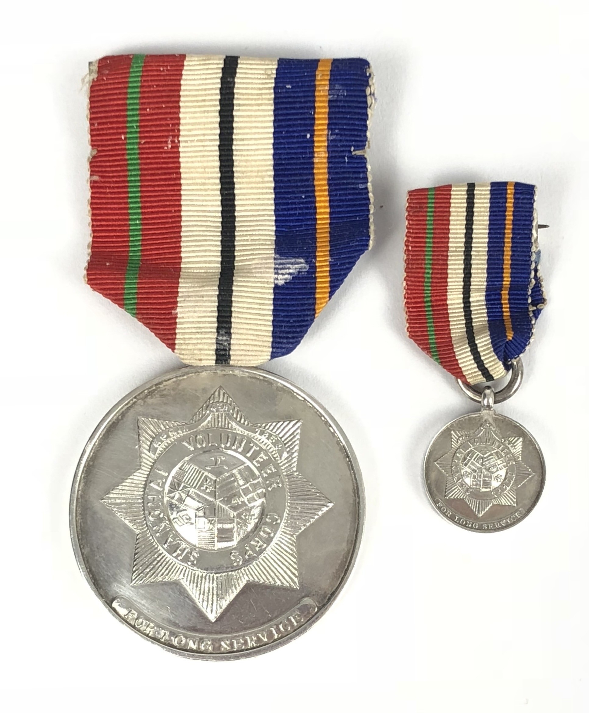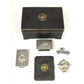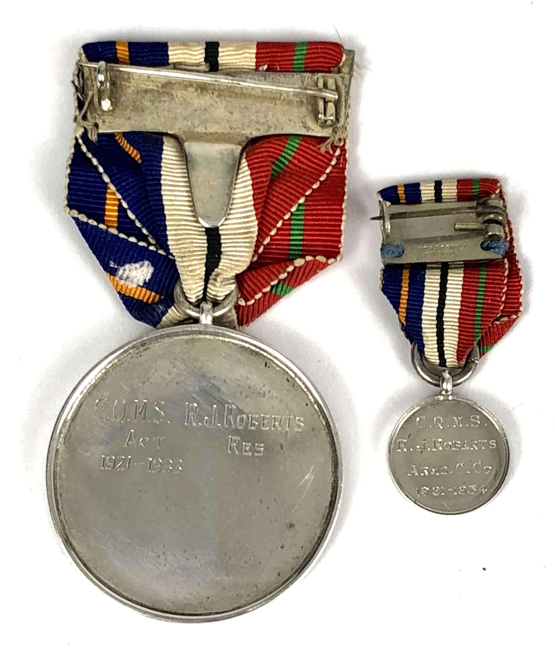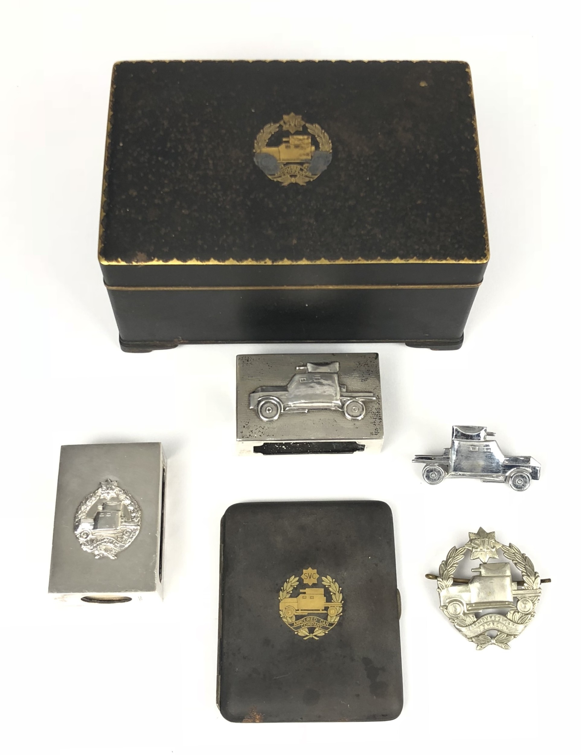 Armoured Car Company, Shanghai Volunteer Corps Long Service Medal and items. Good scarce example engraved to C.Q.M.S. R.J. Roberts ACT 1921-1933, complete with original ribbon and suspension pin, miniature and ribbon bar ... Armoured Car Company die-pressed white metal cap badge on loops ... chromed die-pressed armoured car arm badge ... blackened cigarette case, the lid bearing gilt Armoured Car Company badge, the interior bearing his signature and Chinese silversmith's mark in gilt ... heavy black cigarette box, the lid bearing gilt Armoured Car Company badge, the gilded inner lid engraved C.Q.M.S. R.J. ROBERTS from his comrades of the ARMOURED CAR COMPANY. SHANGHAI VOLUNTEER CORPS, on the occasion of his retirement. 30th June 1921 - 30th June 1934. Chinese mark to base ... silvered matchbox cover by TUCK CHANG bearing small applied Armoured Car Section to top, reverse engraved Q.M.S. R.J. ROBERTS 1933 DRIVING ... similar example bearing Chinese hallmarks with applied armoured car arm badge on the top, reverse engraved CPL. R.J. ROBERTS A.C. Co DRIVING.... selection of various related newspaper cuttings ... related 1974 letter concerning he items. PAYMENT BY BANK TRANSFER ONLY
