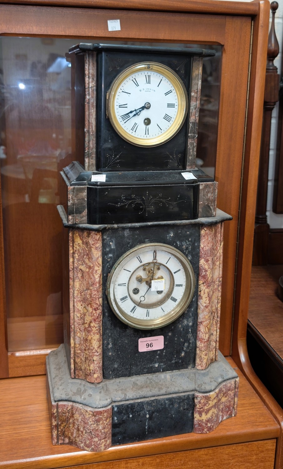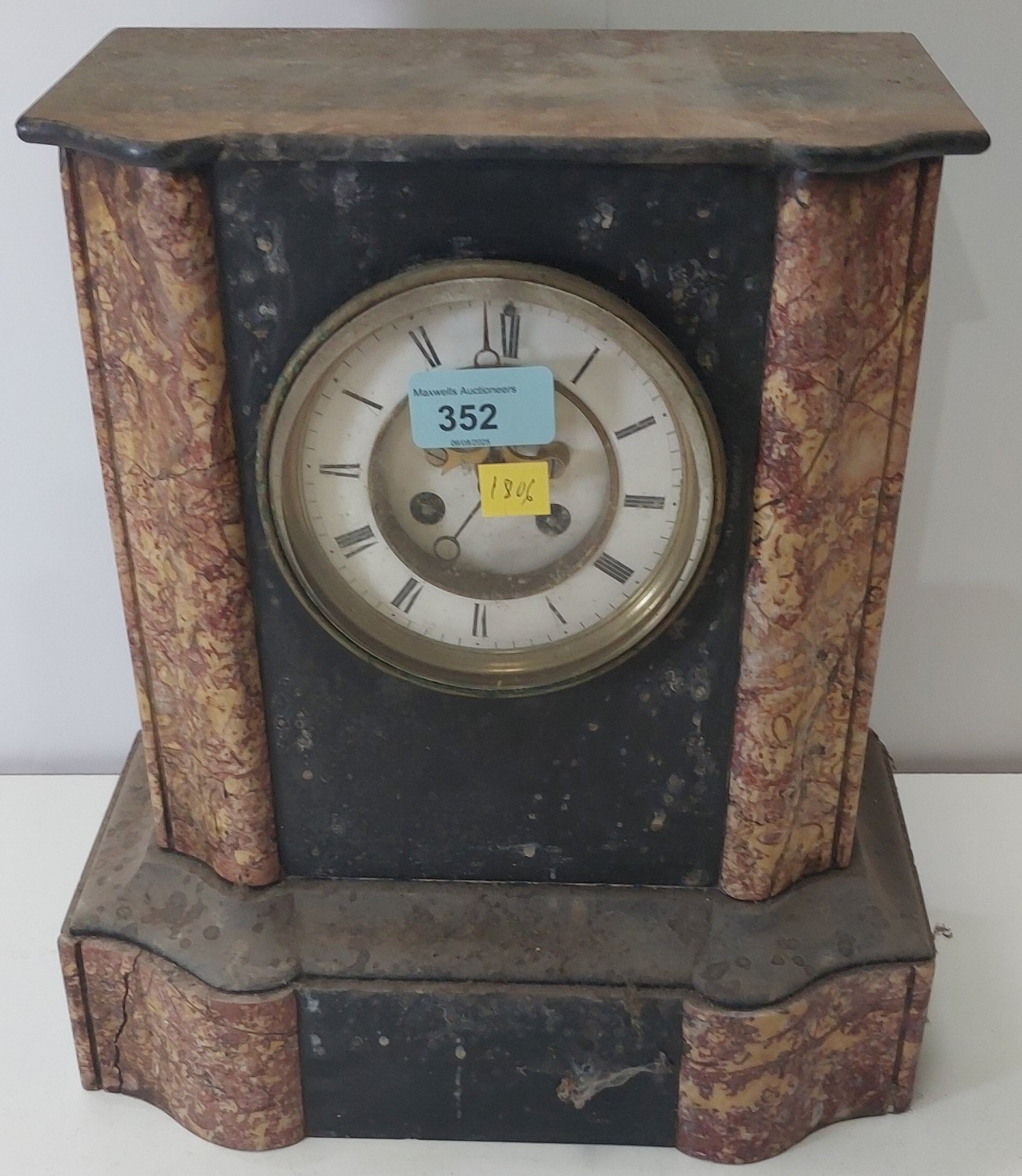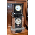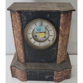A 19th century slate mantle clock with original columns, 8 day French drum movement with visible escapement. A 19th Century slate mantle clock with variegated columns and time piece movement; A 19th century gilt metal mantle clock in the Louis XV1 manner.
