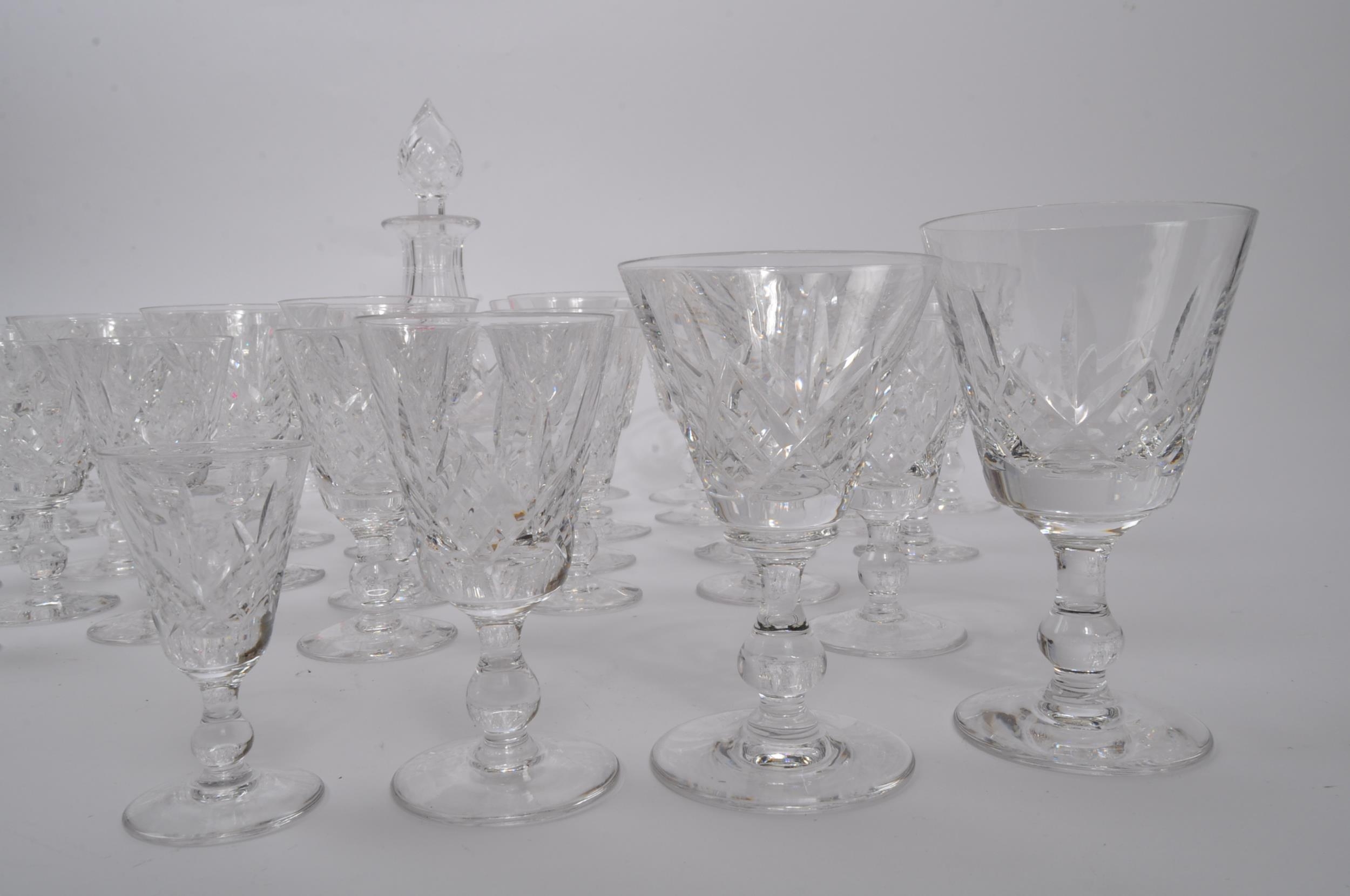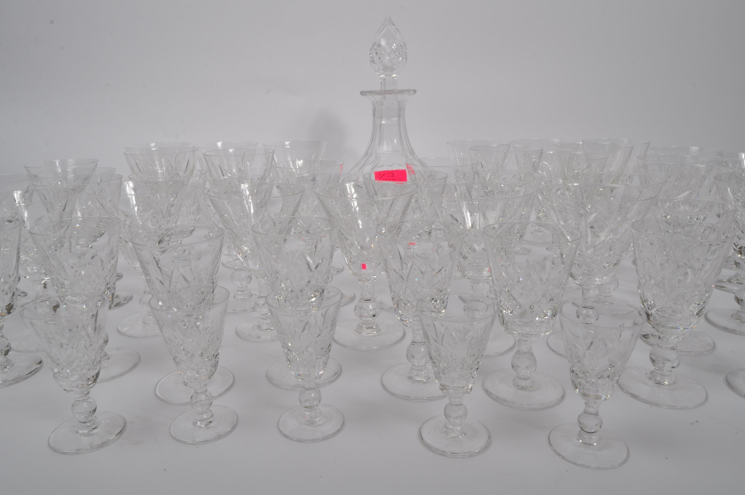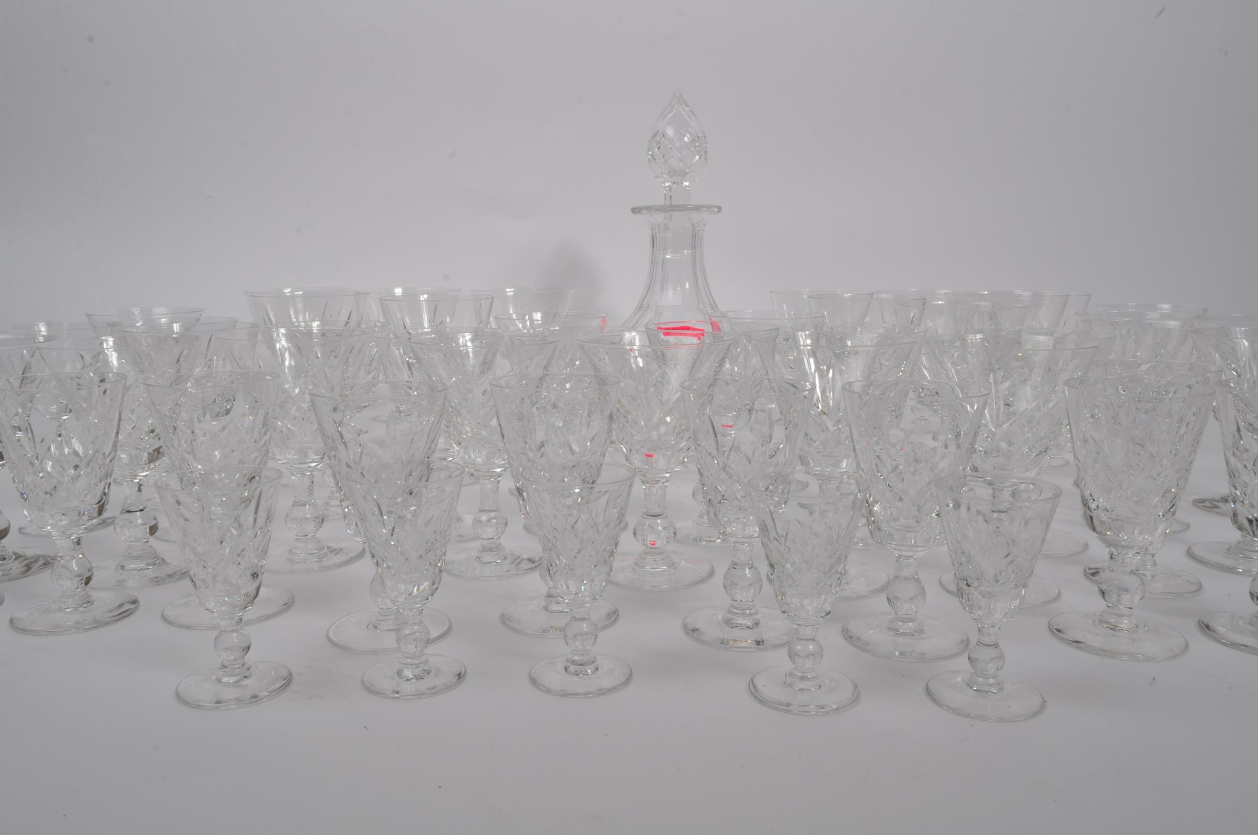 Large collection of vintage 20th century Stuart crystal glass drinking suite in the Glengarry pattern. The suite comprising of decanter with stopper, aperitif glasses, liquor glasses, water, white wine & red wine glasses.