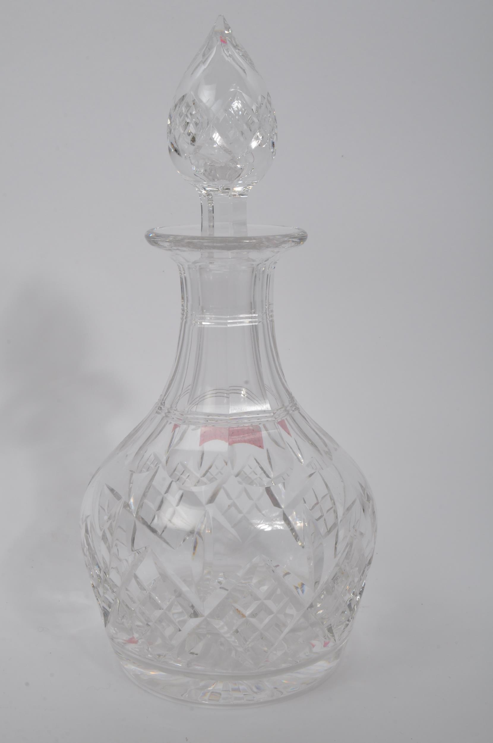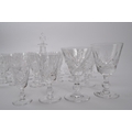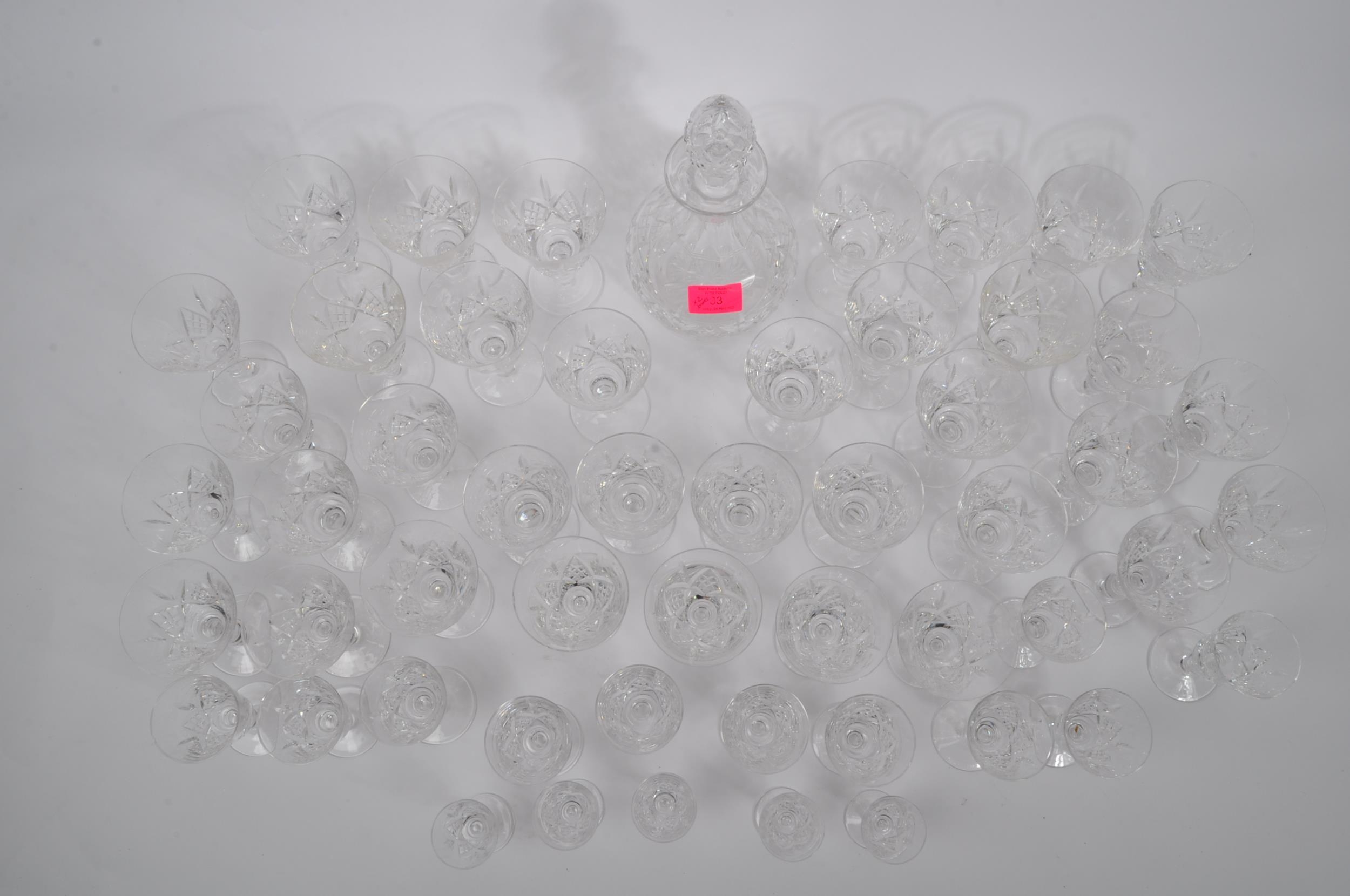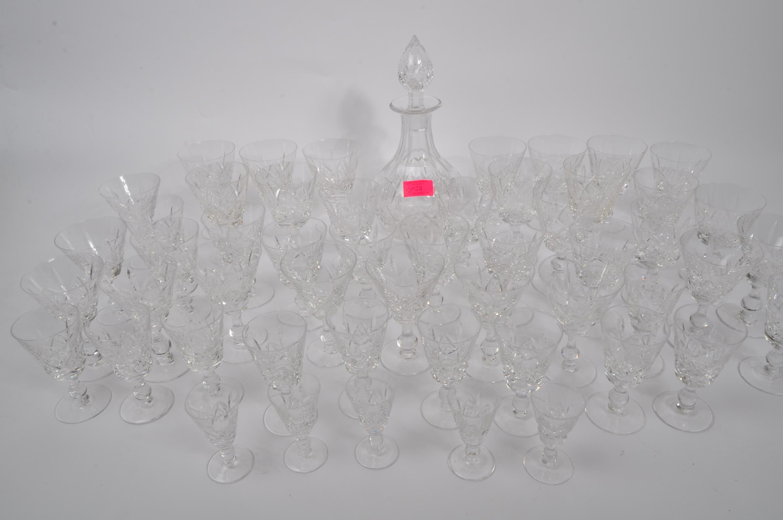 Large collection of vintage 20th century Stuart crystal glass drinking suite in the Glengarry pattern. The suite comprising of decanter with stopper, aperitif glasses, liquor glasses, water, white wine & red wine glasses.