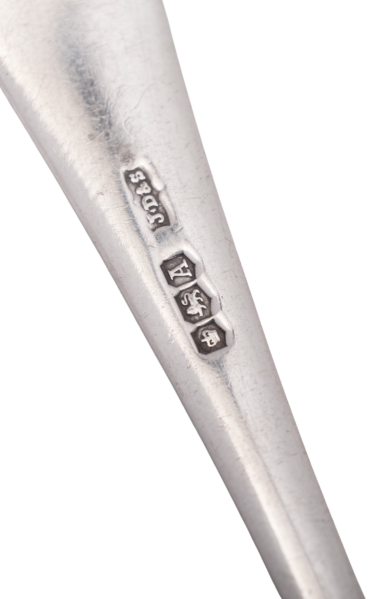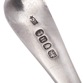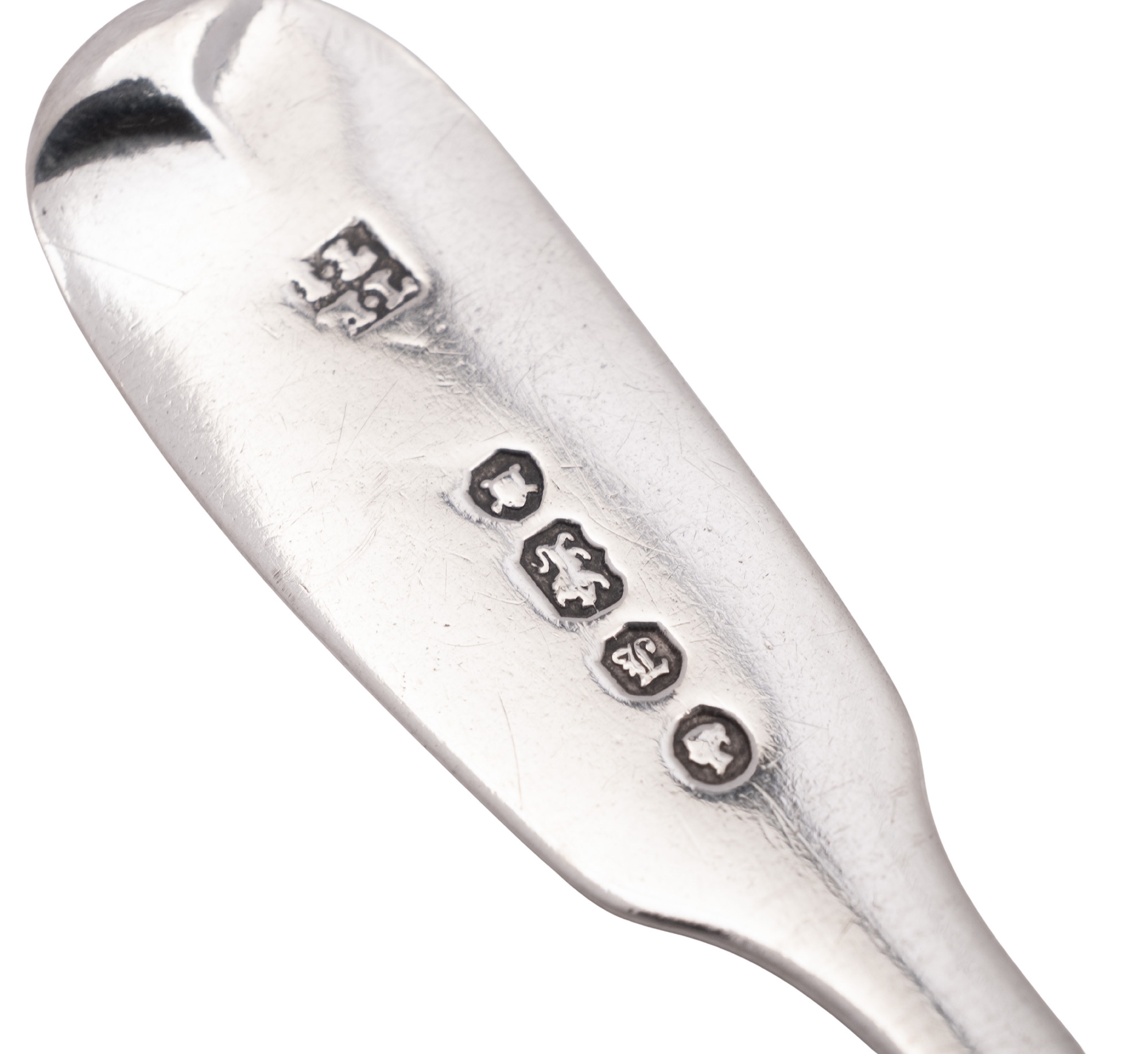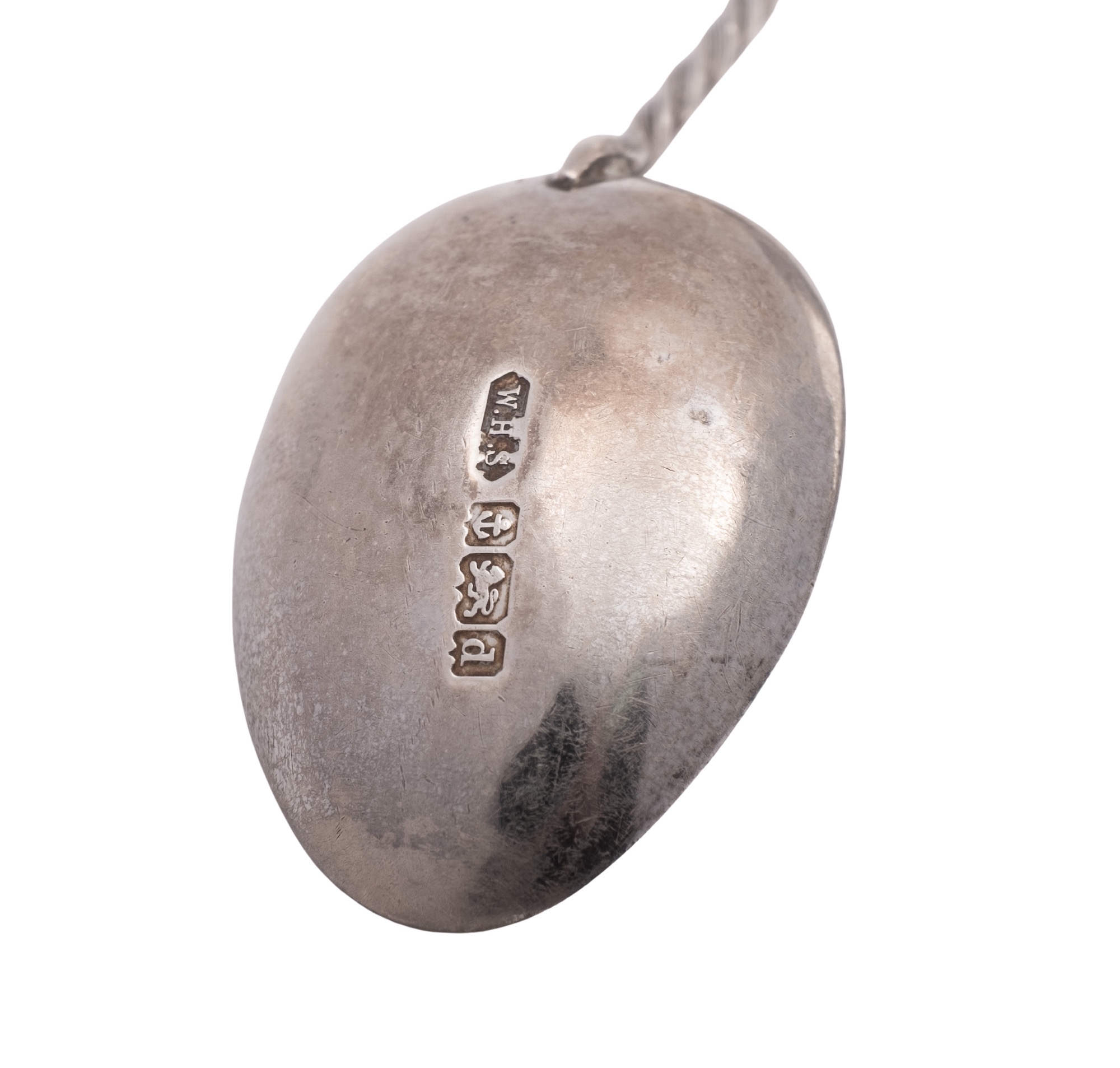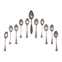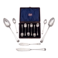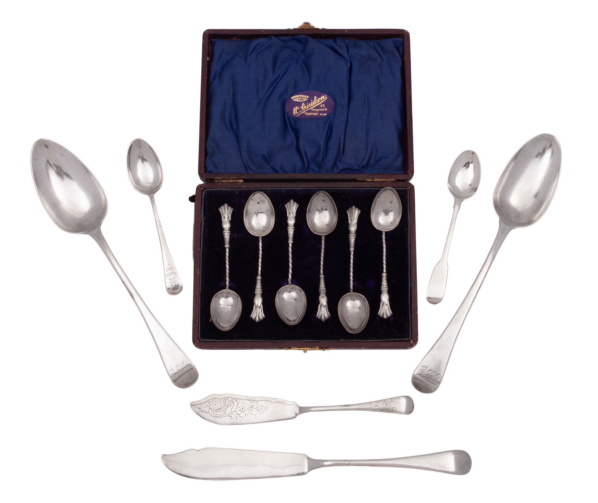 An Edwardian cased set of six silver tea/ coffee spoons, with twisted stems and decorative terminals, contained in original fitted case, by William Henry Sparrow, Birmingham 1903, together with two tablespoons, initialled, two teaspoons (one inscribed), and a butter spreader, mixed makers & dates, George III-VI, together with a silver plated butter spreader; the case 6.5'' (16.5cm) long; 7.6ozt (7)