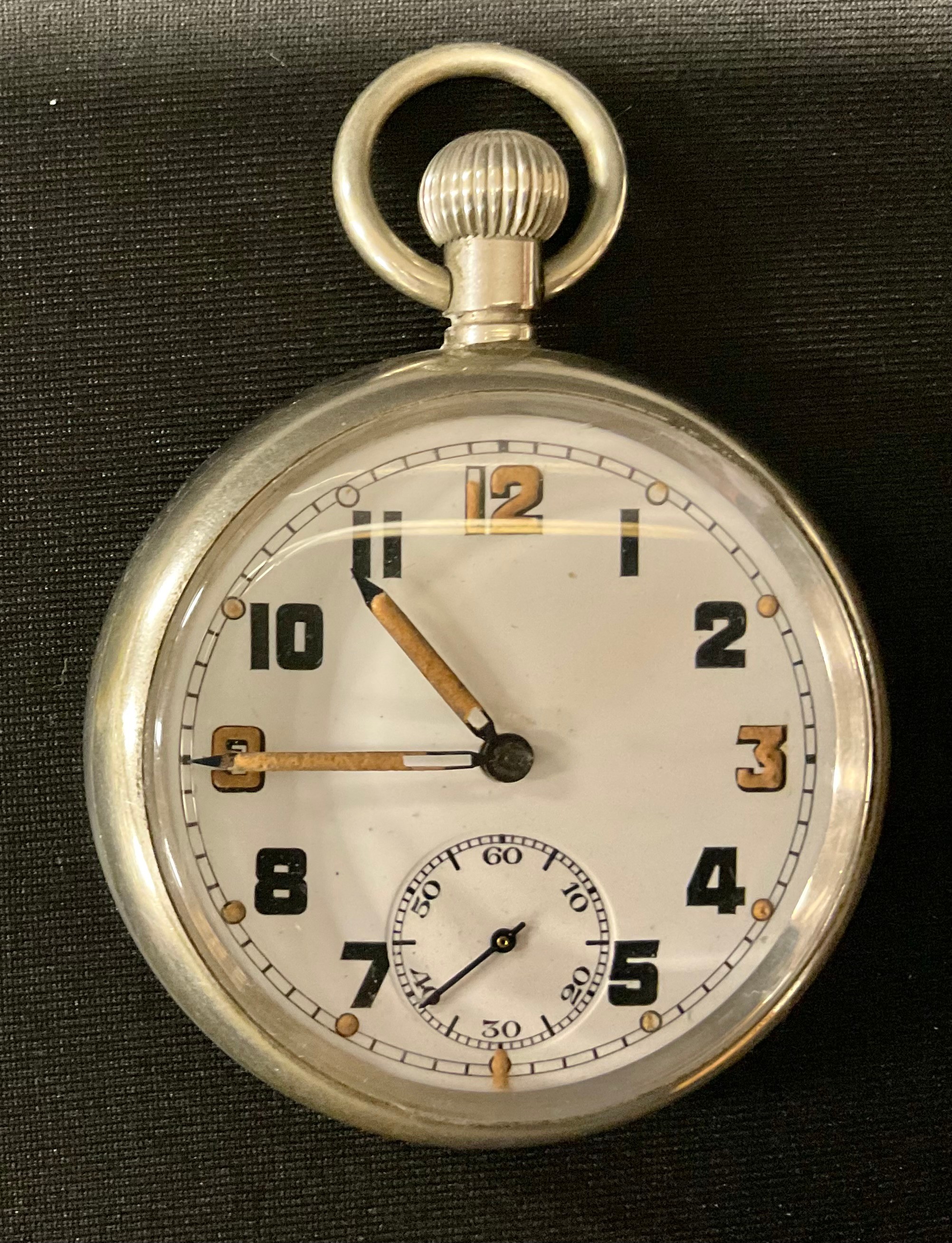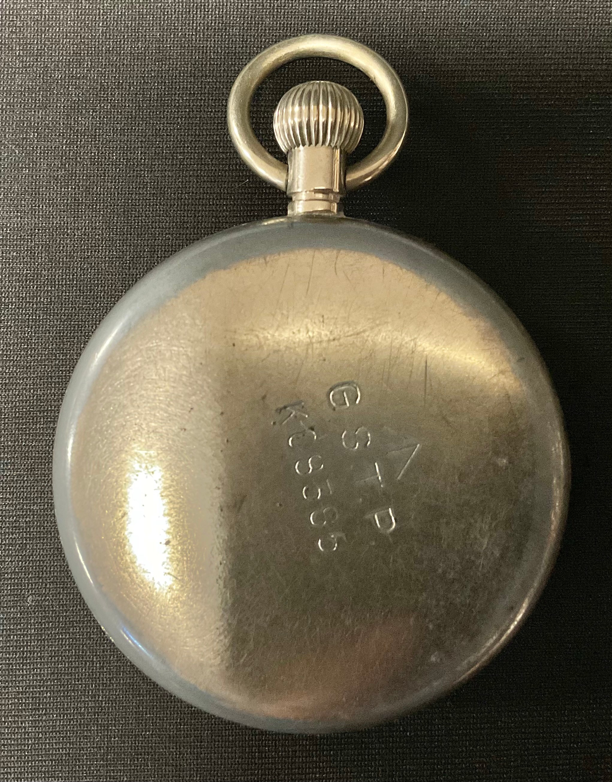 A World War II military open faced pocket watch, inscribed to verso G.S.T.P KC8385