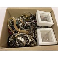 A basket of mostly silver and gold tone costume jewellery to include necklaces and gift sets.