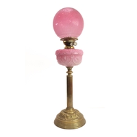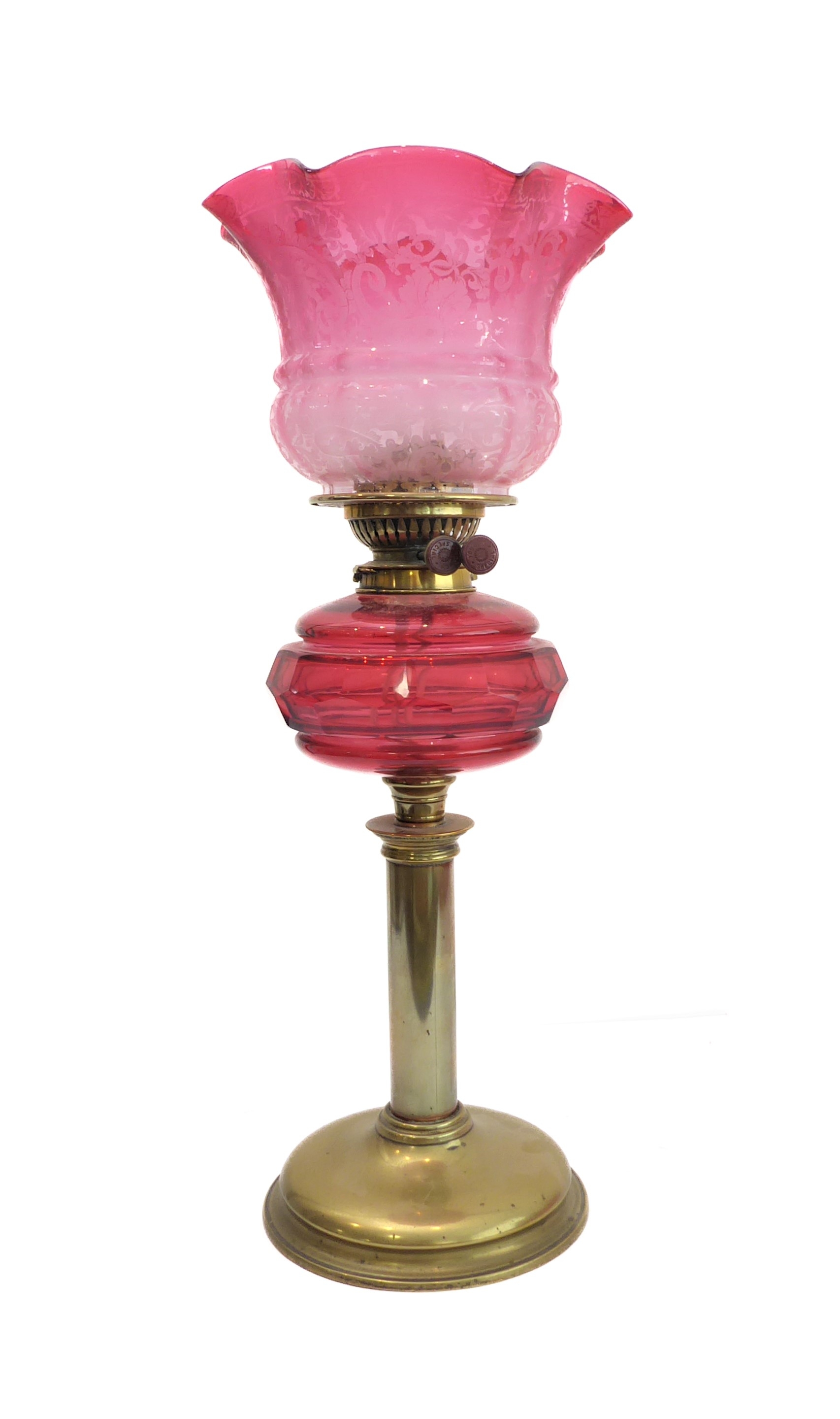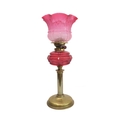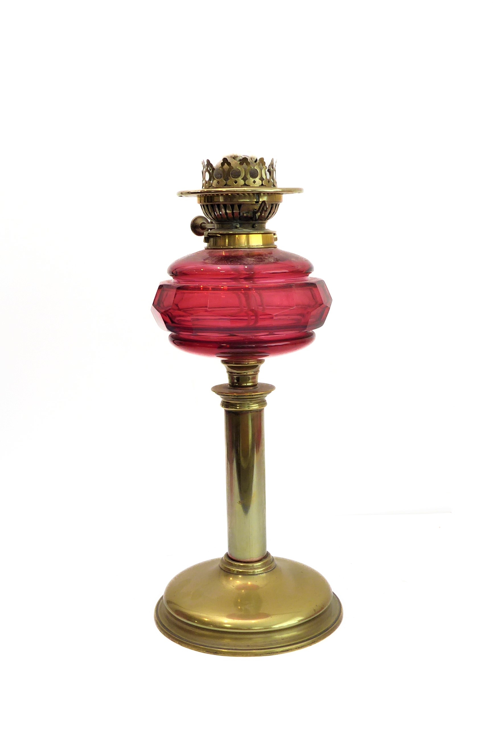 A 19th century brass and cranberry glass oil lamp: the large crimped shade above a faceted cranberry glass reservoir and brass base (55.5 cm high)