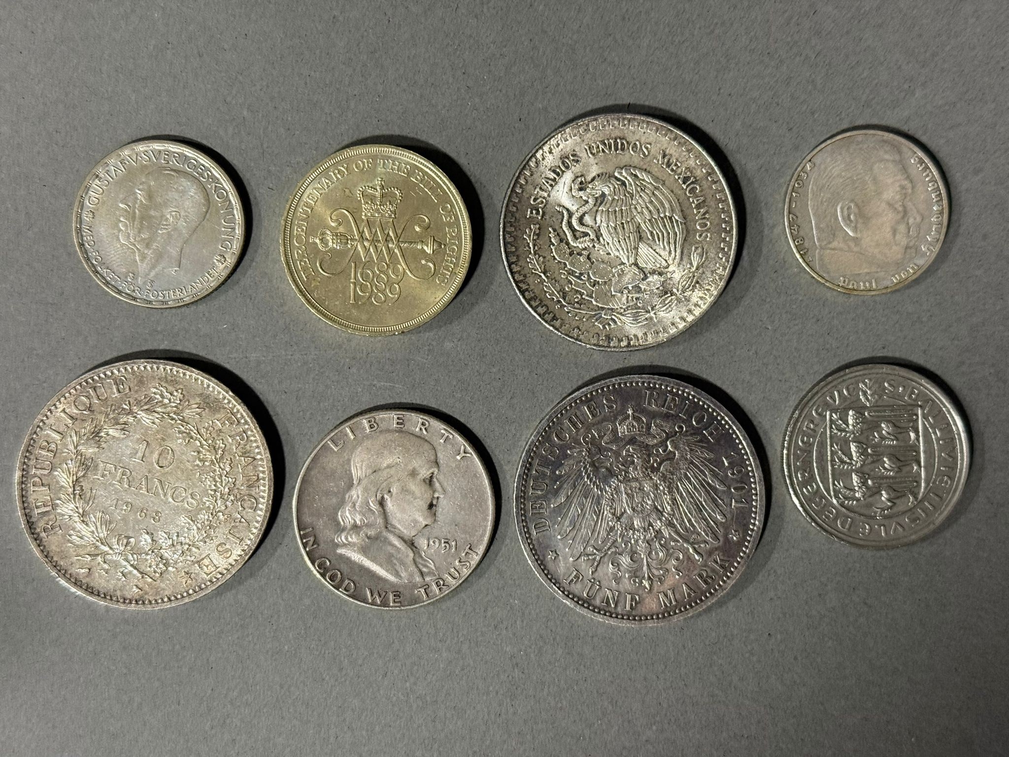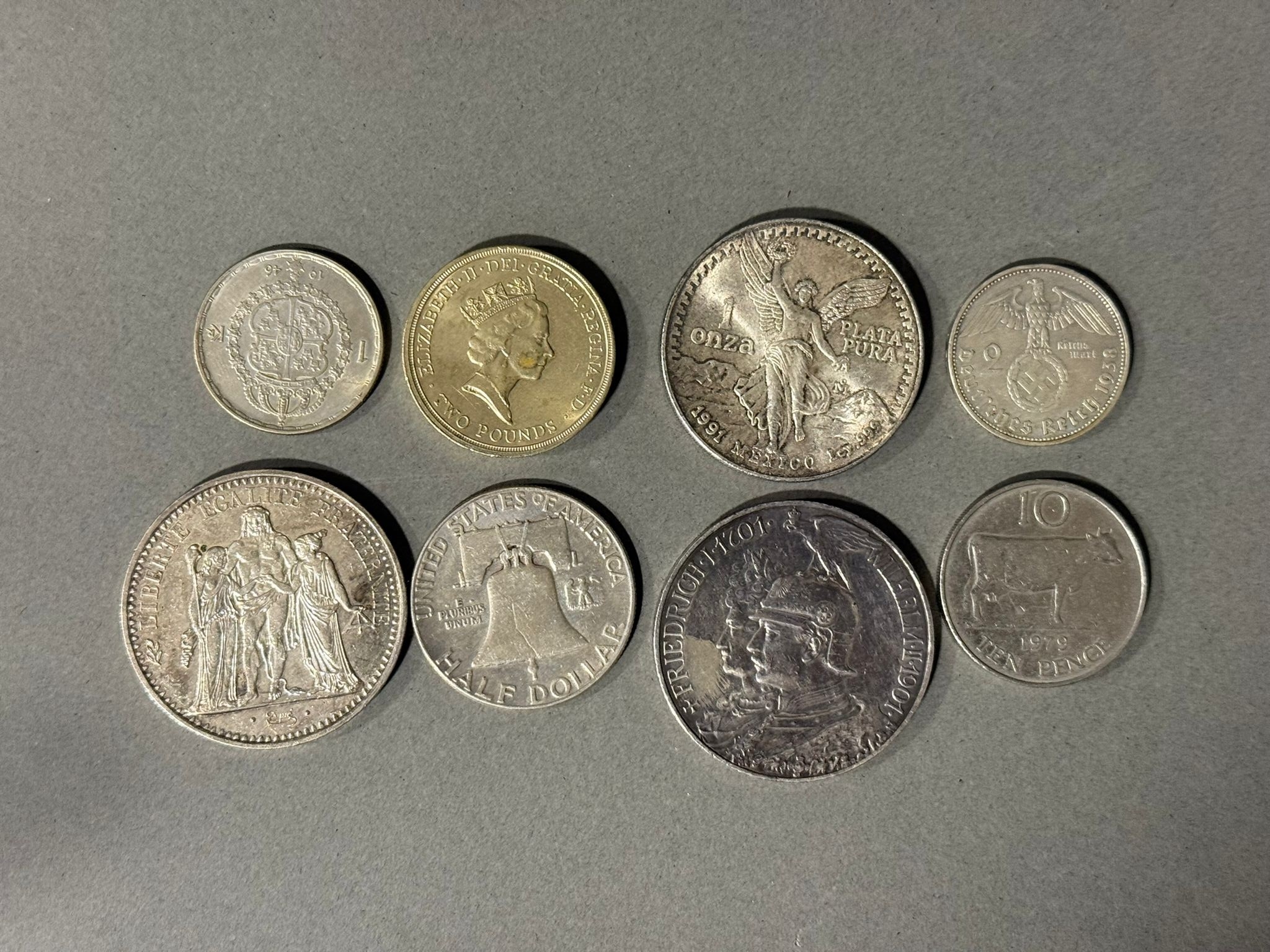 1989 Bill of Rights £2 coin, 1946 Swedish 1 Krona (silver), 1938 Germany 2 Reichsmark (A), 1951 American Half Dollar, 1901 Germany 5 Marks (VF), 1968 French 10 Francs, 1991 Mexico 1 Onza (31 grams) and other coin (8)