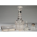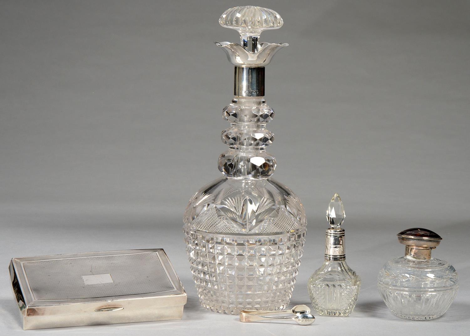 A GEORGE V SILVER MOUNTED CUT GLASS DECANTER AND STOPPER, 30CM H, BY WALKER & HALL, SHEFFIELD 1923, A SILVER CIGARETTE BOX AND TWO SILVER MOUNTED CUT GLASS SCENT BOTTLES (5)