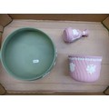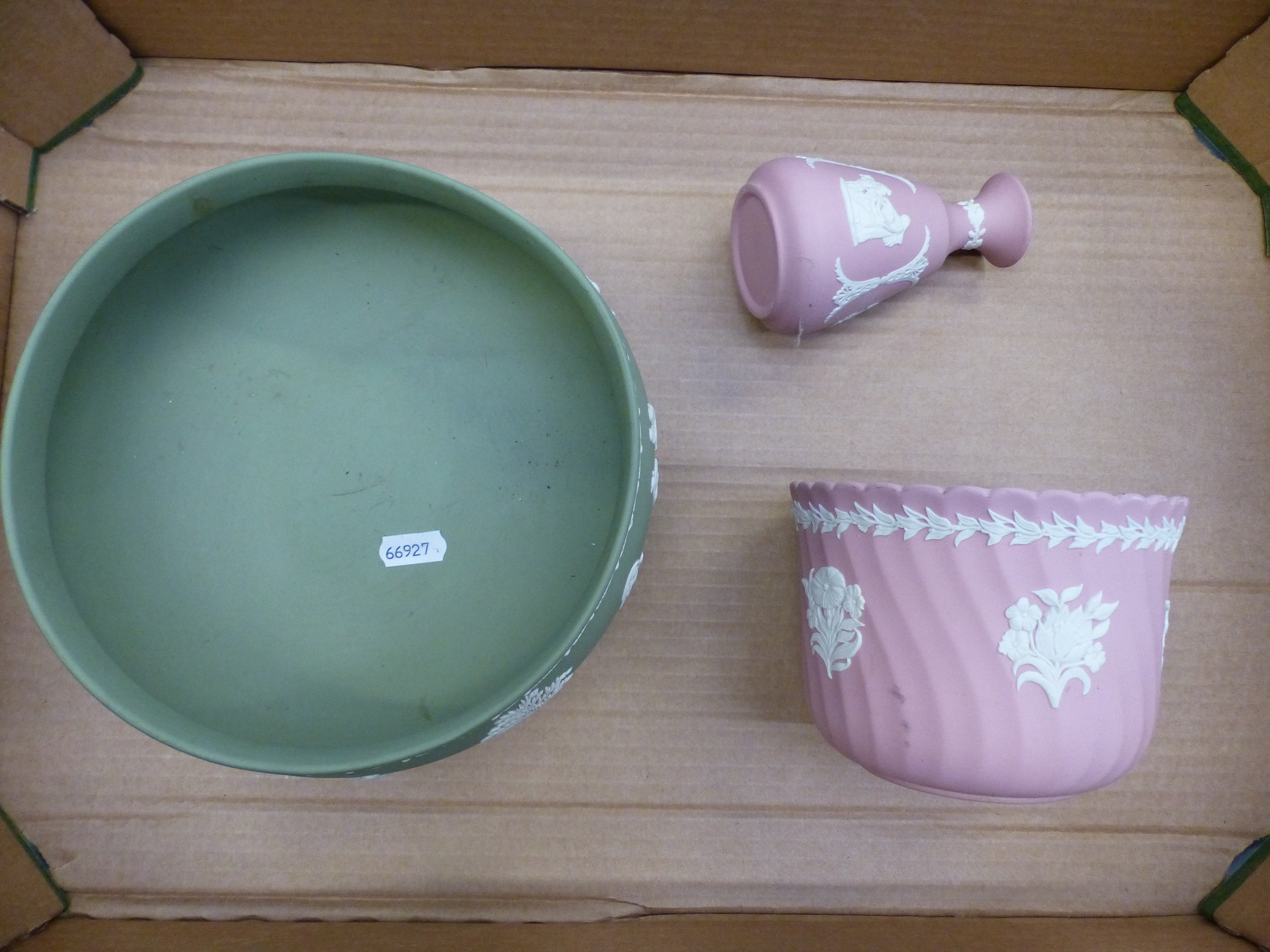 Wedgwood sage green jasper ware pedestal fruit bowl together with a pink small planter and vase (3).