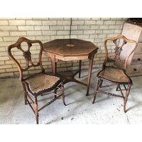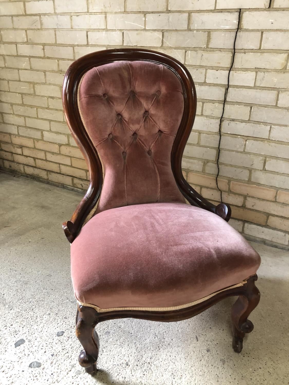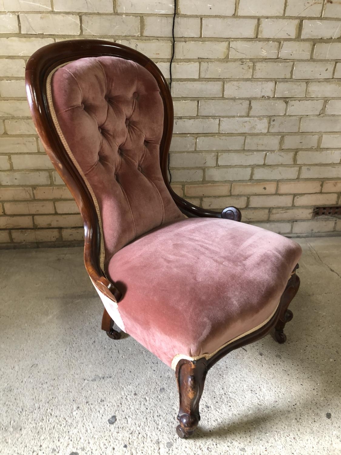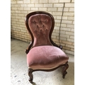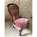 A Victorian bedroom chair with a buttoned back and pink upholstery