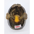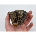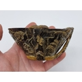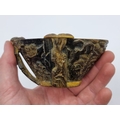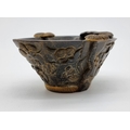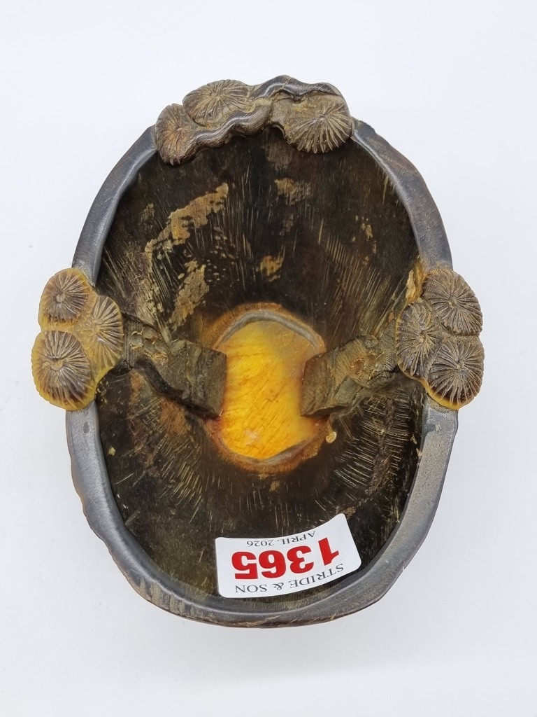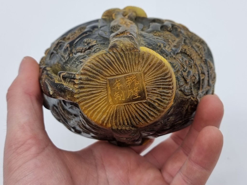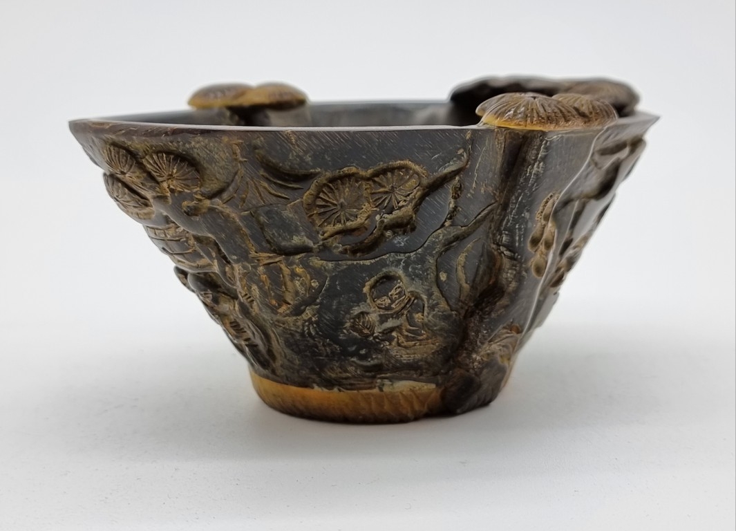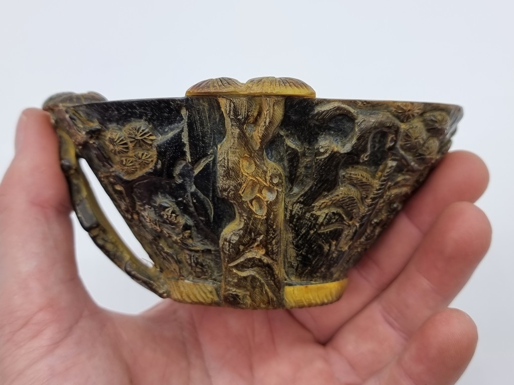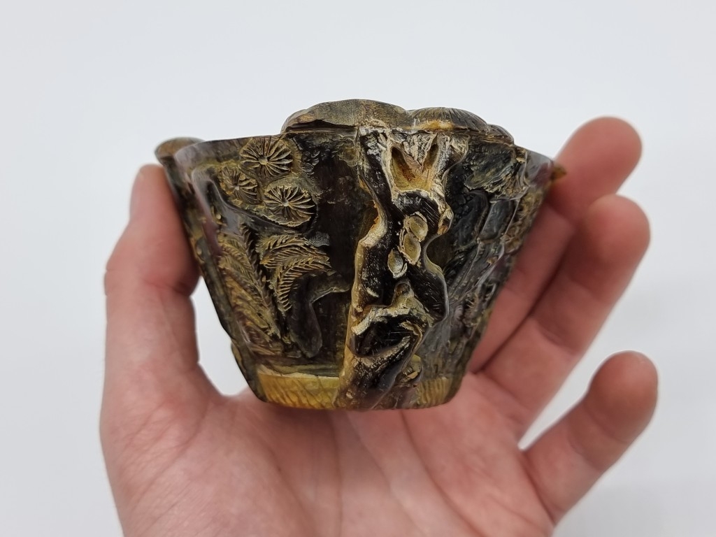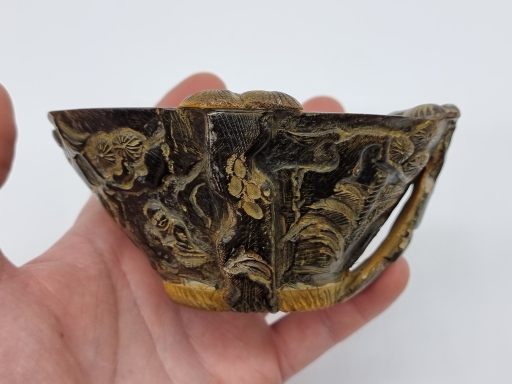 A Chinese carved horn libation cup, four character seal mark to base, 12.5cm wide.