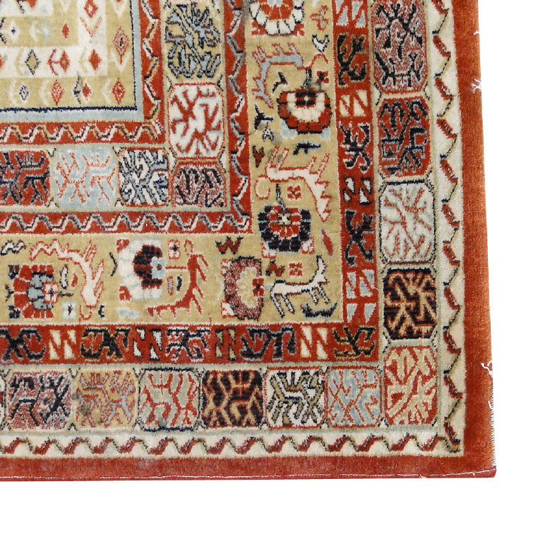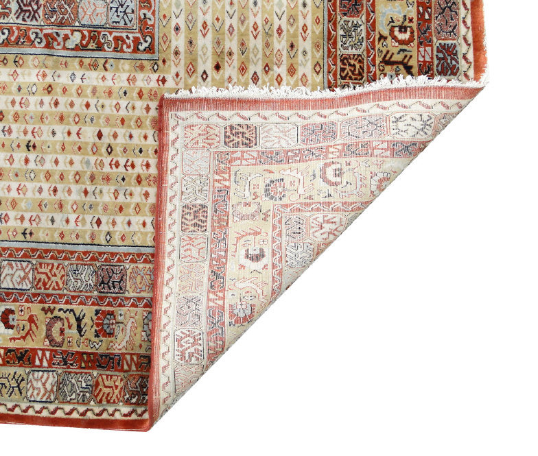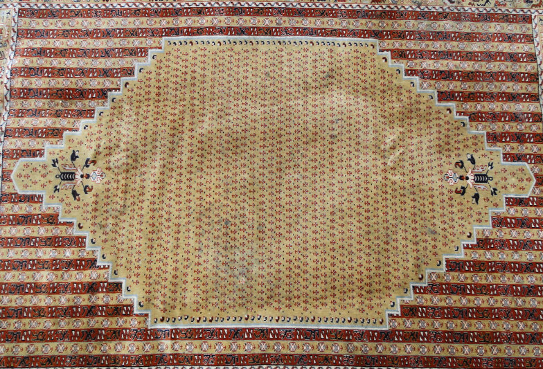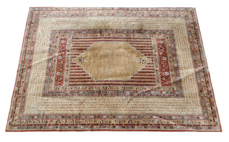 Persian carpet decorated with a central diamond shaped brown field onto a striped and floral decorated border, 390cm x 300cm
