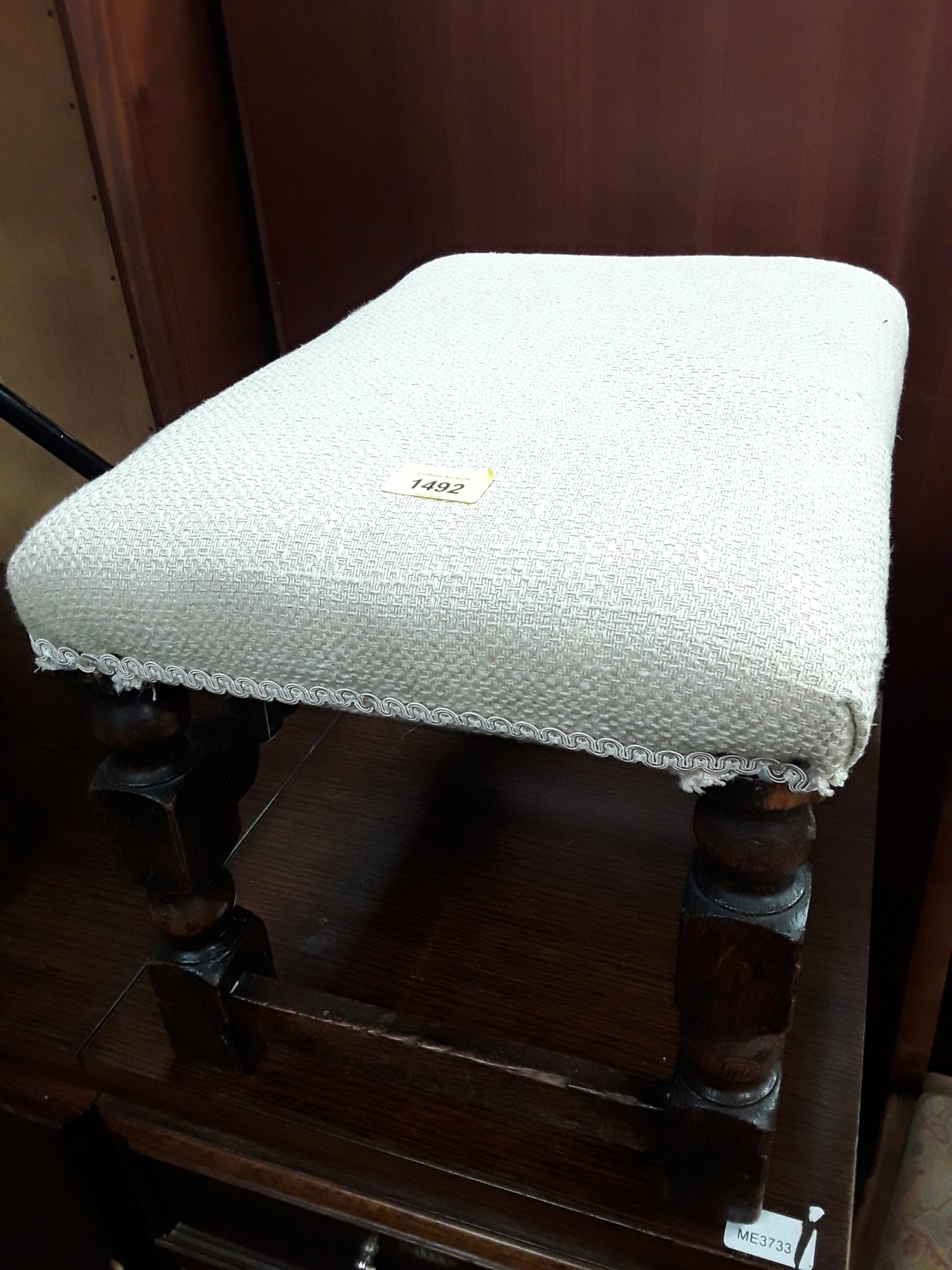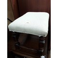 A vintage oak footstool upholstered in a modern material.