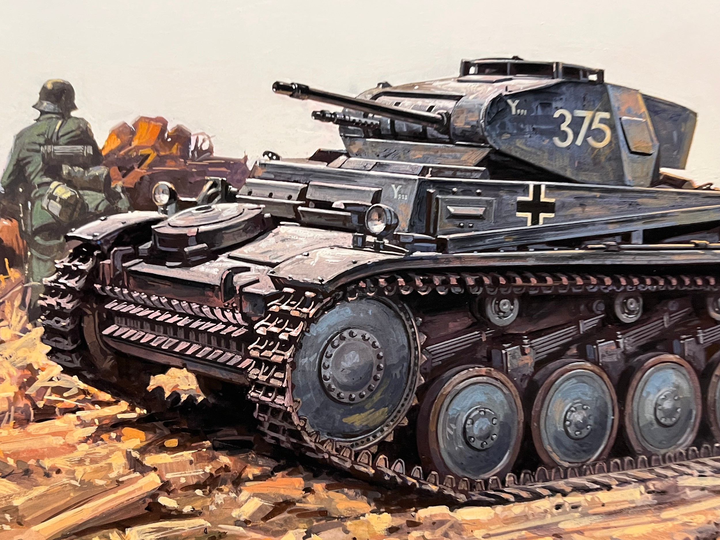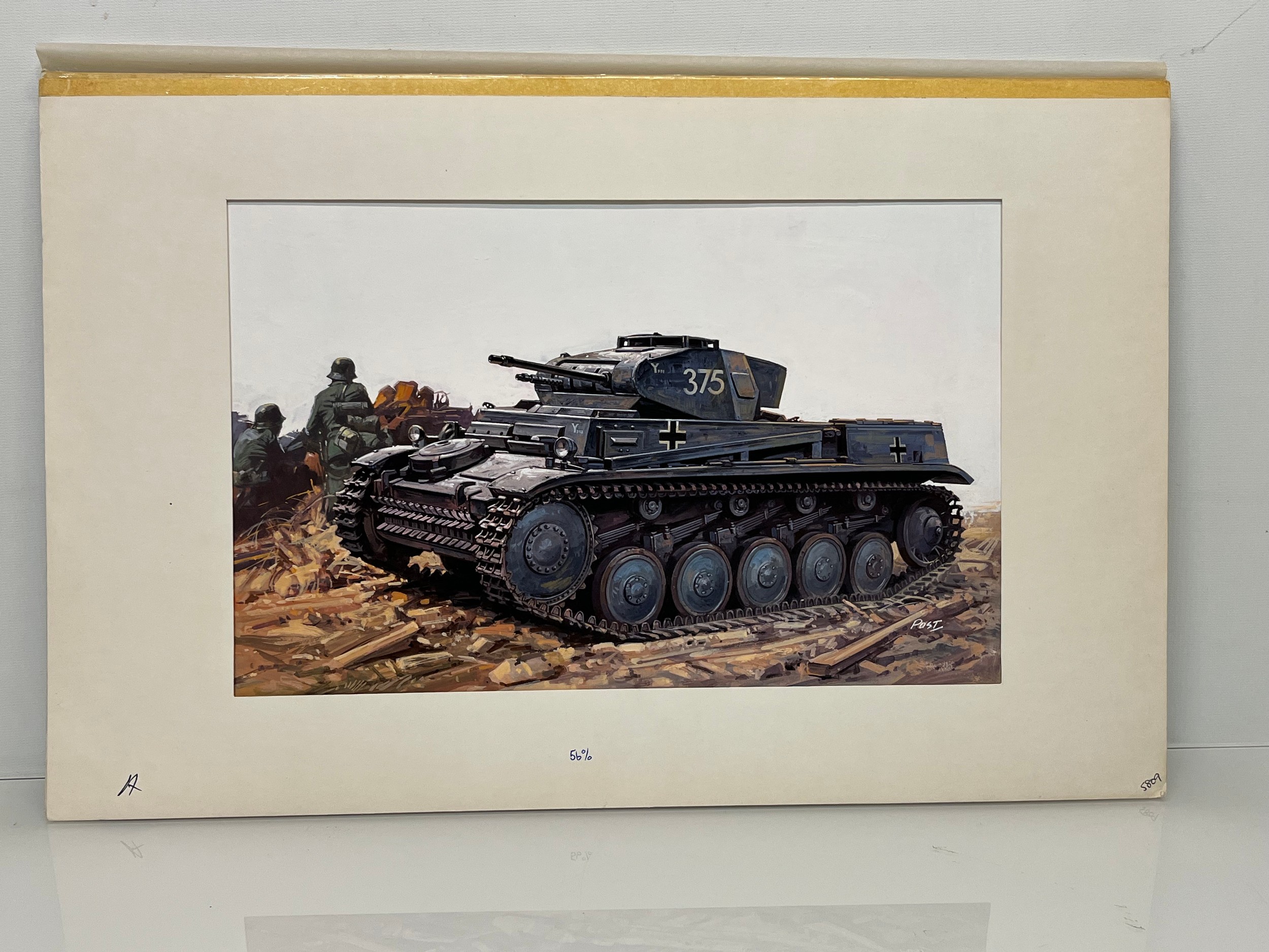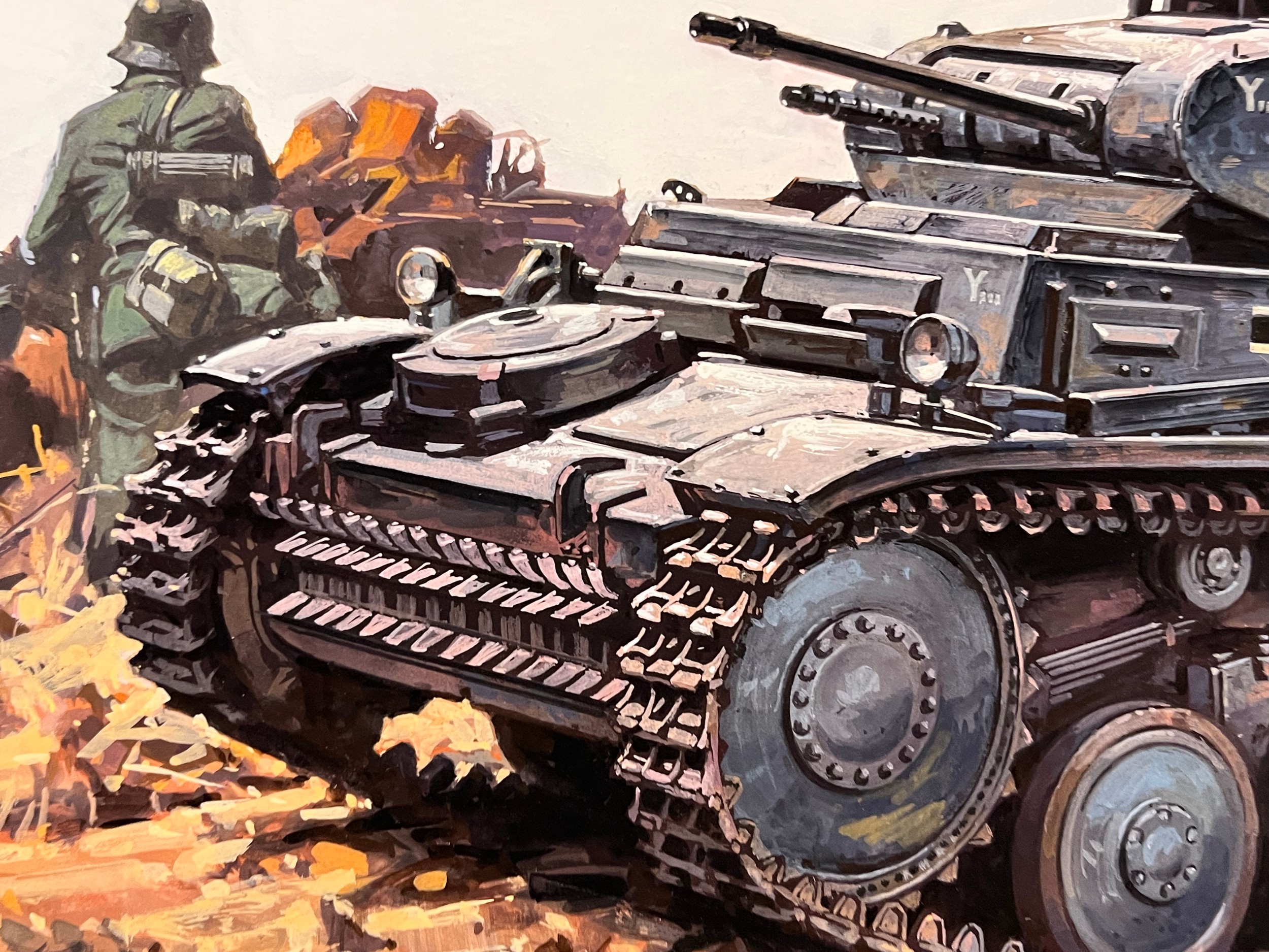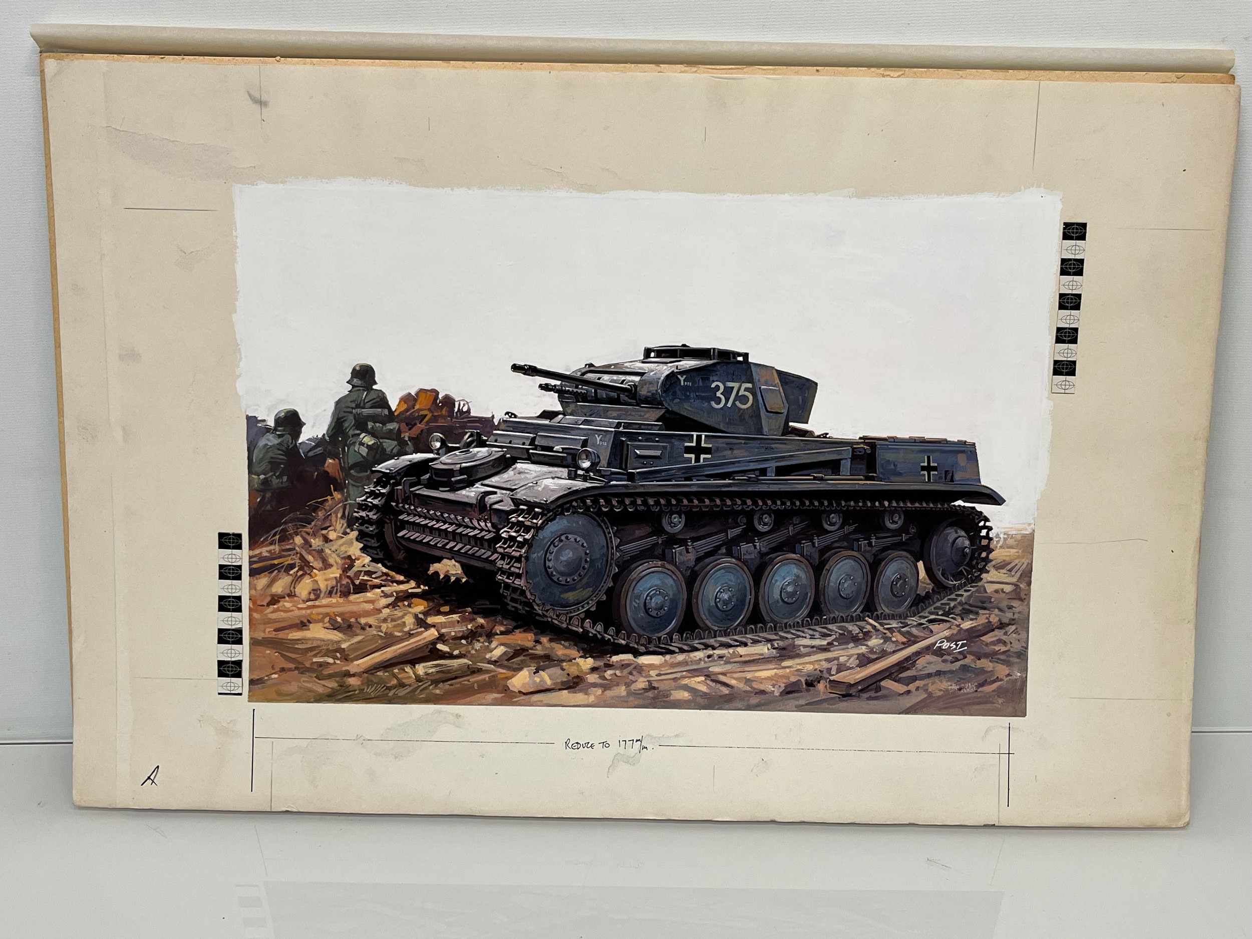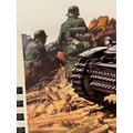 Military Art, original packaging,Matchbox model kit original artwork, German Panzer Tank, a painting for the box cover artwork show in a battle field setting. Board size 54.5 cm x 35.5 cm.