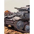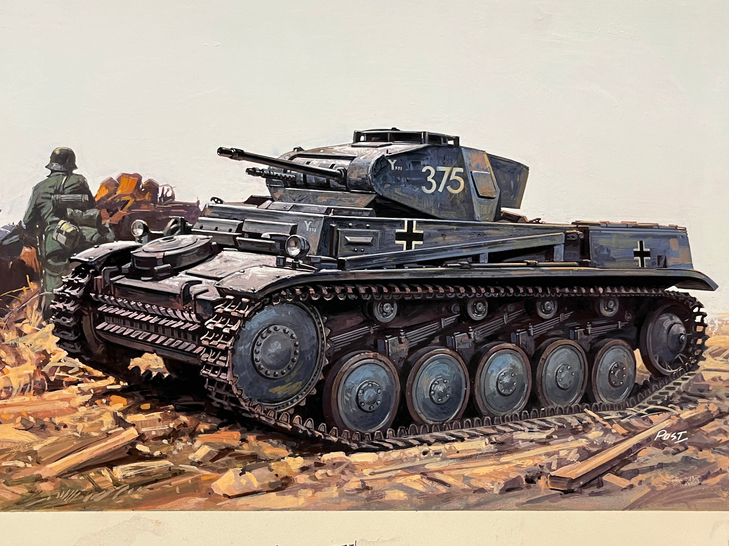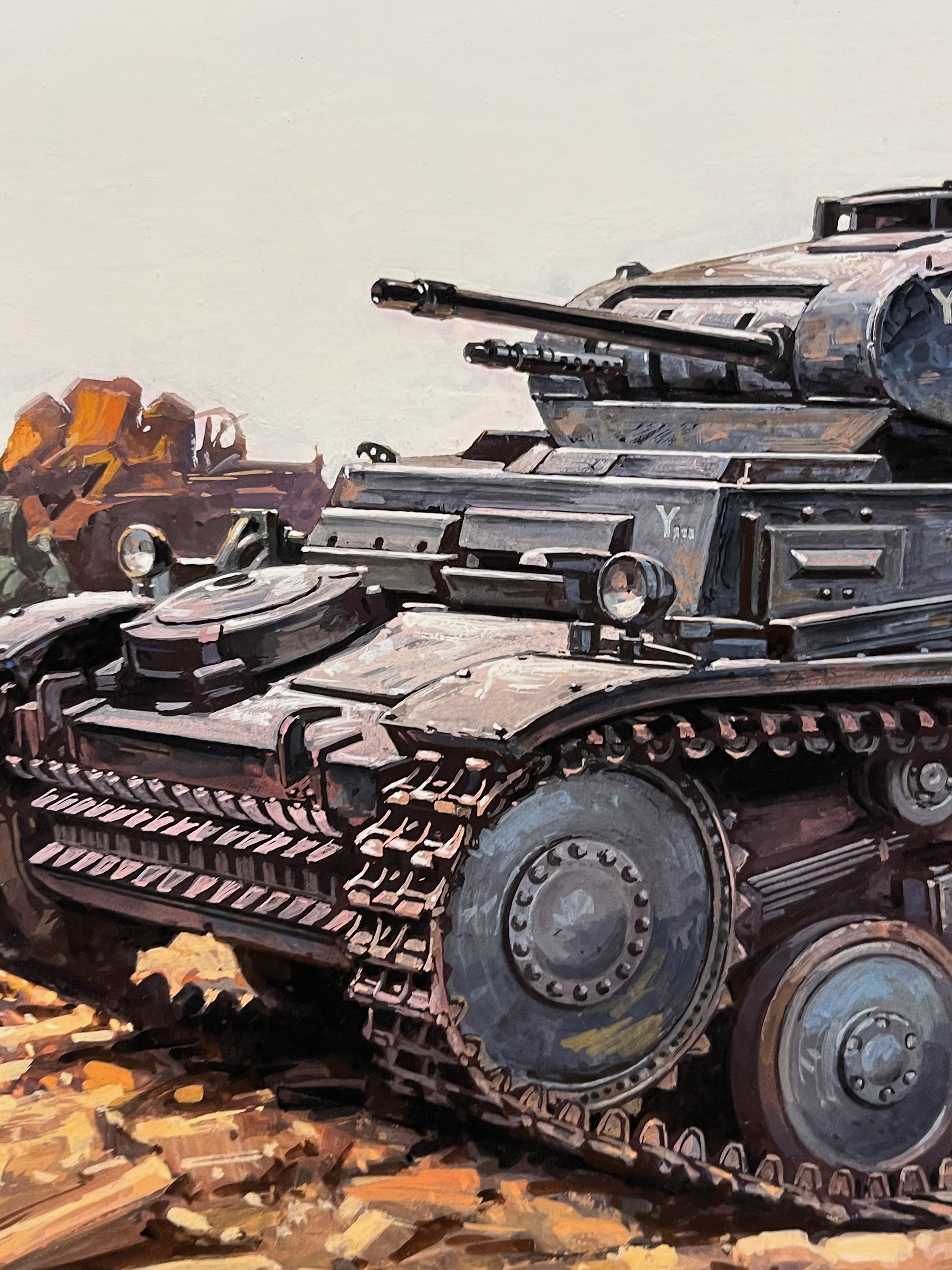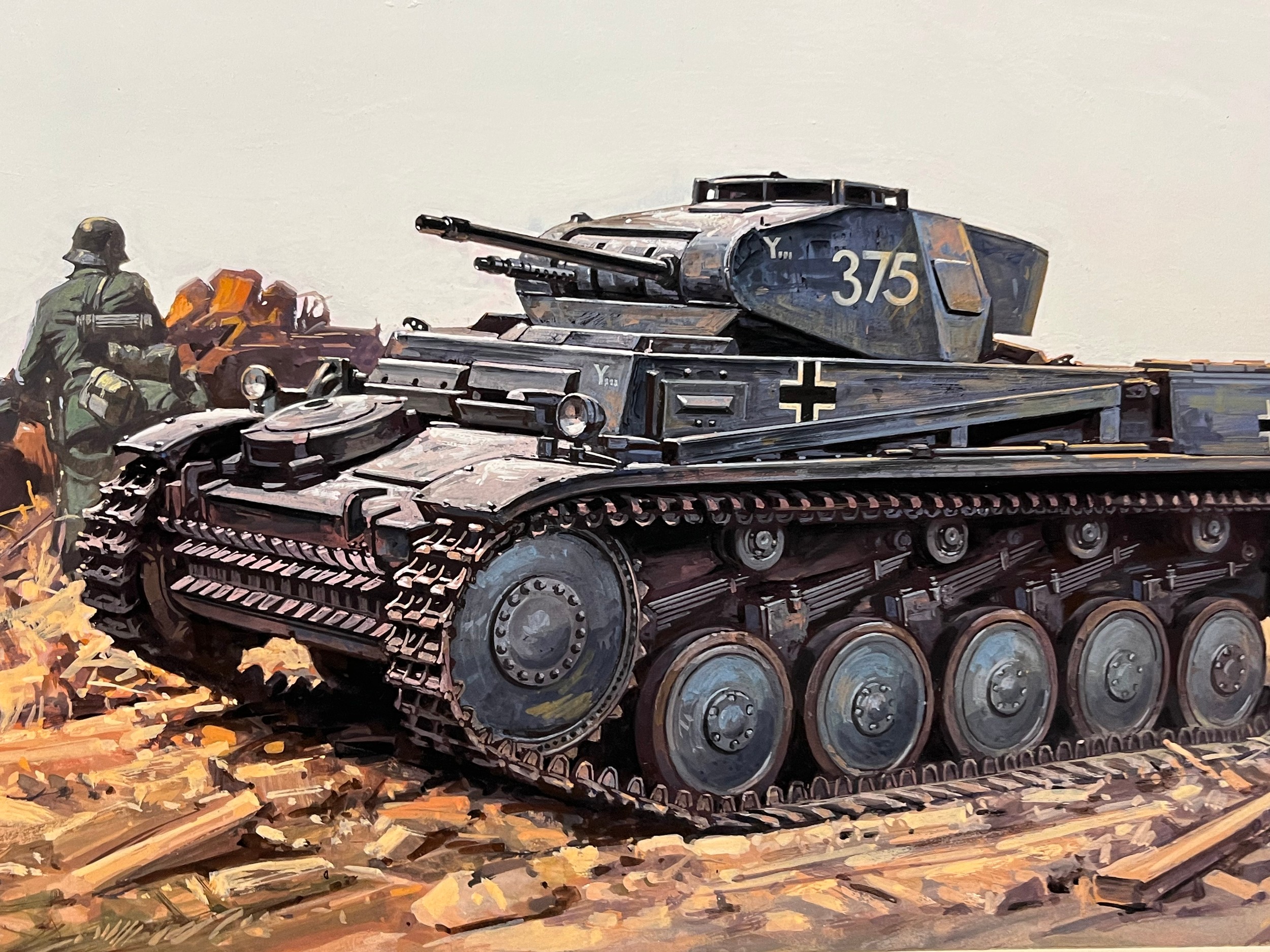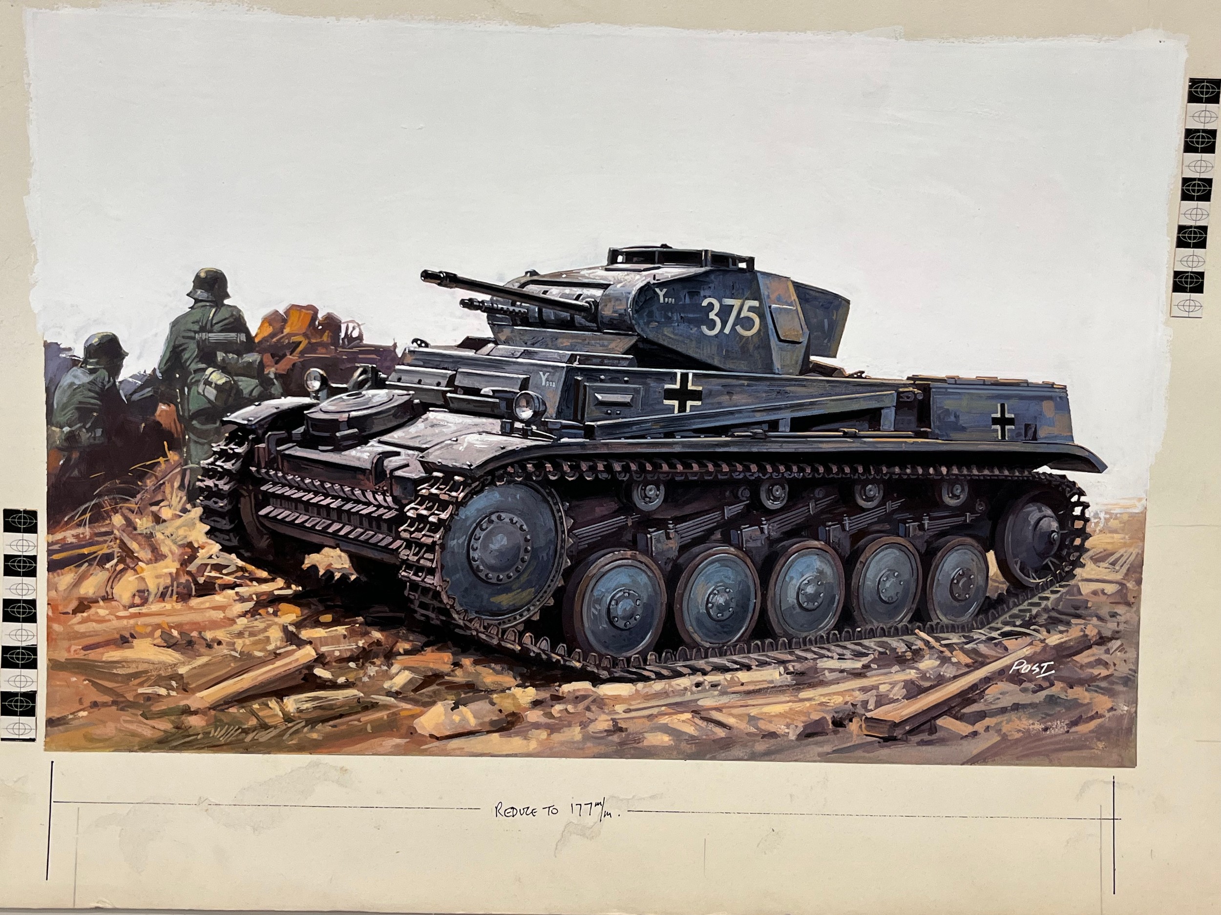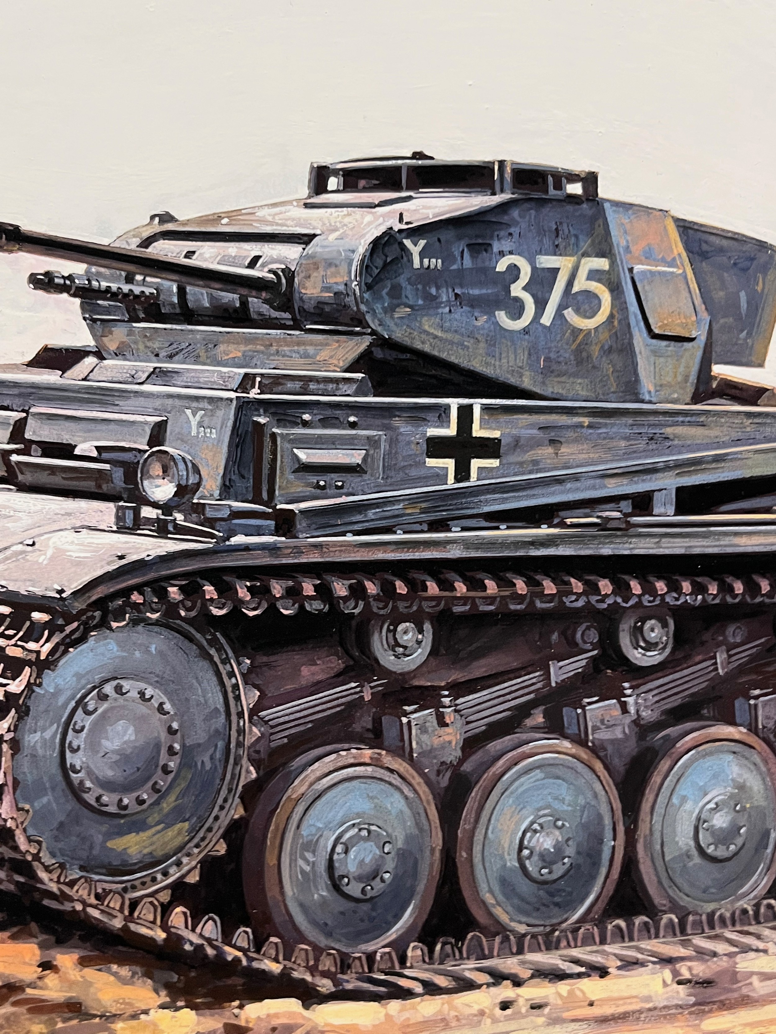 Military Art, original packaging,Matchbox model kit original artwork, German Panzer Tank, a painting for the box cover artwork show in a battle field setting. Board size 54.5 cm x 35.5 cm.