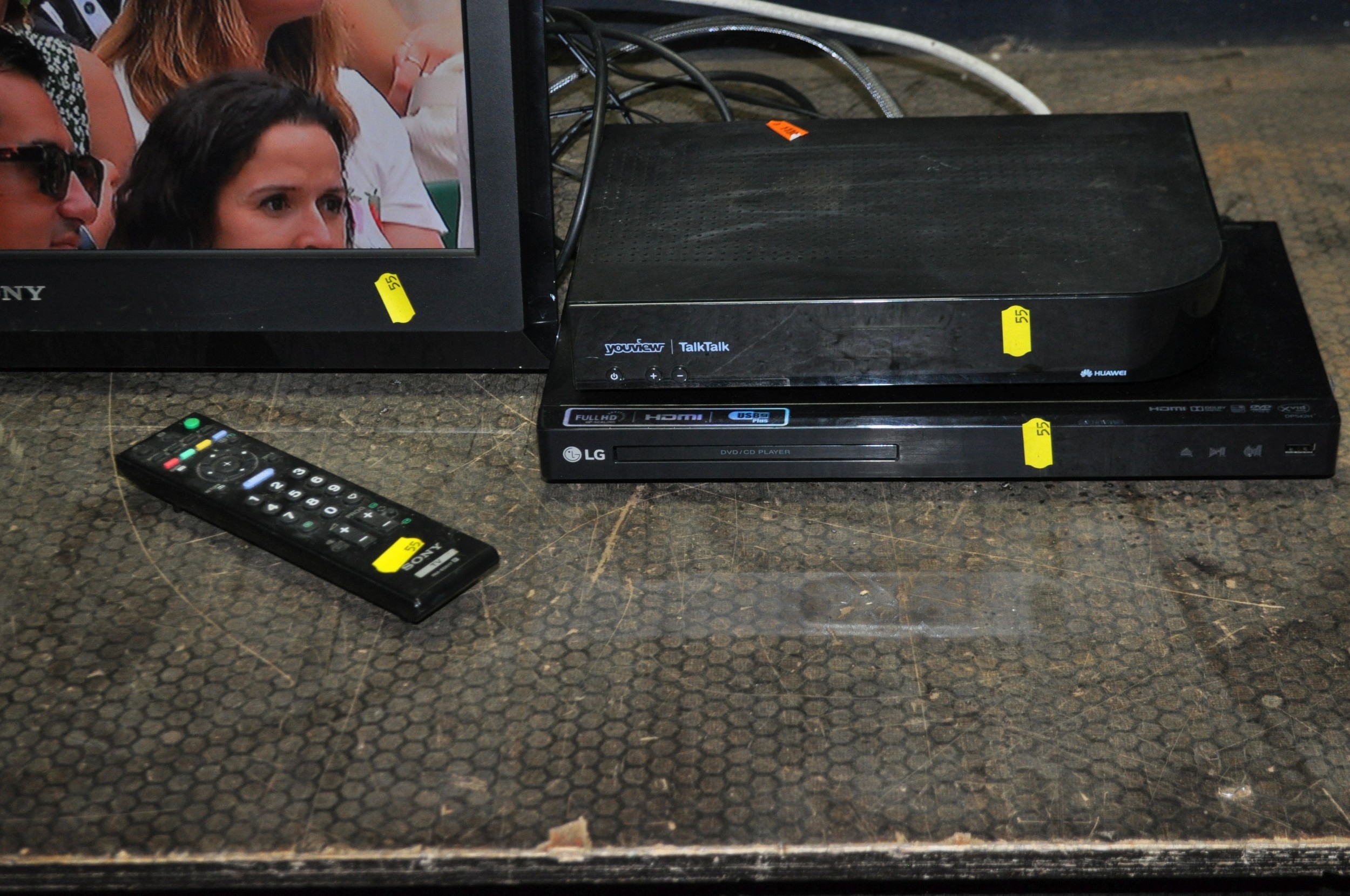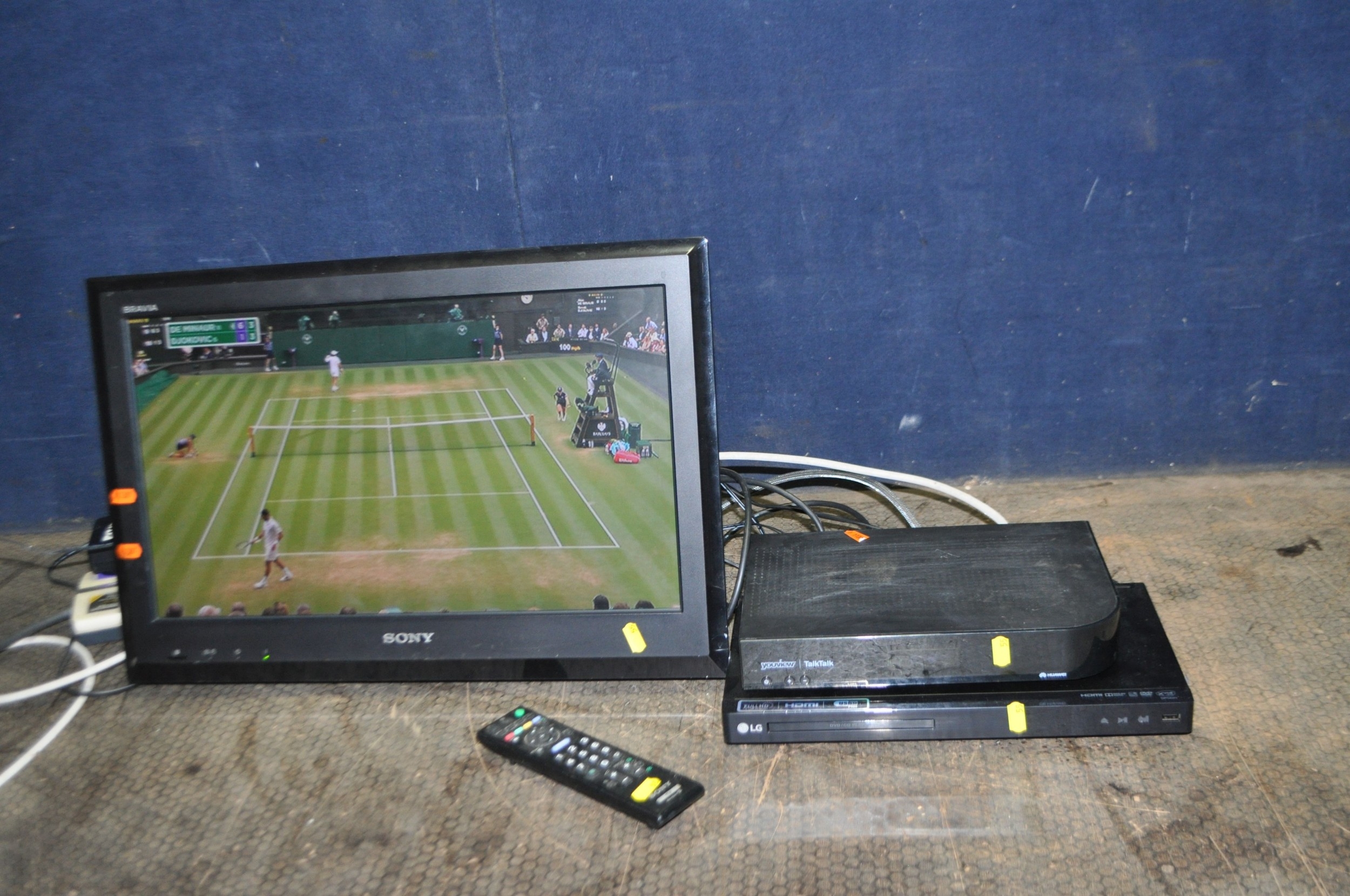 A SONY KDL 22S5500 22in TV with remote, wall bracket but no stand, a LG DVD player and a Huawei Freeview box (both without remotes)(all PAT pass and working) (4)