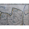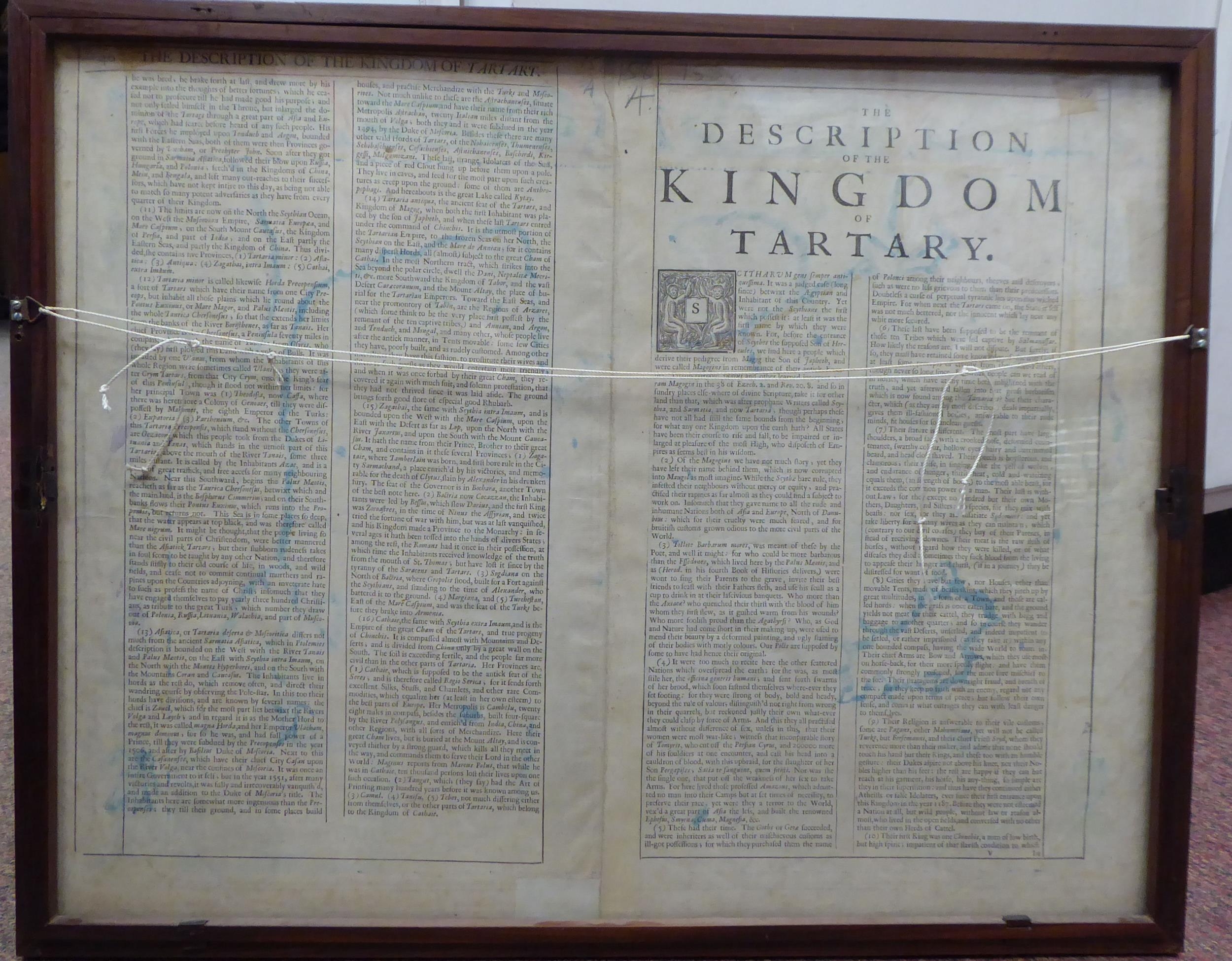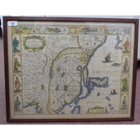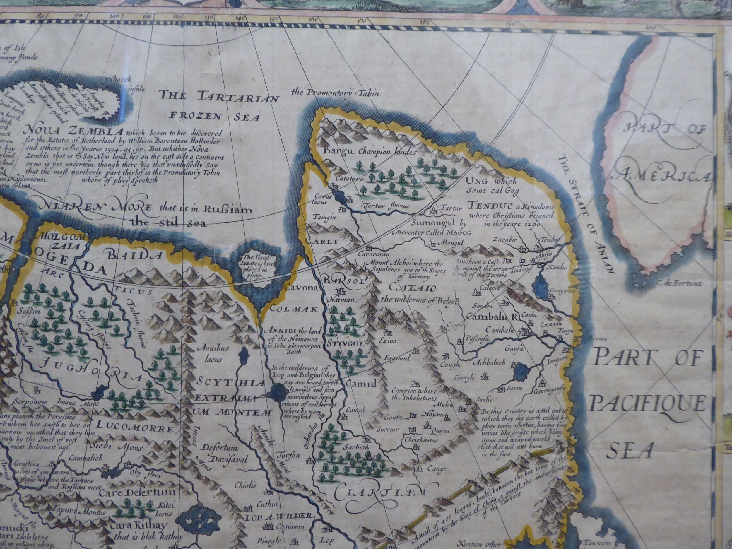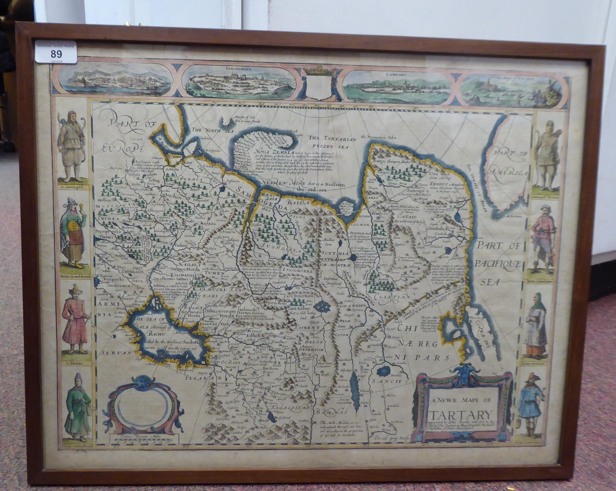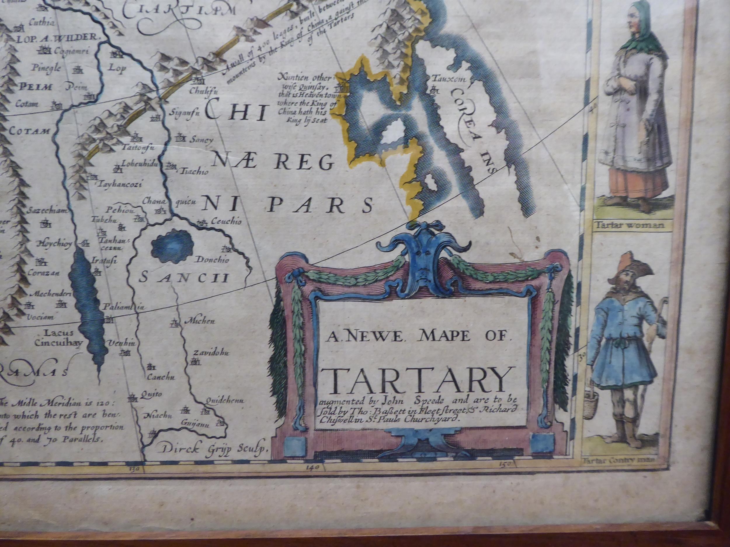 A John Speede coloured map 'A Newe Mape of Tartary' with views of Samarchand, Cambalu and Tartar; women and gentlemen in the margins with printed text verso 16.5" x 21" framed