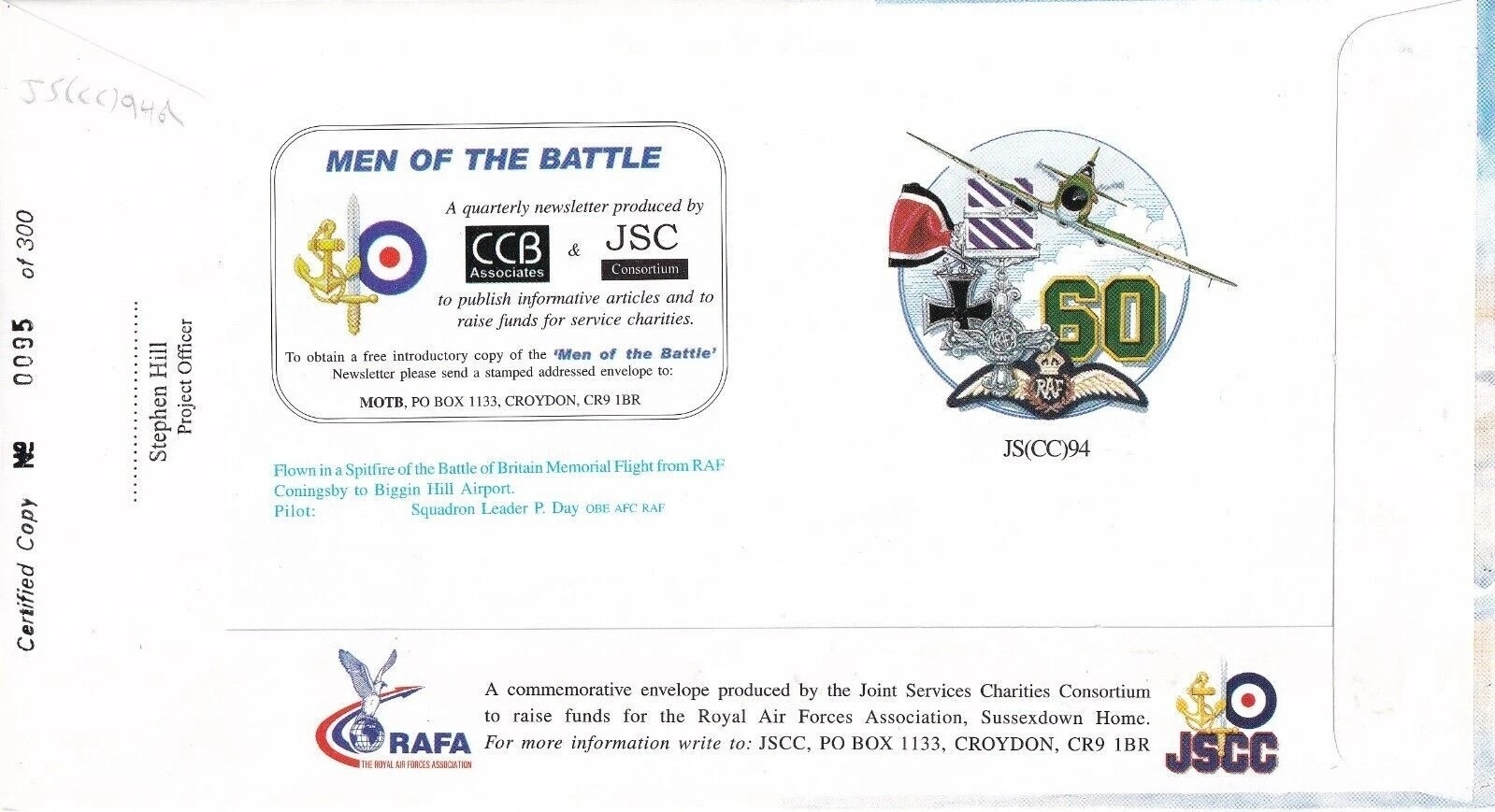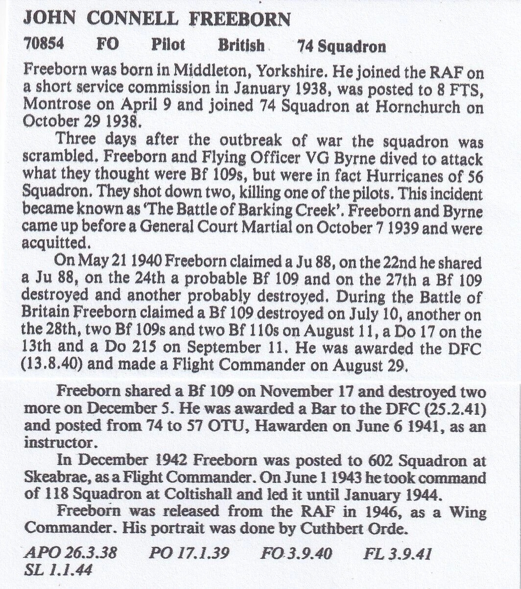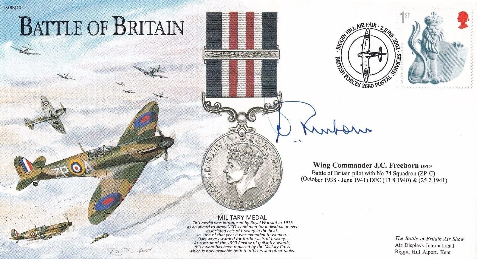 JS(CC)94 Battle of Britain Signed J. C. Freeborn Battle of Britain Pilot with 74 Sqn. 15th Sept 2000 BFPS 2680 Biggin Hill Air Fair Special Postmark Battle of Britain, Military Medal Cover. Blue flown cachet on the back Flown in Spitfire. Personally Signed Wg Cdr J. C. Freeborn Battle of Britain Pilot with 74 Sqn. Details enclosed taken from Men of the Battle of Britain by K Wynn Certified Copy No 0095 of 300. Single Vendor RAF cover collection. Good condition. All autographs come with a Certificate of Authenticity. We combine postage on multiple winning lots and can ship worldwide. UK postage from £5.99, EU from £7.99, Rest of World from £9.99