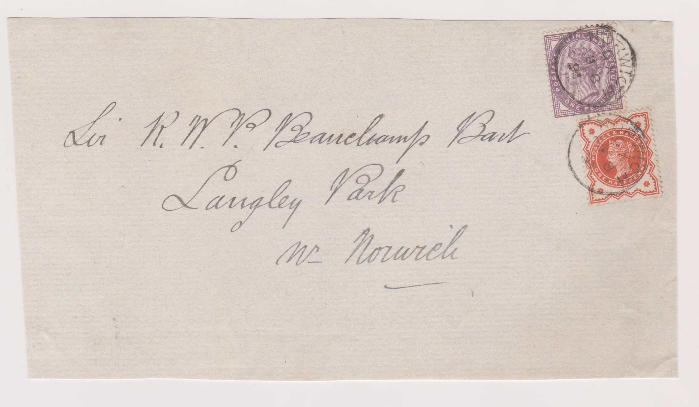 Great Britain 1891-Wrapper piece posted to Langley Park cancelled 8.8.1891 Norwich