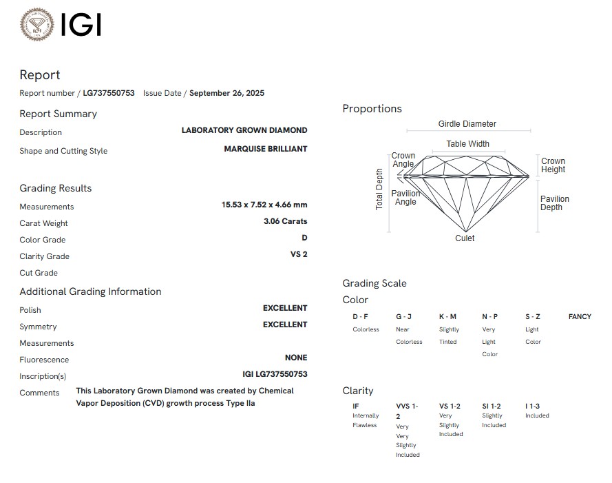 A 3.06ct Marquise Cut Lab-Grown Diamond. Colour D, clarity VS2. IGI certified. Cert no: LG737550753. Measurements: 15.53 x 7.52 x 4.66 mm.