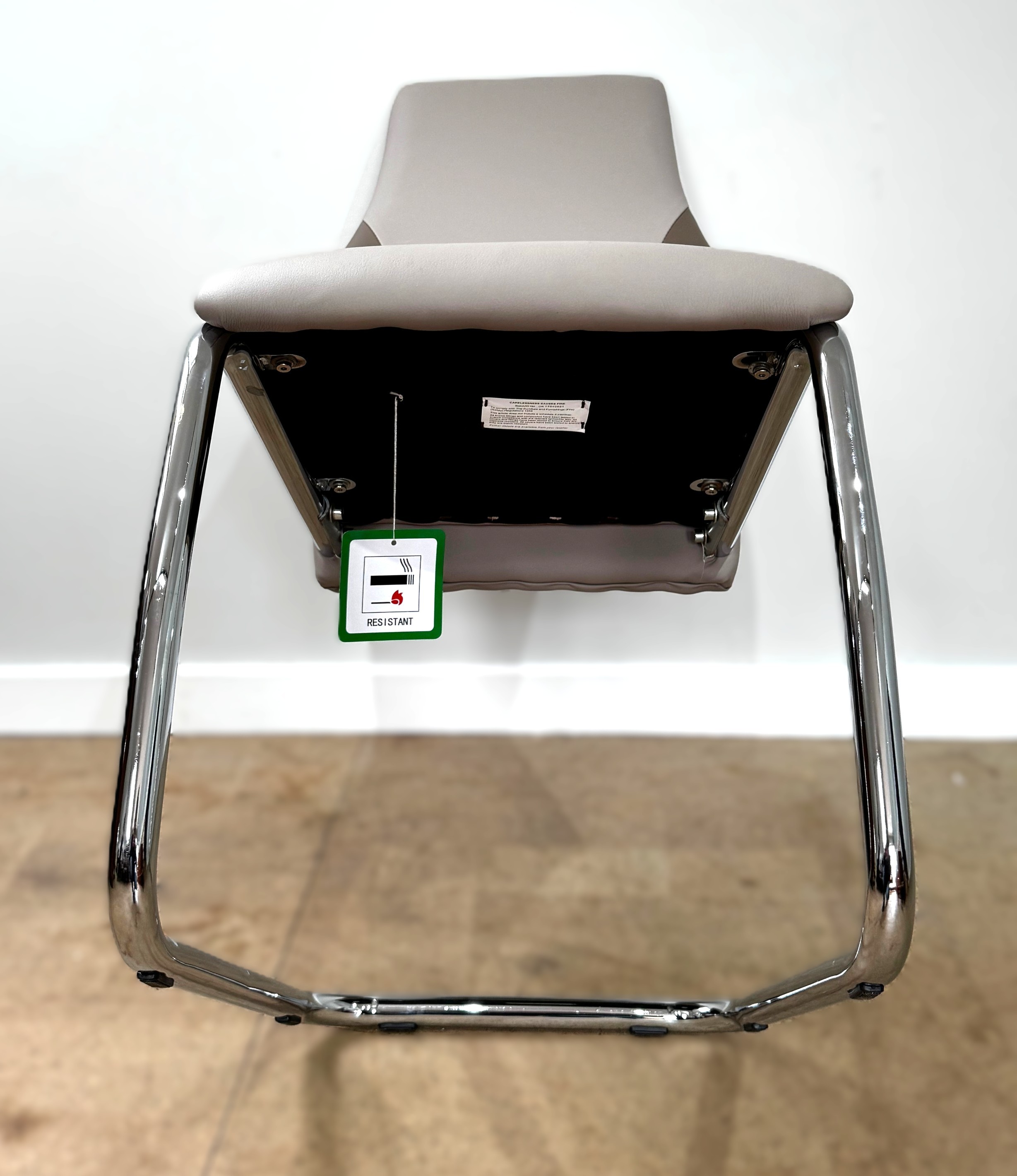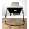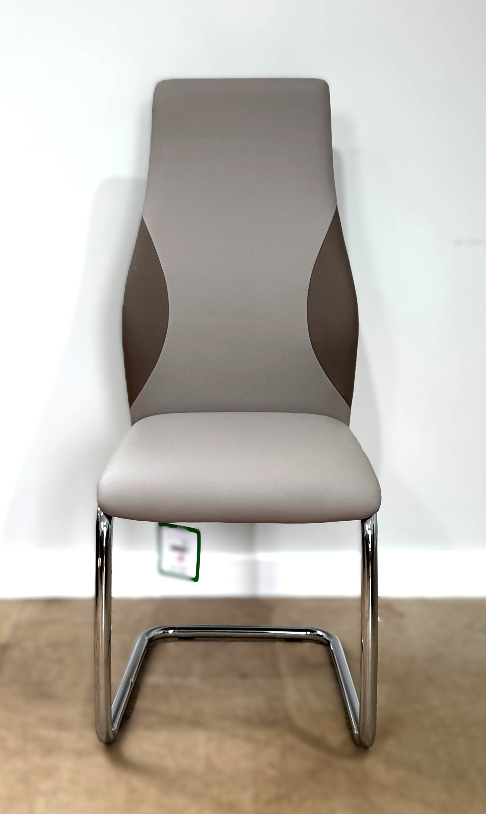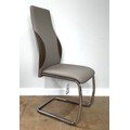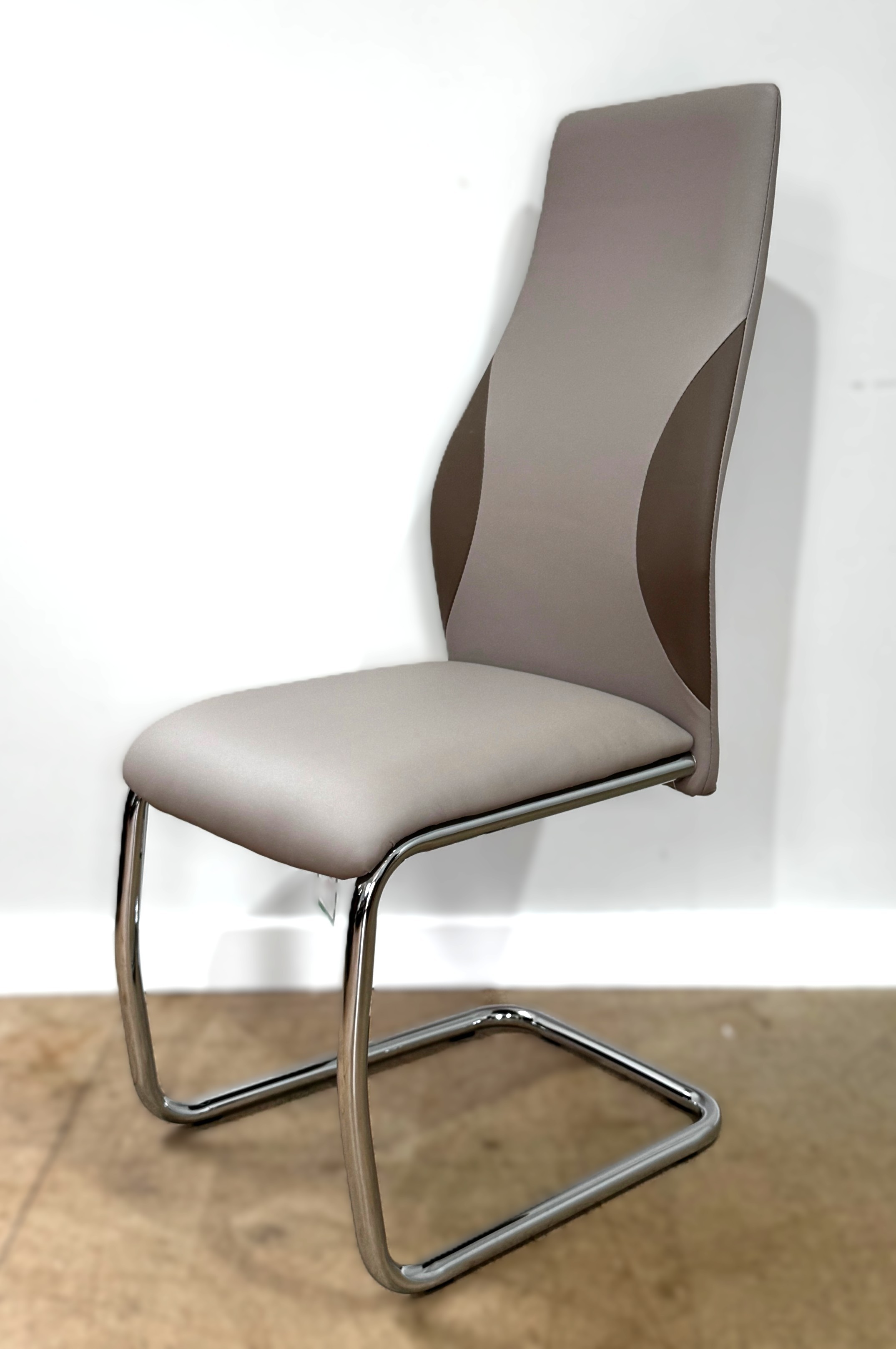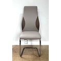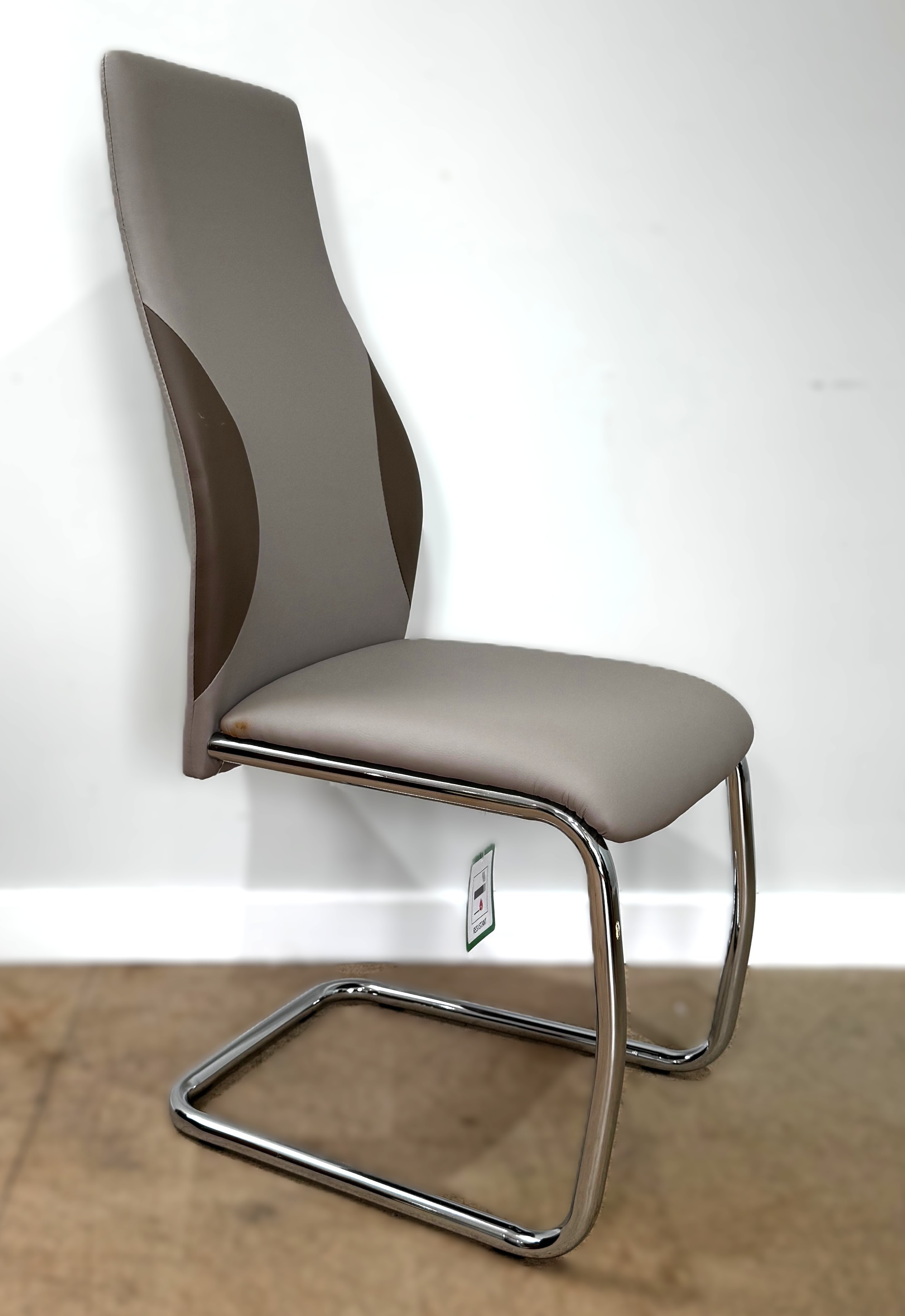 A contemporary cantilever dining chair in faux leather upholstery; also a dining chair with cream fabric (97cm high) and a footstool (48cm high) (3)