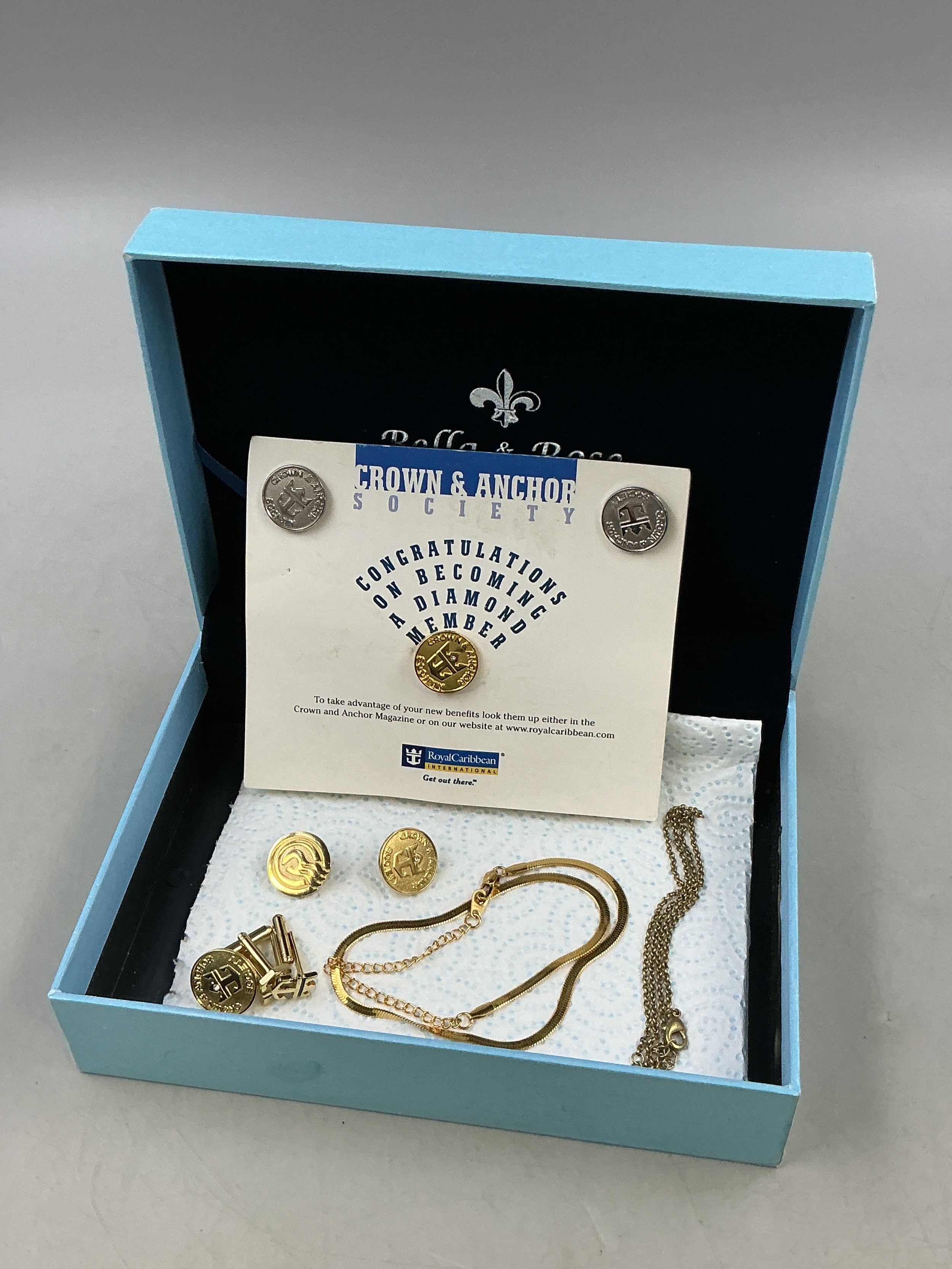 Six Cruise Related Crown & Anchor Pin Badges and A Pair of Cufflinks, Two Necklace Chains (One 18ct Gold Plated) - Includes Royal Caribbean Diamond Member, And Princess Captain's Circle