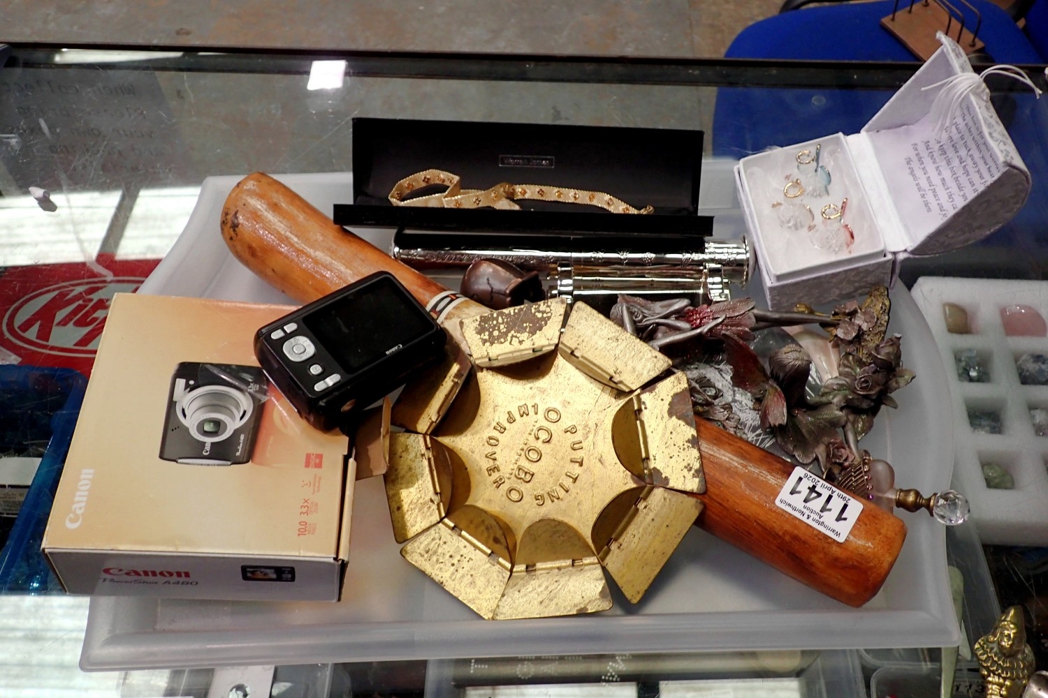 Tray of mixed collectables to include figurines and Cannon camera. Not available for in-house P&P