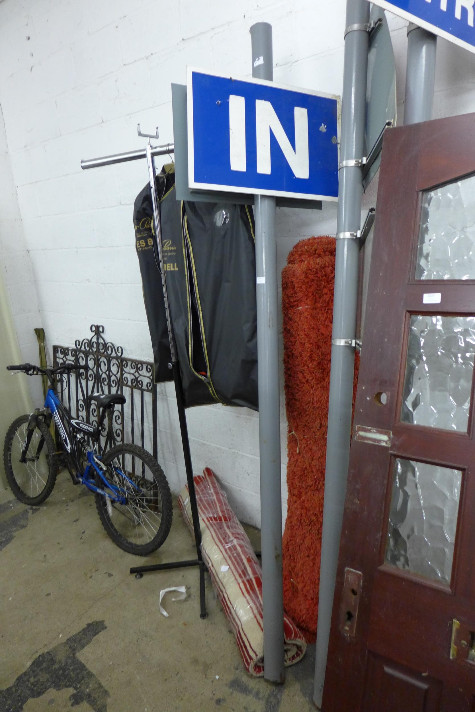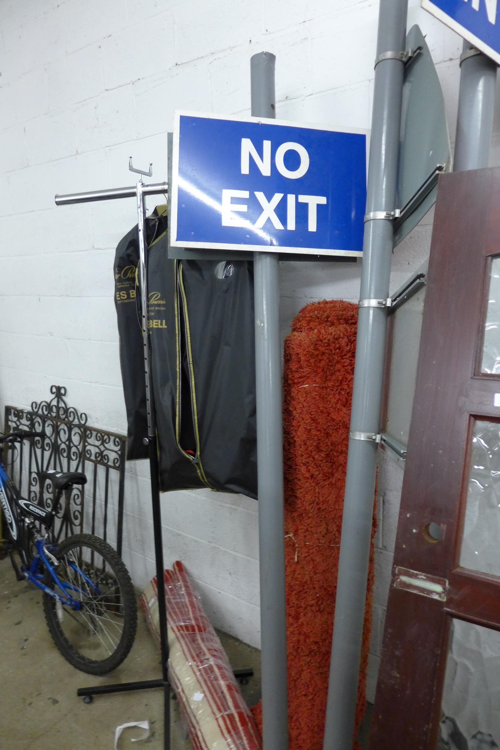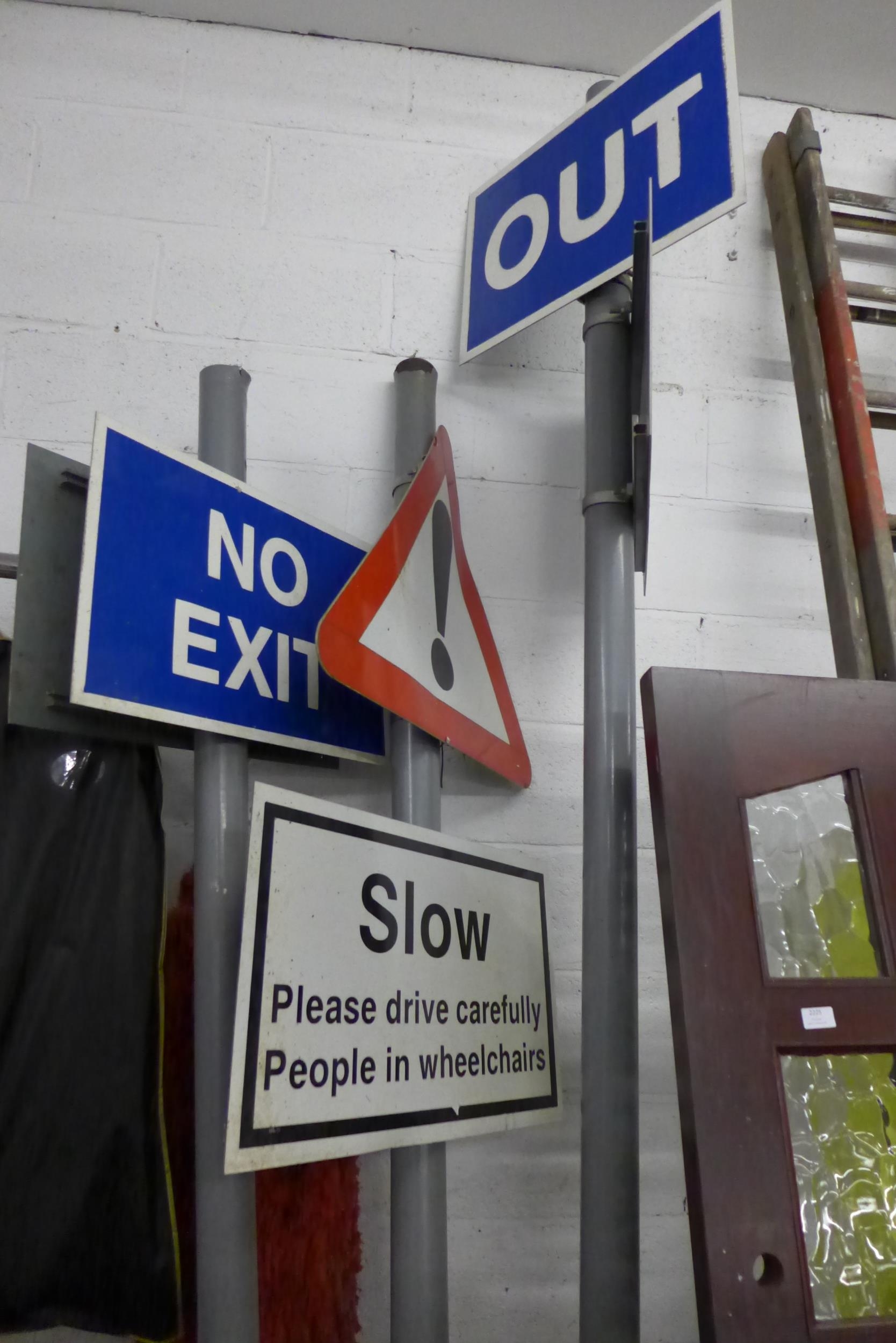 In, Out, No Exit, No Entry signs, Disabled Access and ! signs on 10ft poles
