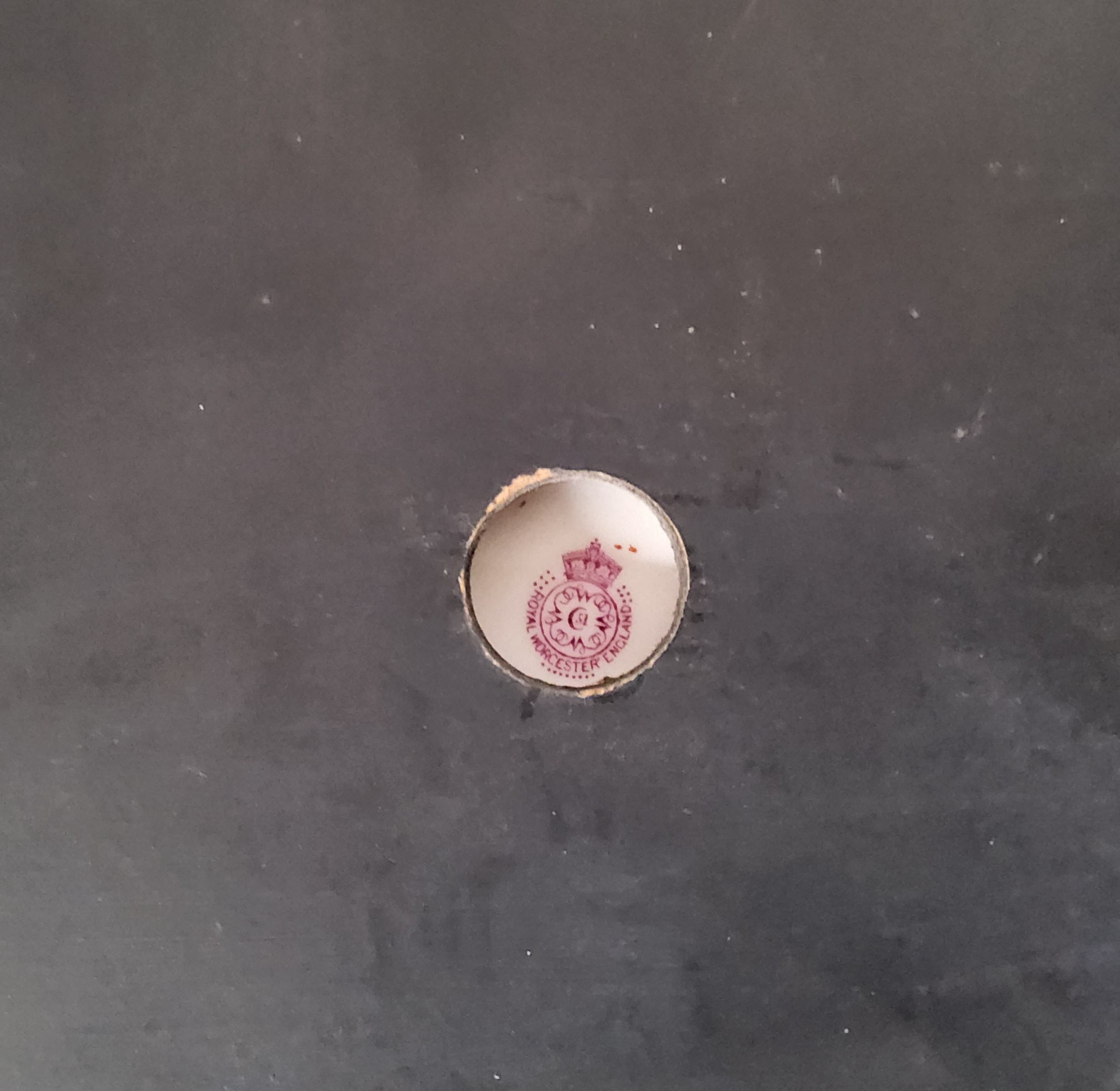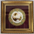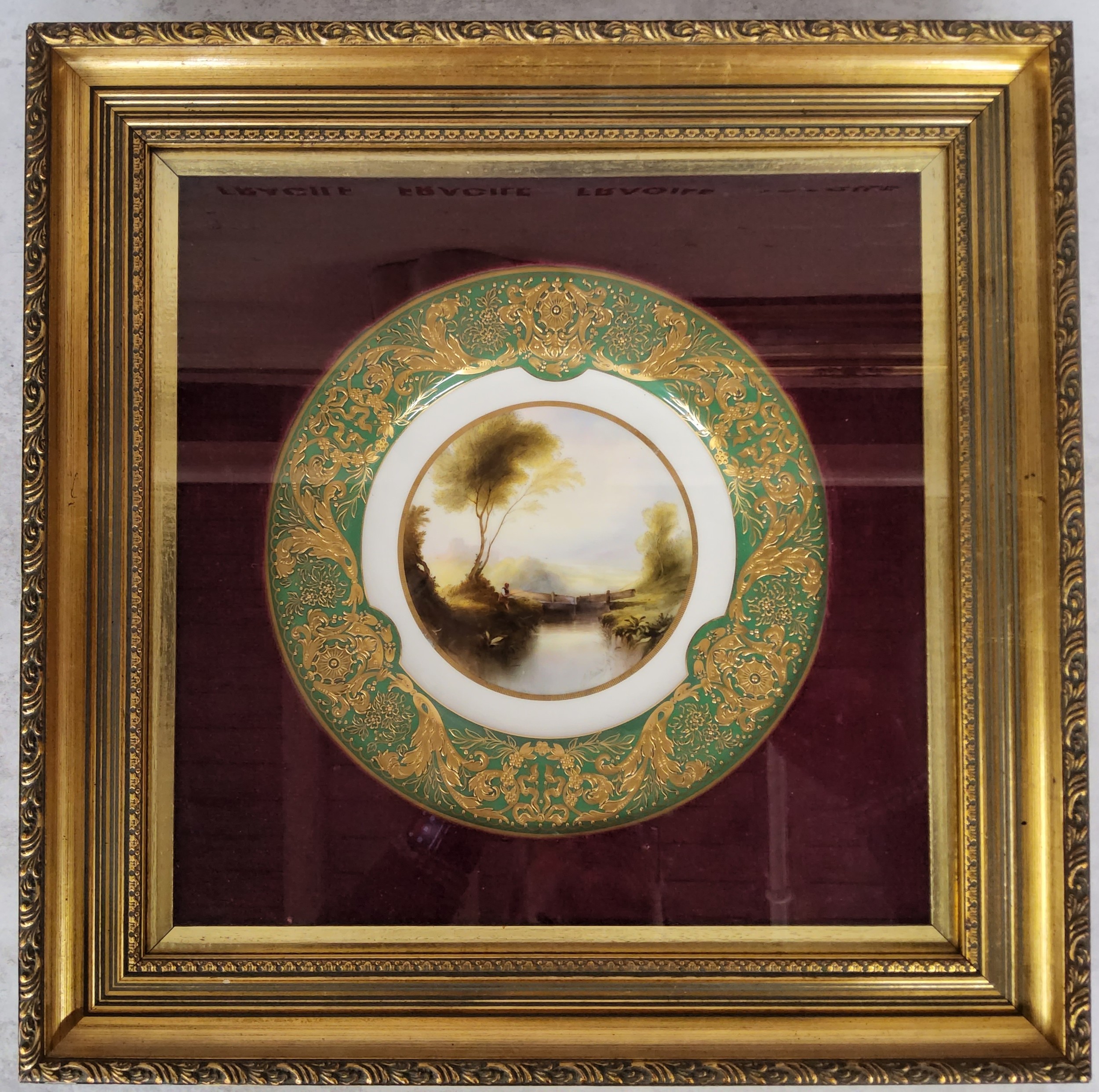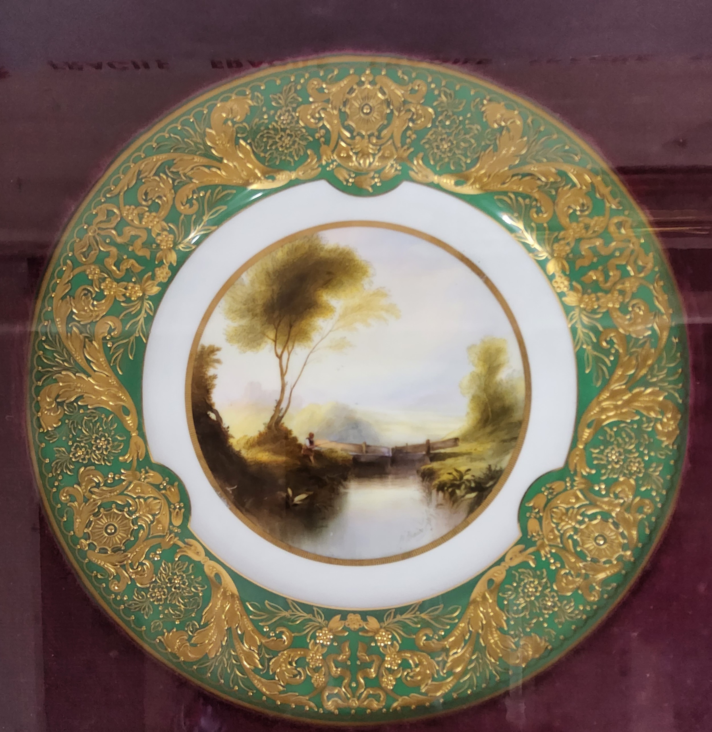 A Victorian Royal Worcester circular plate painted by Harry Davis, signed, Fishing by the Bridge, the green border decorated with swags in gilt, printed crown and circle mark in puce, date code for 1894 mounted and framed