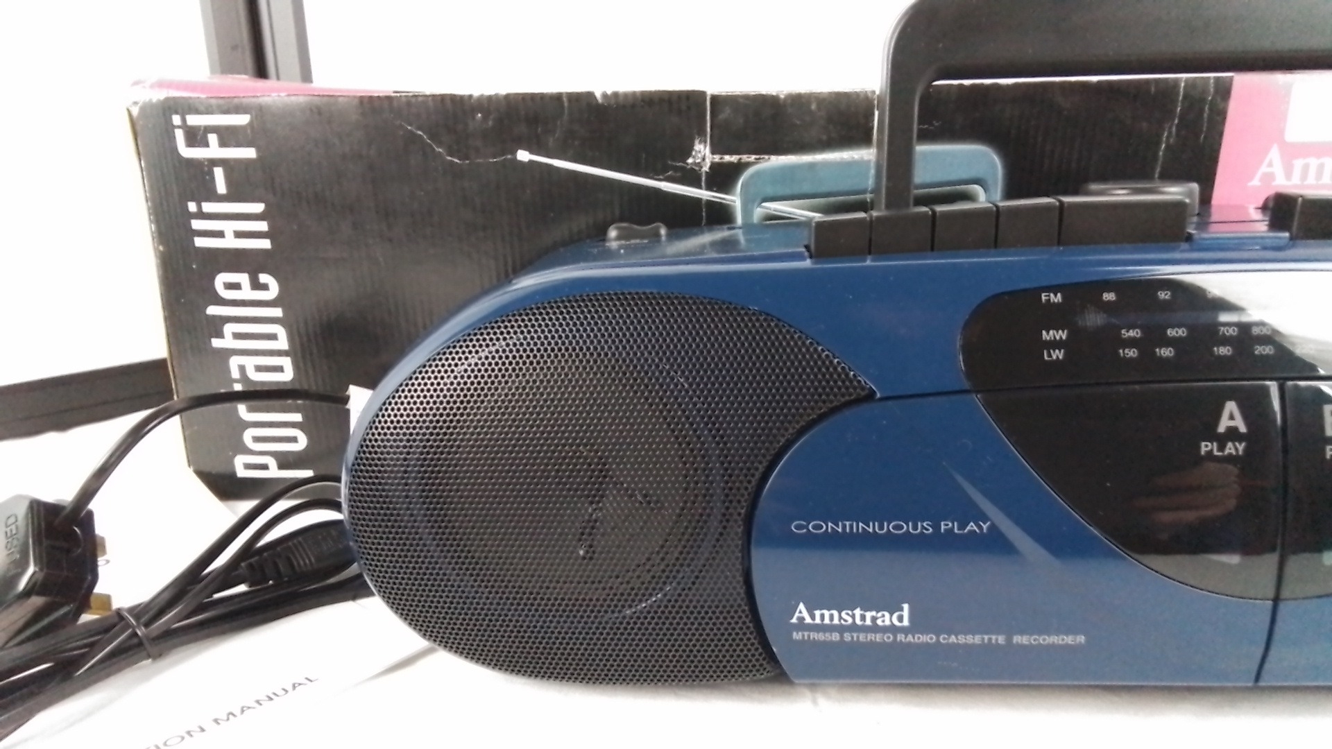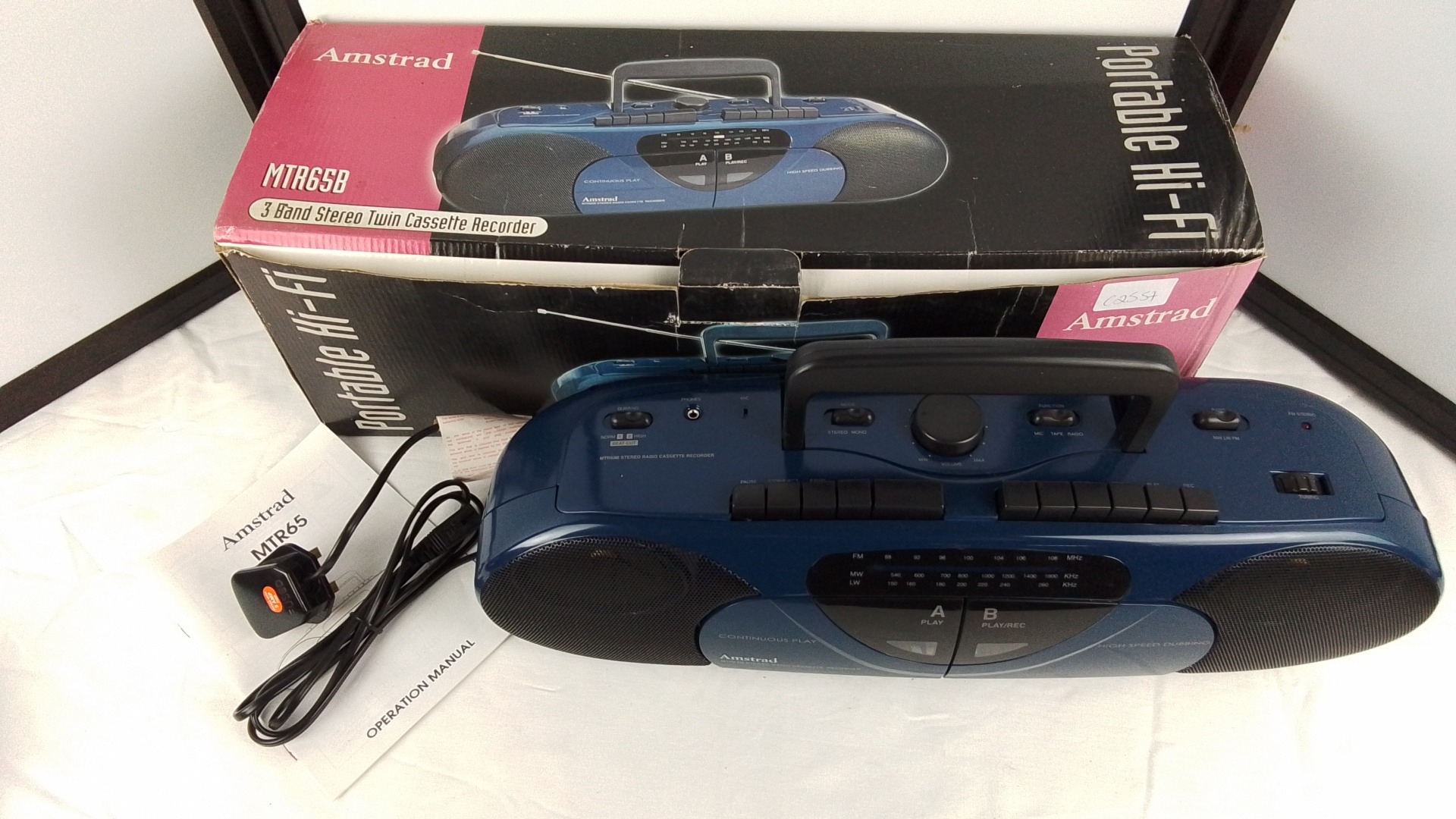 An Amstrad MTR65B portable stereo radio cassette recorder, three-band (FM/MW/LW), with twin cassette decks for continuous play and high-speed dubbing, in original box with instruction manual and mains lead.