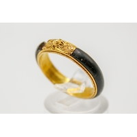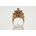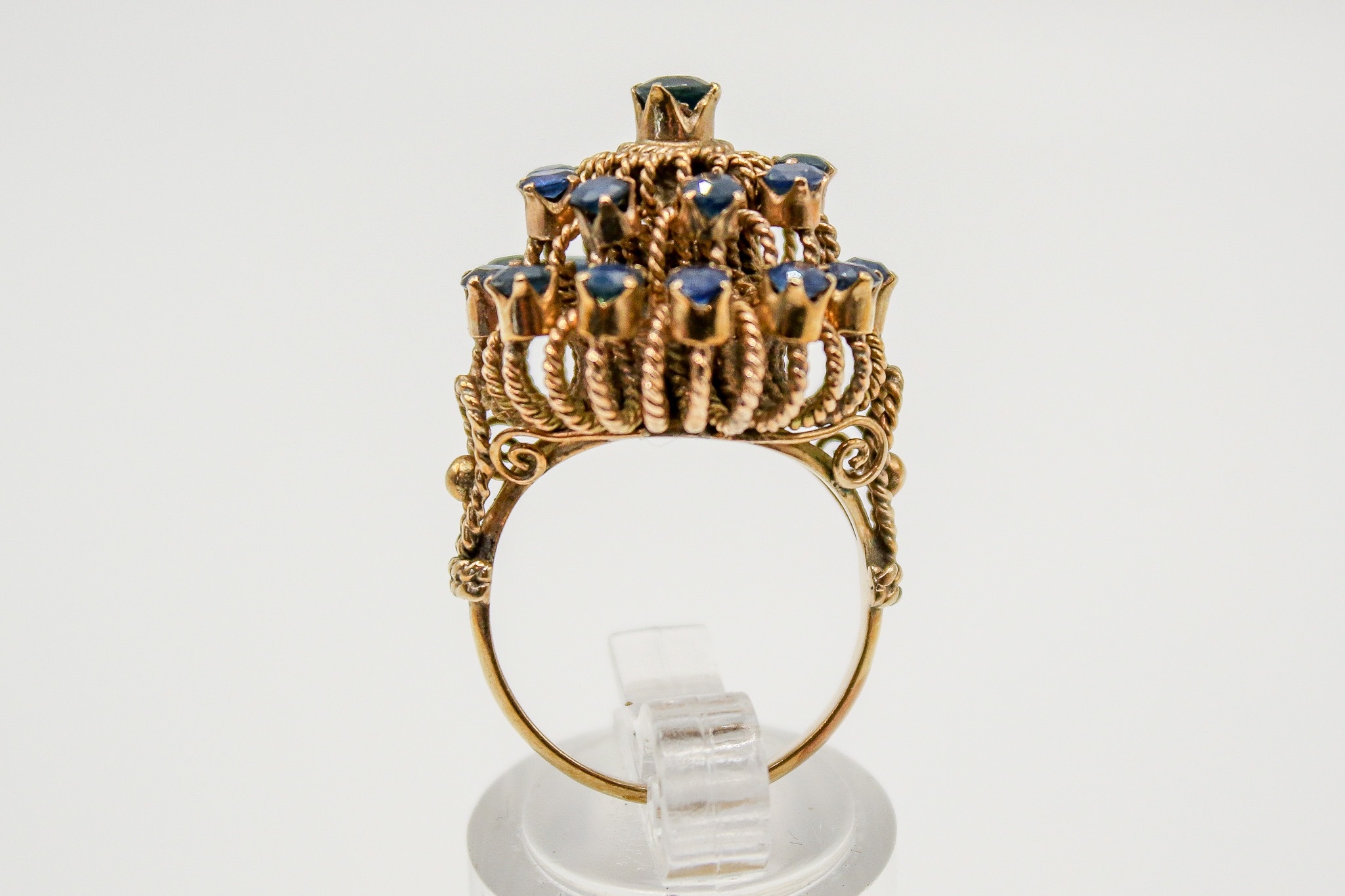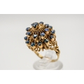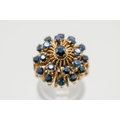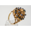 An Indian style yellow metal and sapphire dress ring. The filigree mount set with 21 small round cut sapphires, the mount fixed underneath with a nut and bolt type fixing (unknown metal). Shank marked 14k but testing circa 9ct gold, size M, gross weight 7.8g.