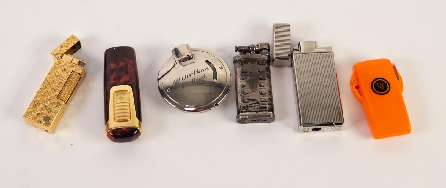 SIX UNBOXED POCKET LIGHTERS, comprising; DUNHILL, in gilt, (23677), WINDMILL, in faux tortoiseshell and gilt, UST, in orange plastic, COLIBRI 4600, DALVEY, both in chrome, and a CORONA, engraved with smoking pipes, (6)