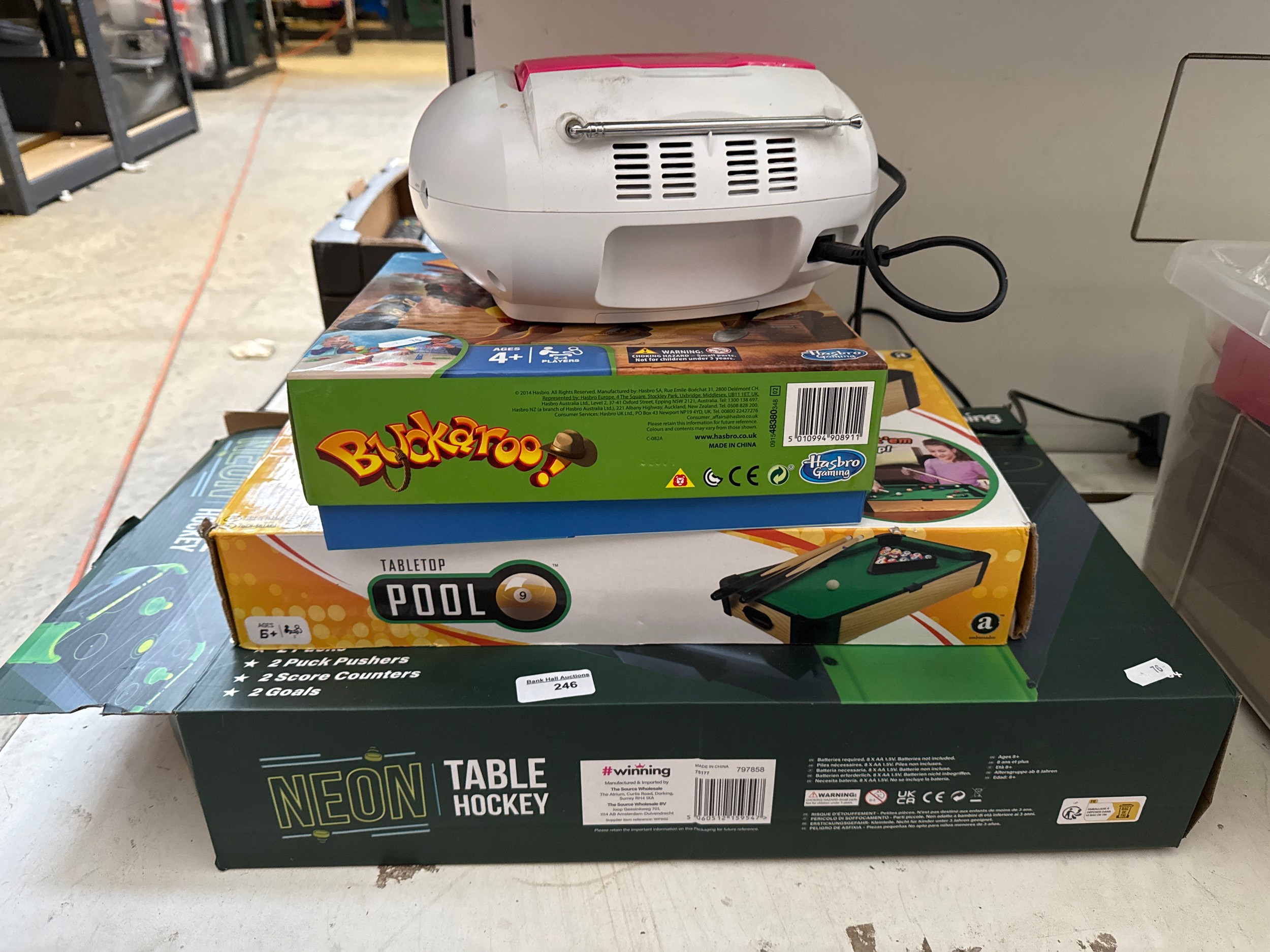 Hockey table, pool table, buckaroo and CD player