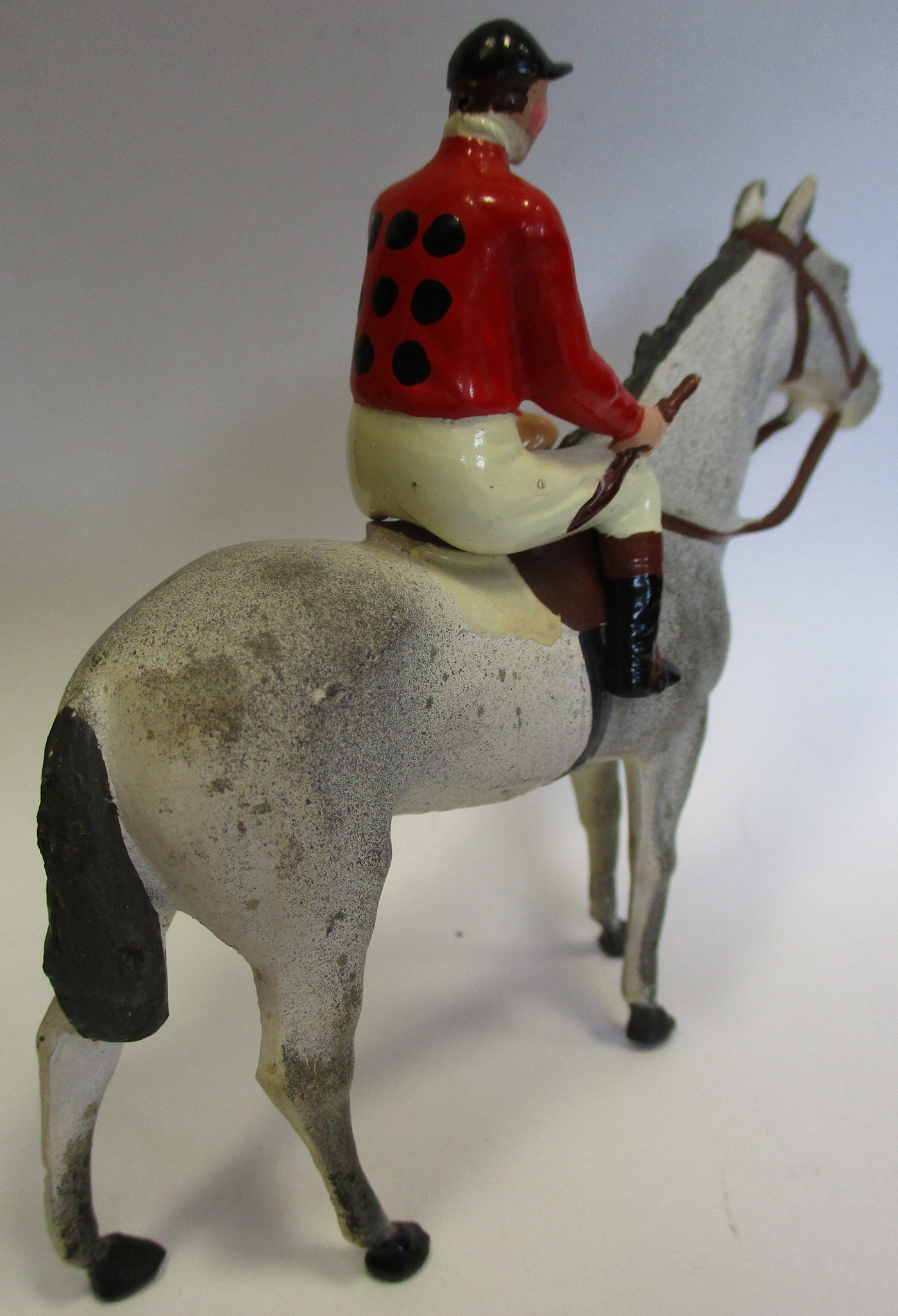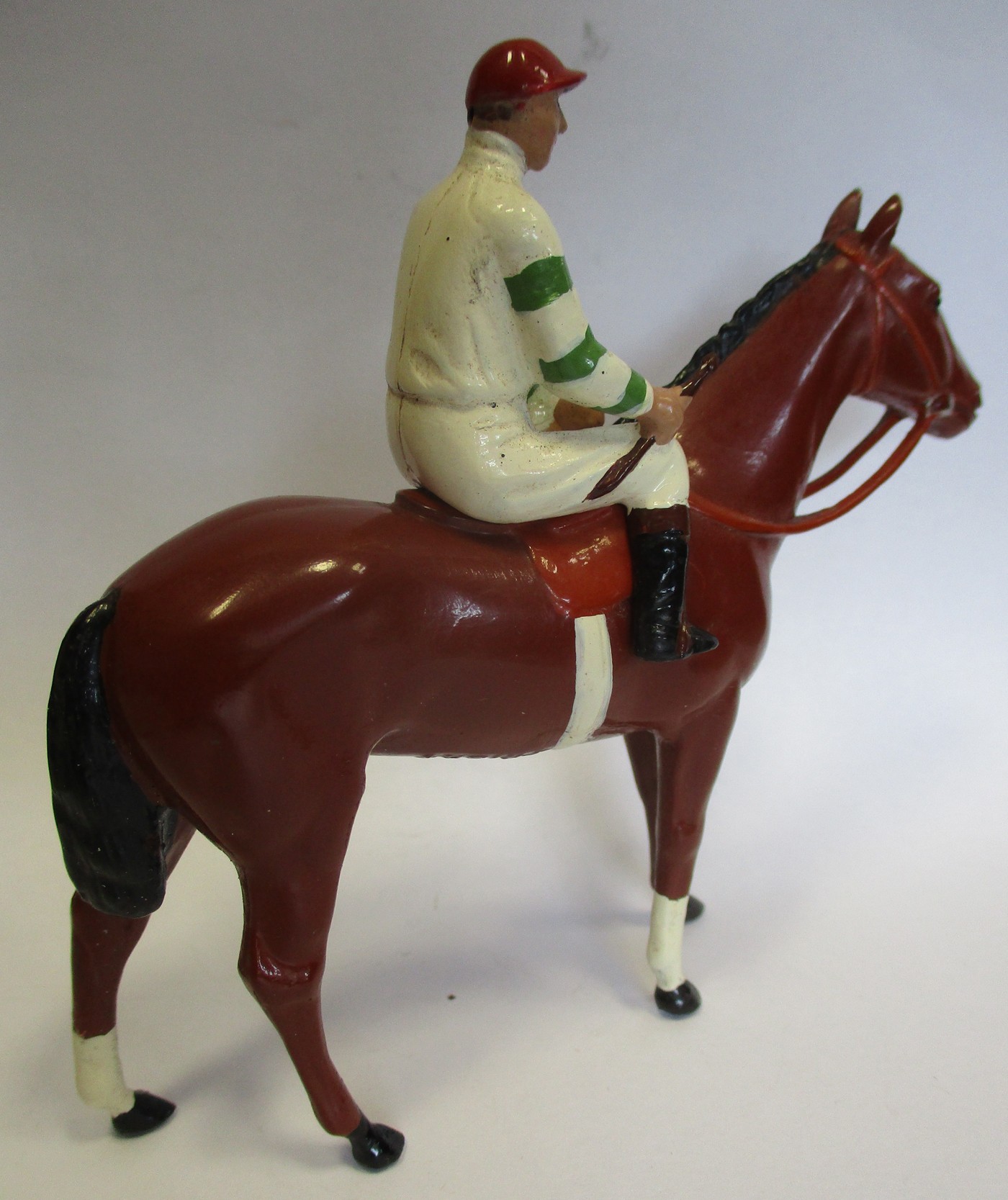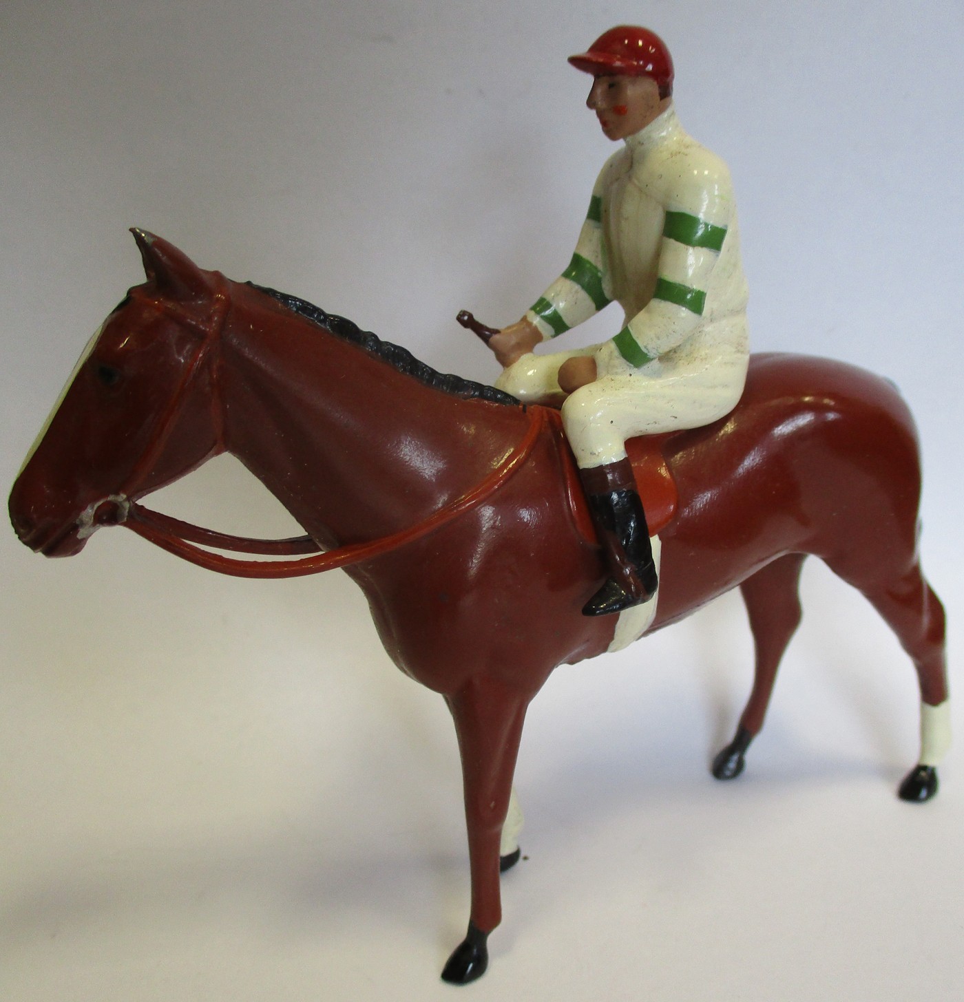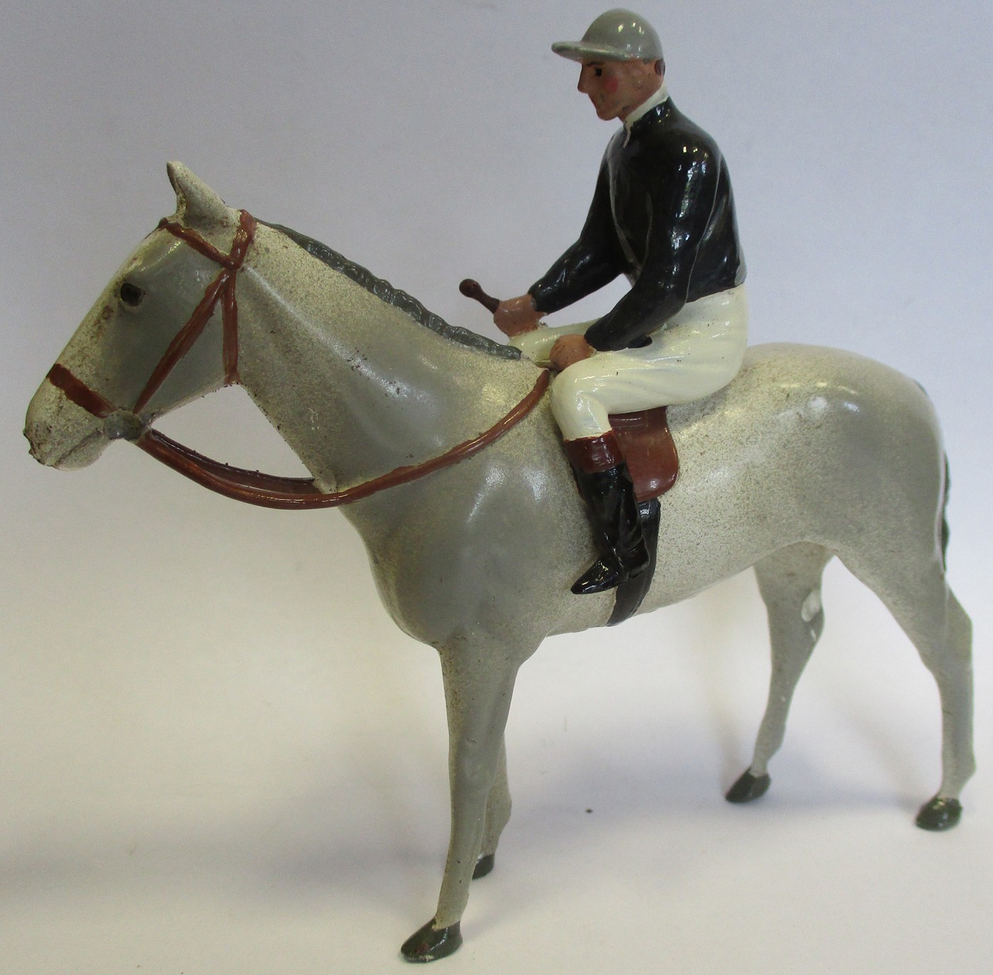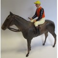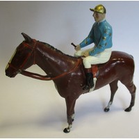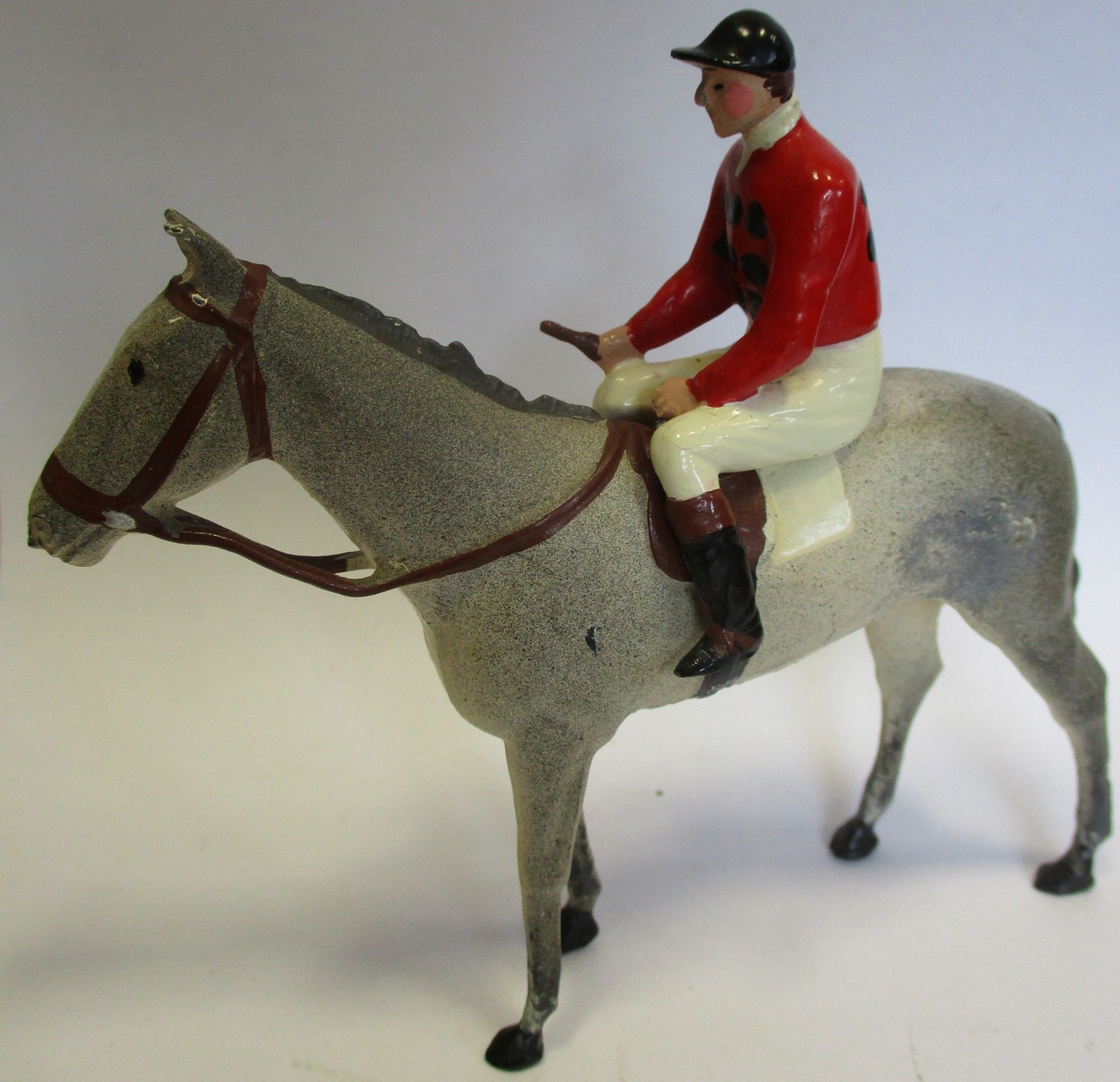 Britains. Racing Colours of Famous Owners range, silks and caps largely re-painted/re-touched with 1. Sage Sables white silks with green hooped arms, grey cap, grey horse. 2. Unidentified dark green silks with grey sash, pink cap, black horse. 3. Mr F.W. Leach red silks with large black dots, black cap, grey horse. 4. Mr August Belmont (1940) purple silks with red sash, red cap, brown horse. 5. Sir Thomas Dixon orange silks with purple sleeves, yellow cap, brown horse, generally good and better. Qty 5 (T)