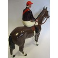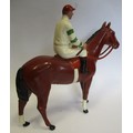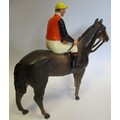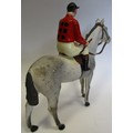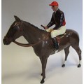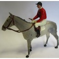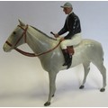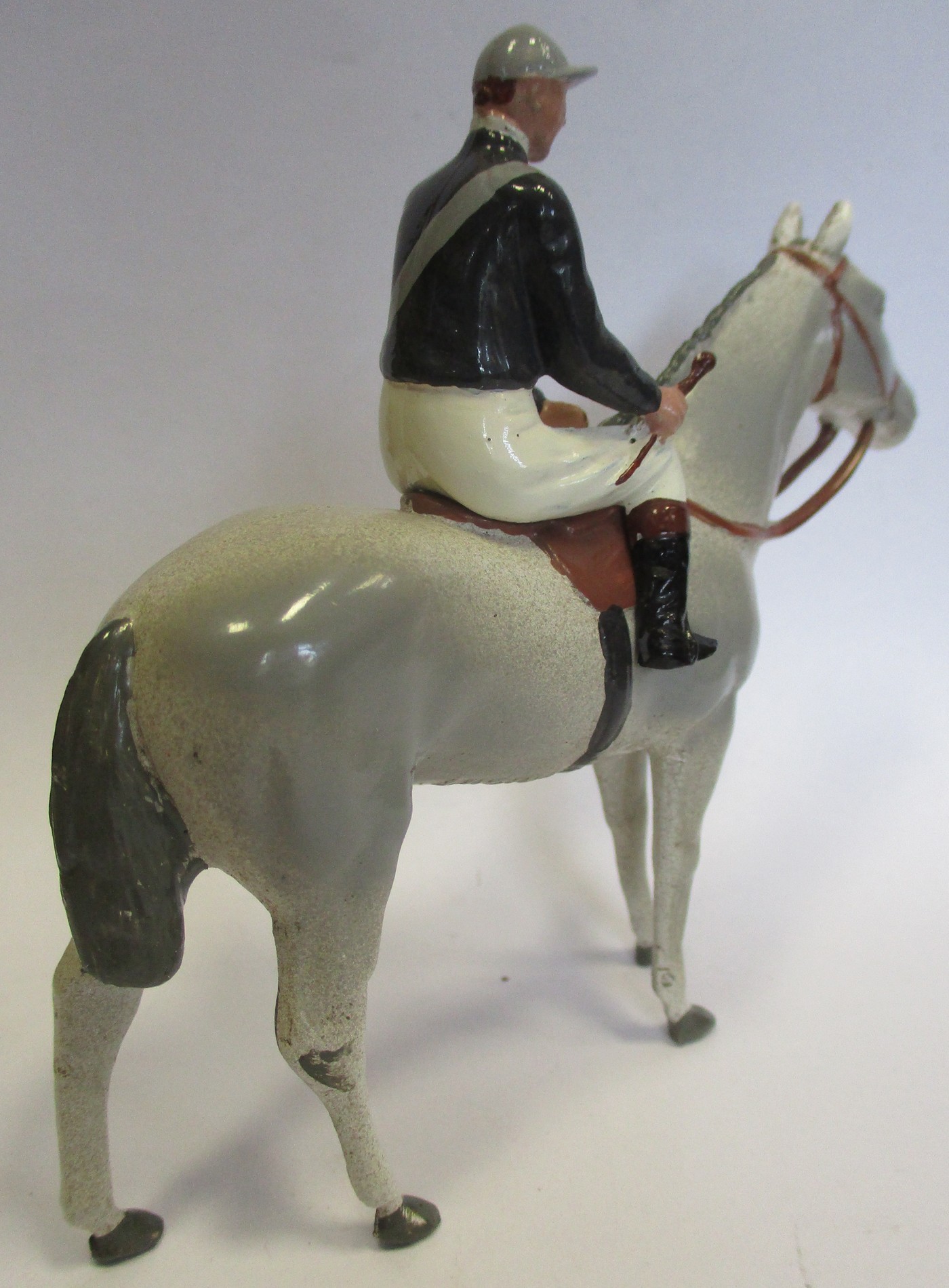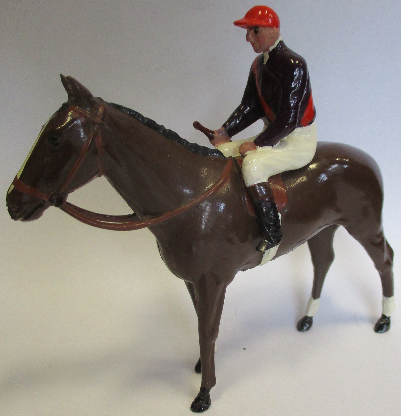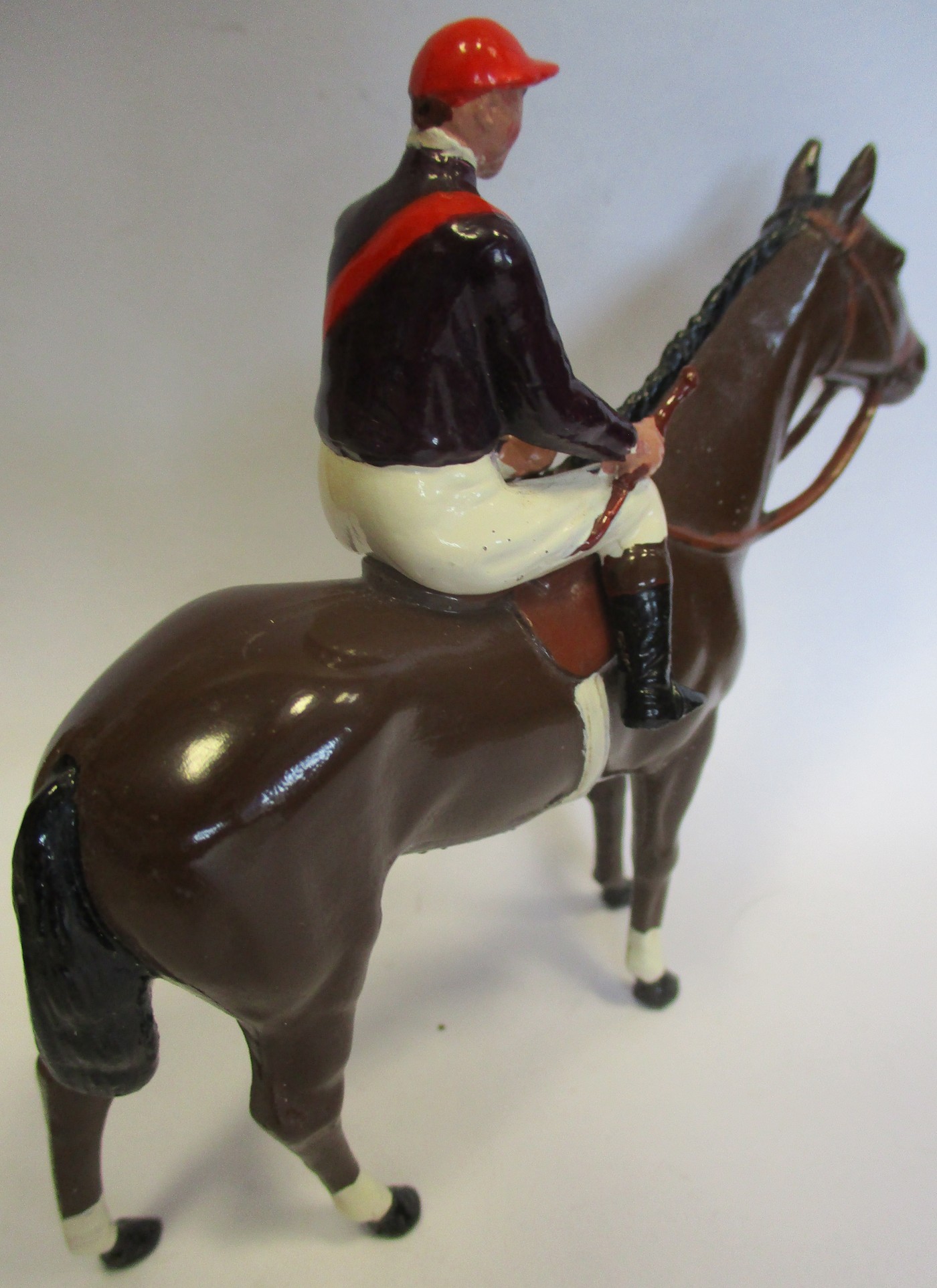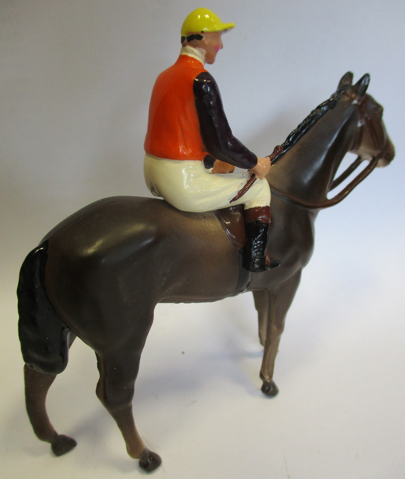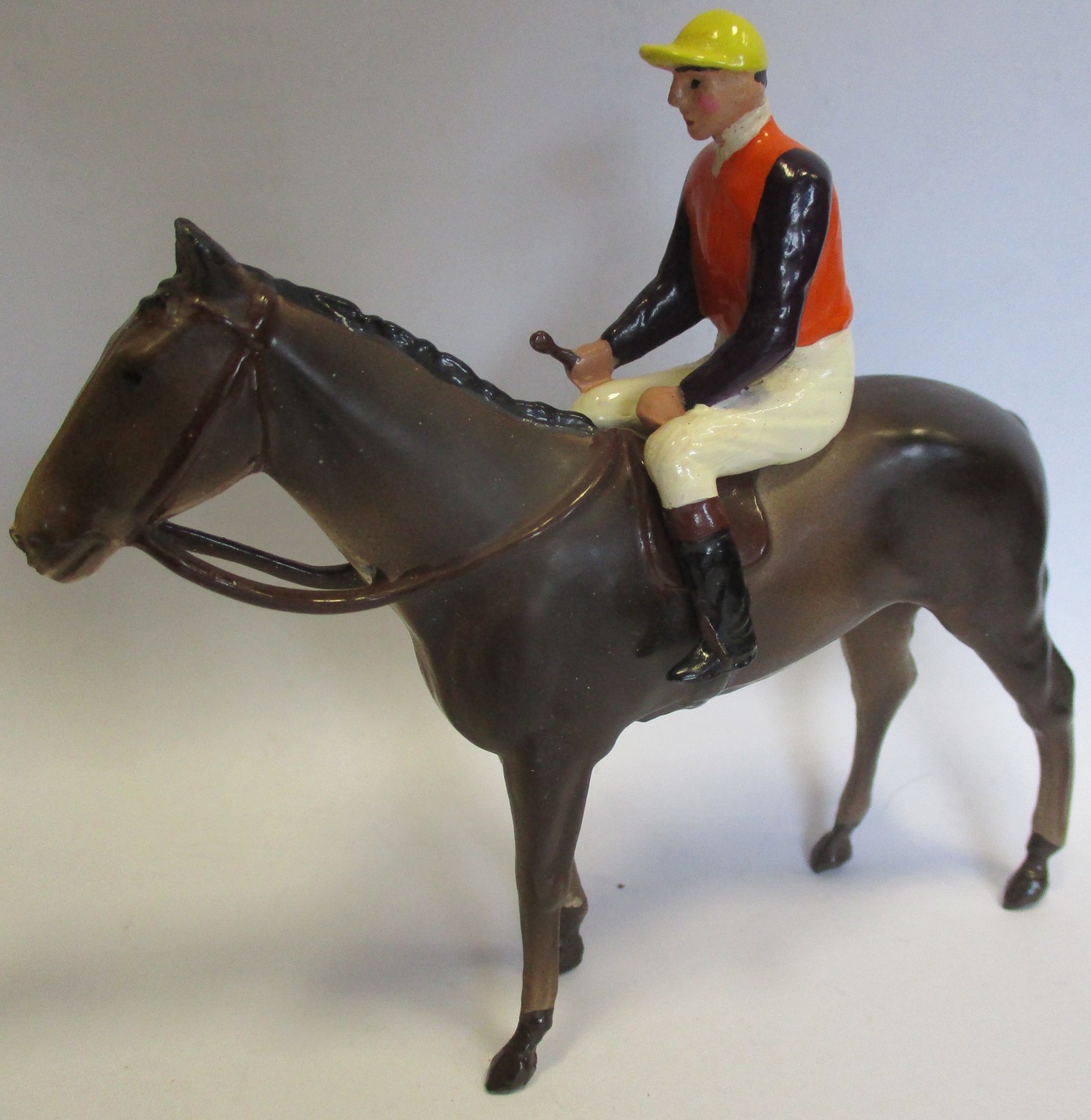 Britains. Racing Colours of Famous Owners range, silks and caps largely re-painted/re-touched with 1. Sage Sables white silks with green hooped arms, grey cap, grey horse. 2. Unidentified dark green silks with grey sash, pink cap, black horse. 3. Mr F.W. Leach red silks with large black dots, black cap, grey horse. 4. Mr August Belmont (1940) purple silks with red sash, red cap, brown horse. 5. Sir Thomas Dixon orange silks with purple sleeves, yellow cap, brown horse, generally good and better. Qty 5 (T)