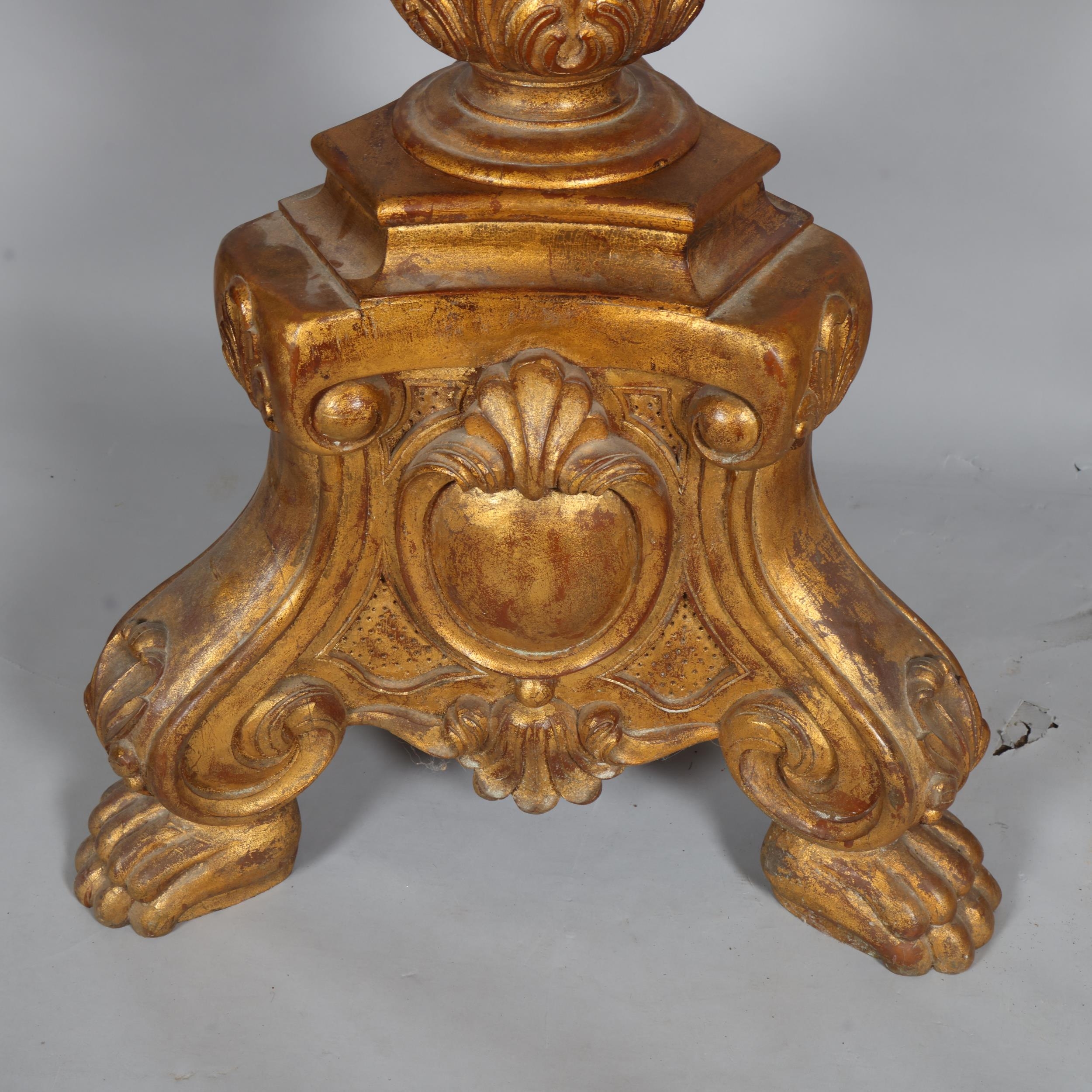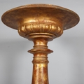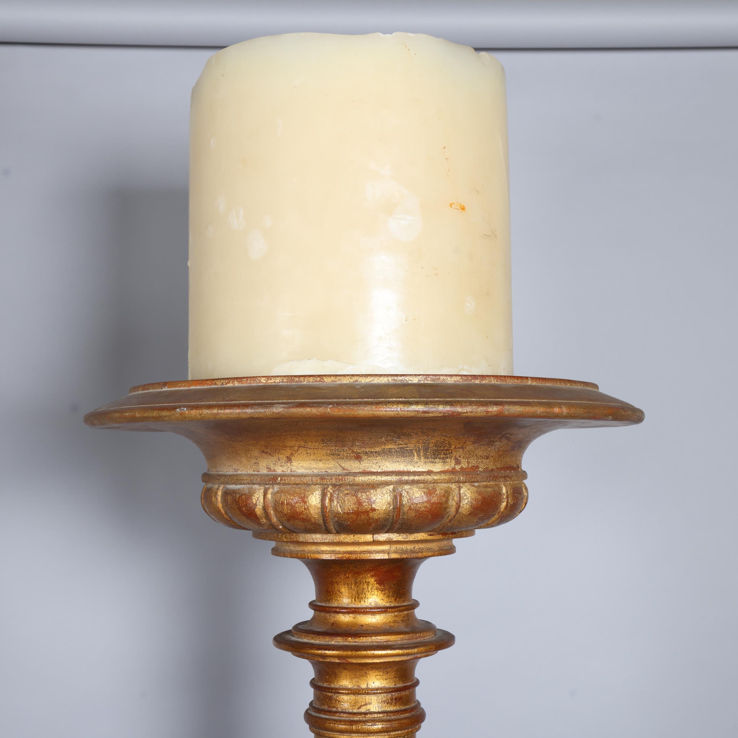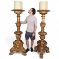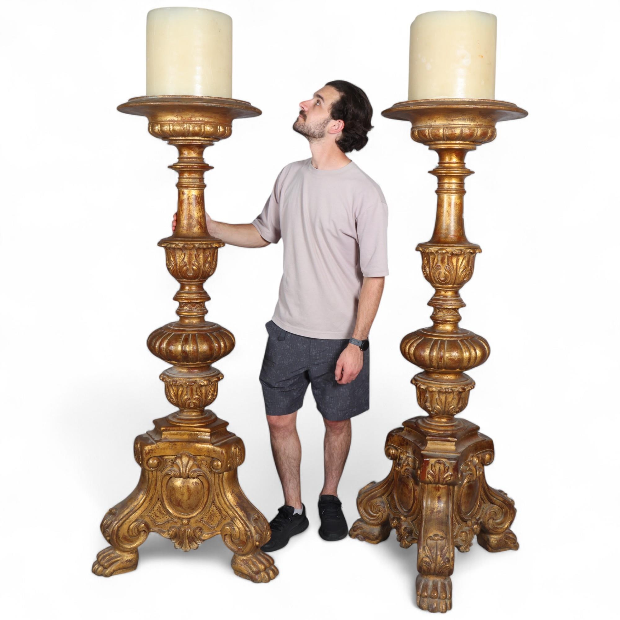 A massive pair of Christopher Guy Lumiere floor-standing candlesticks, in renaissance gold leaf finish, current UK RRP £4,180 per stand, diameter (widest point) 69cm, height 170cm, together with a pair of Christopher Guy candles, current RRP approx £500 per candle, diameter 30cm, height 31cm, overall height including candles 200cm