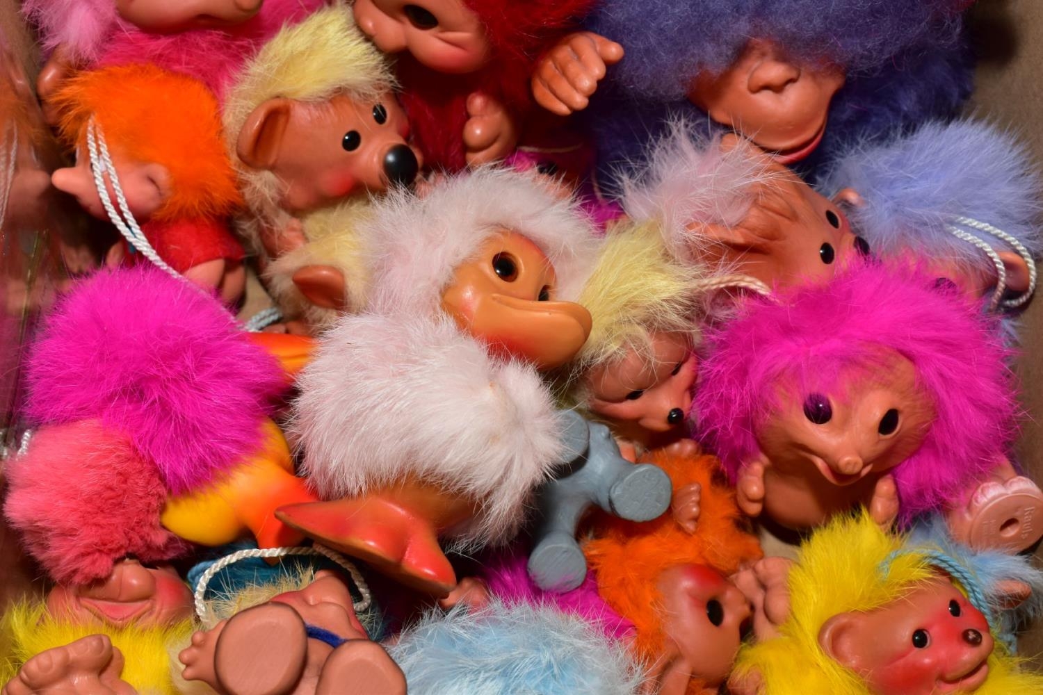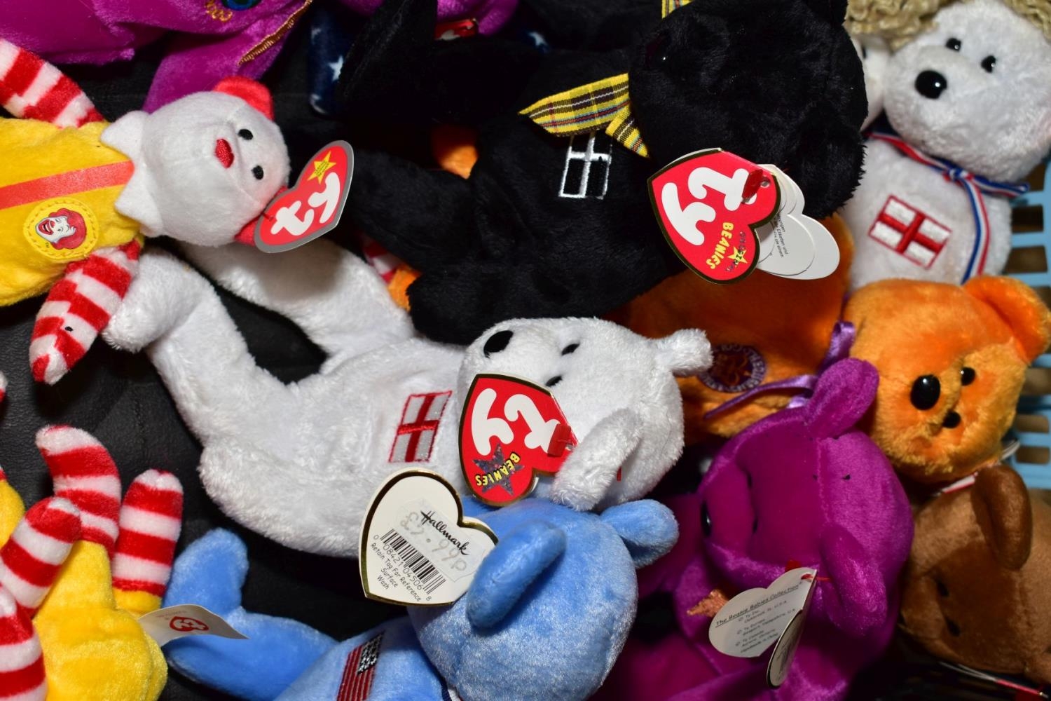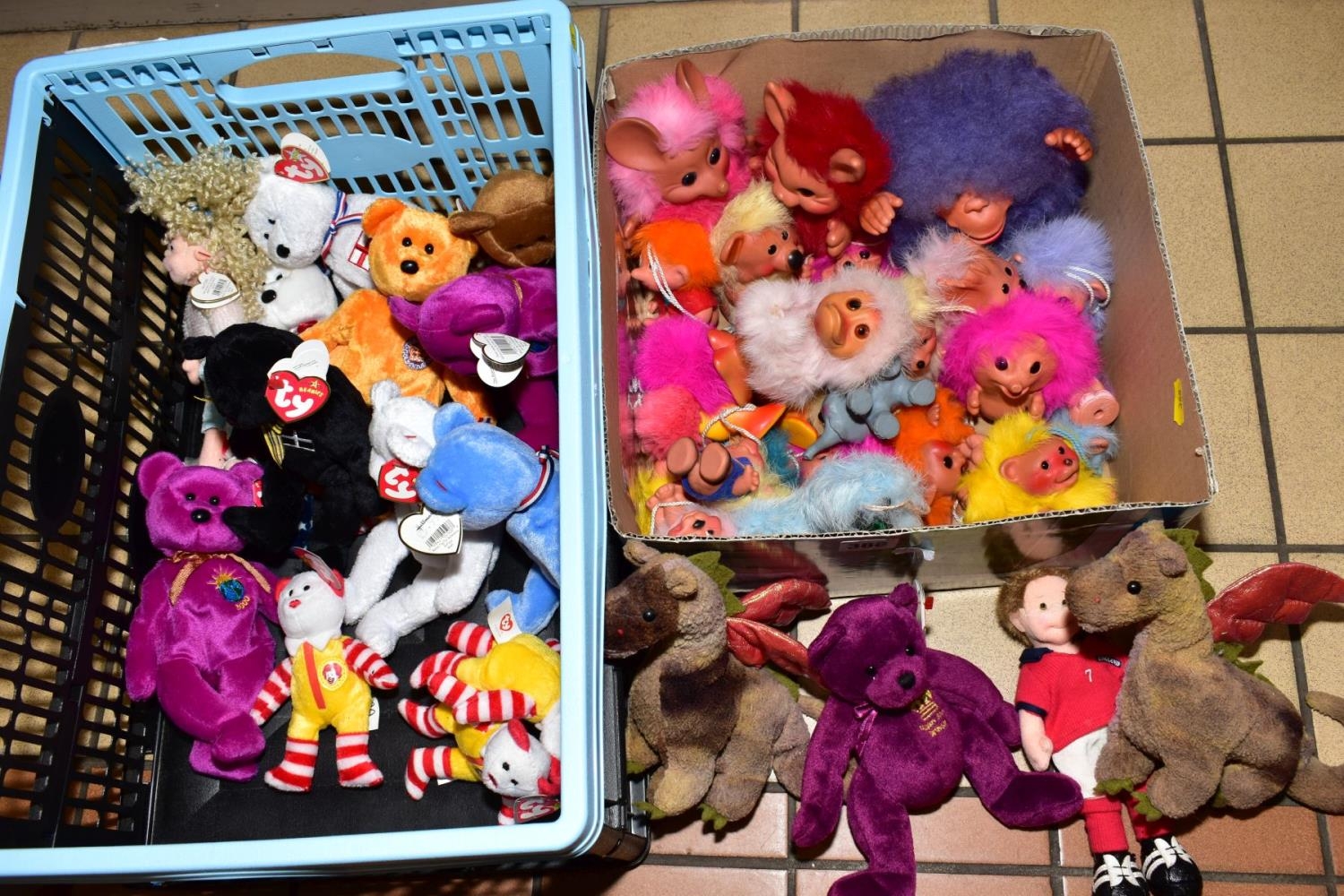 A COLLECTION OF VINTAGE RAULS/PLASTECH HAPPY GANG FIGURES, to include Debbie Duck, Big Bunny, Ossie Owl, Swinging Monkey, Matey Mouse & Emma Elephant, with a quantity of TY Beanie Baby soft toys, mainly from early 2000's (two boxes)