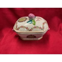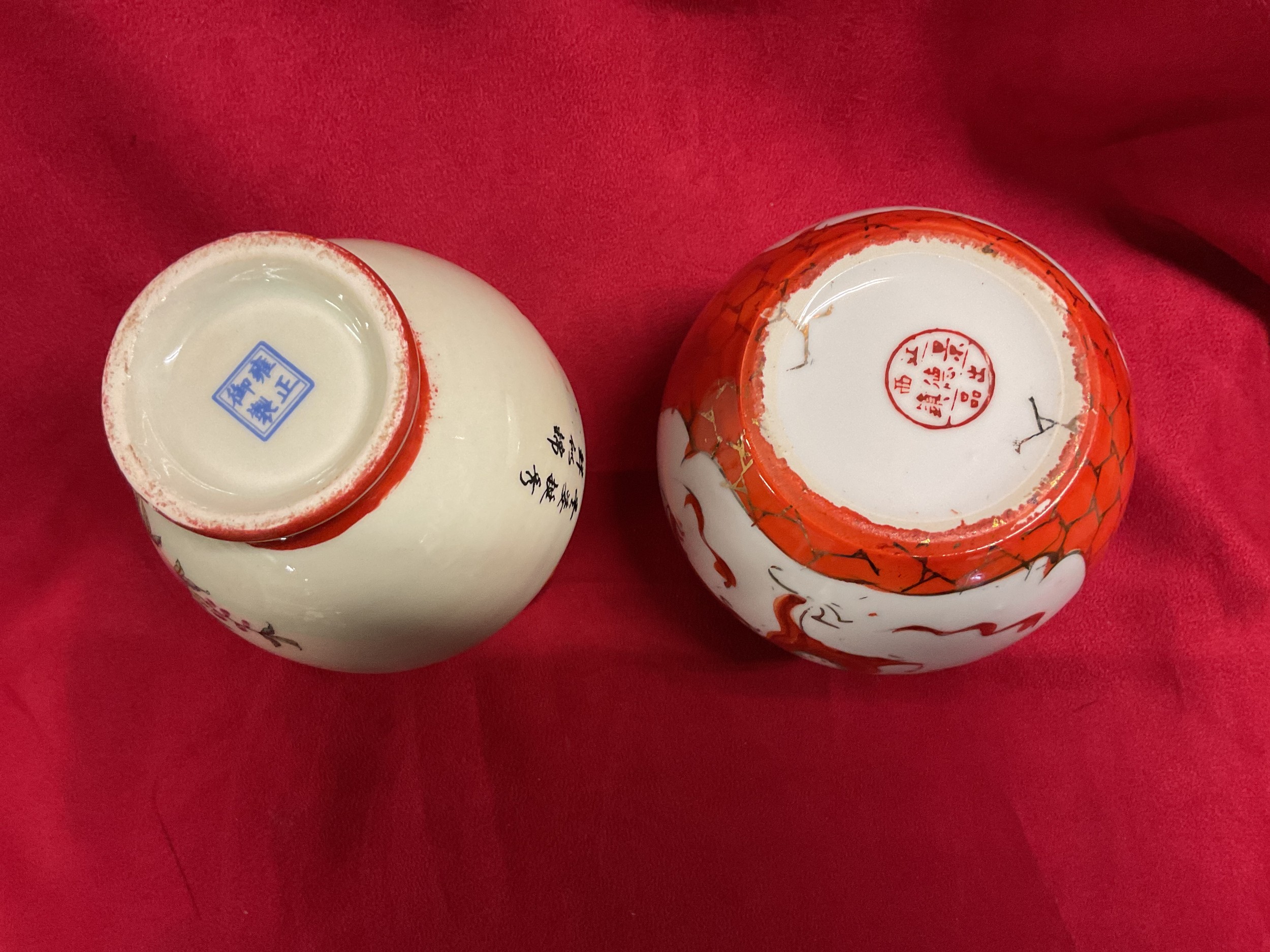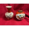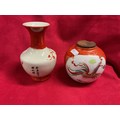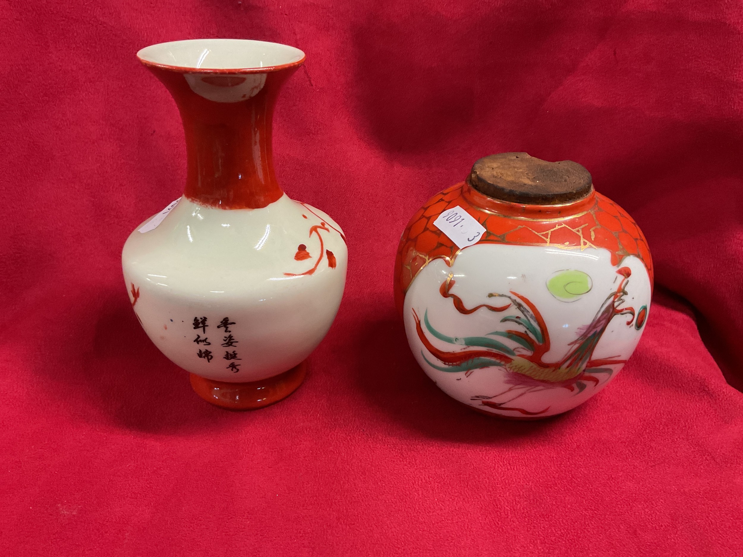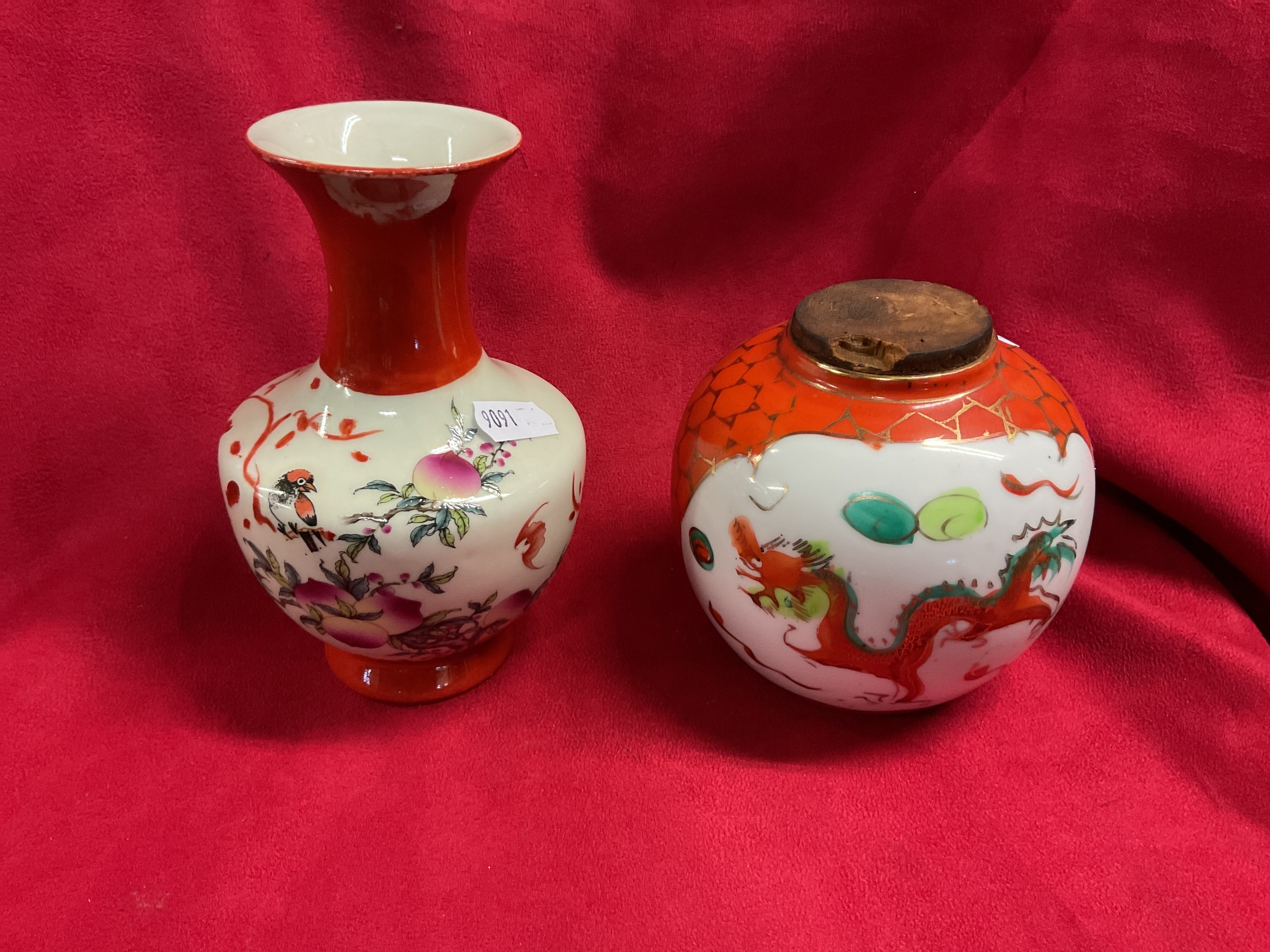 A Chinese porcelain vase with red neck and base decorated in a famille rose style with bird and peach motifs together with a Chinese ginger jar with dragon and phoenix motif