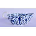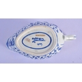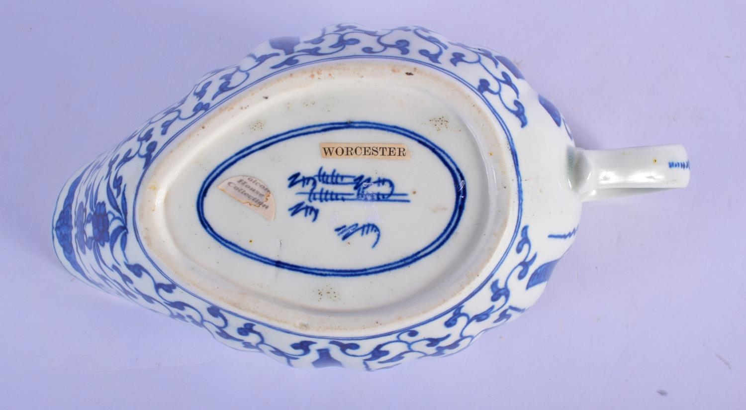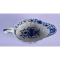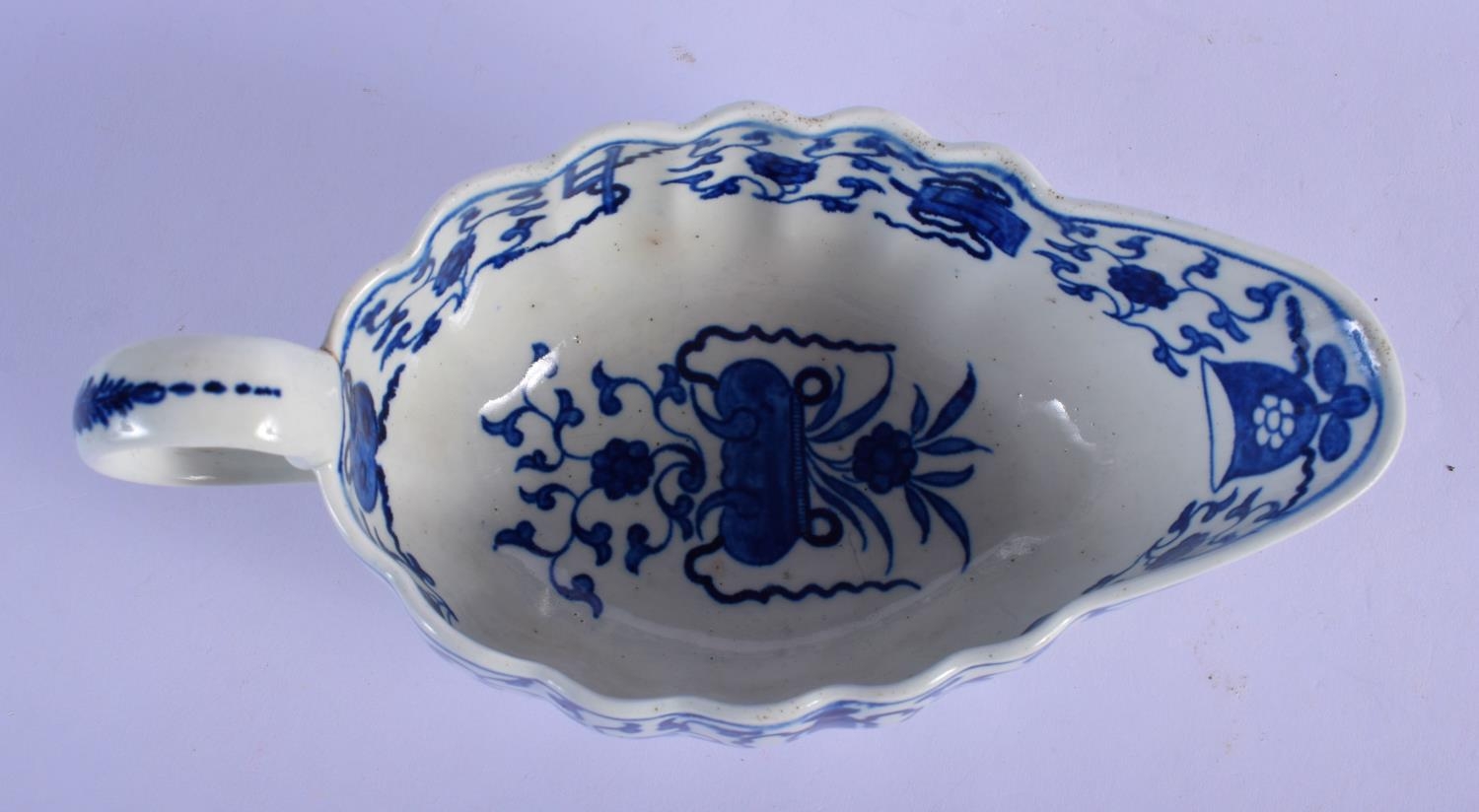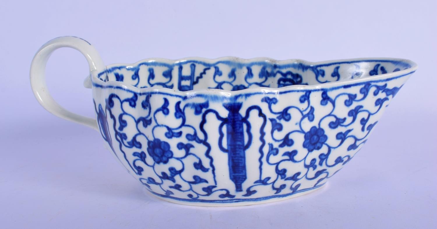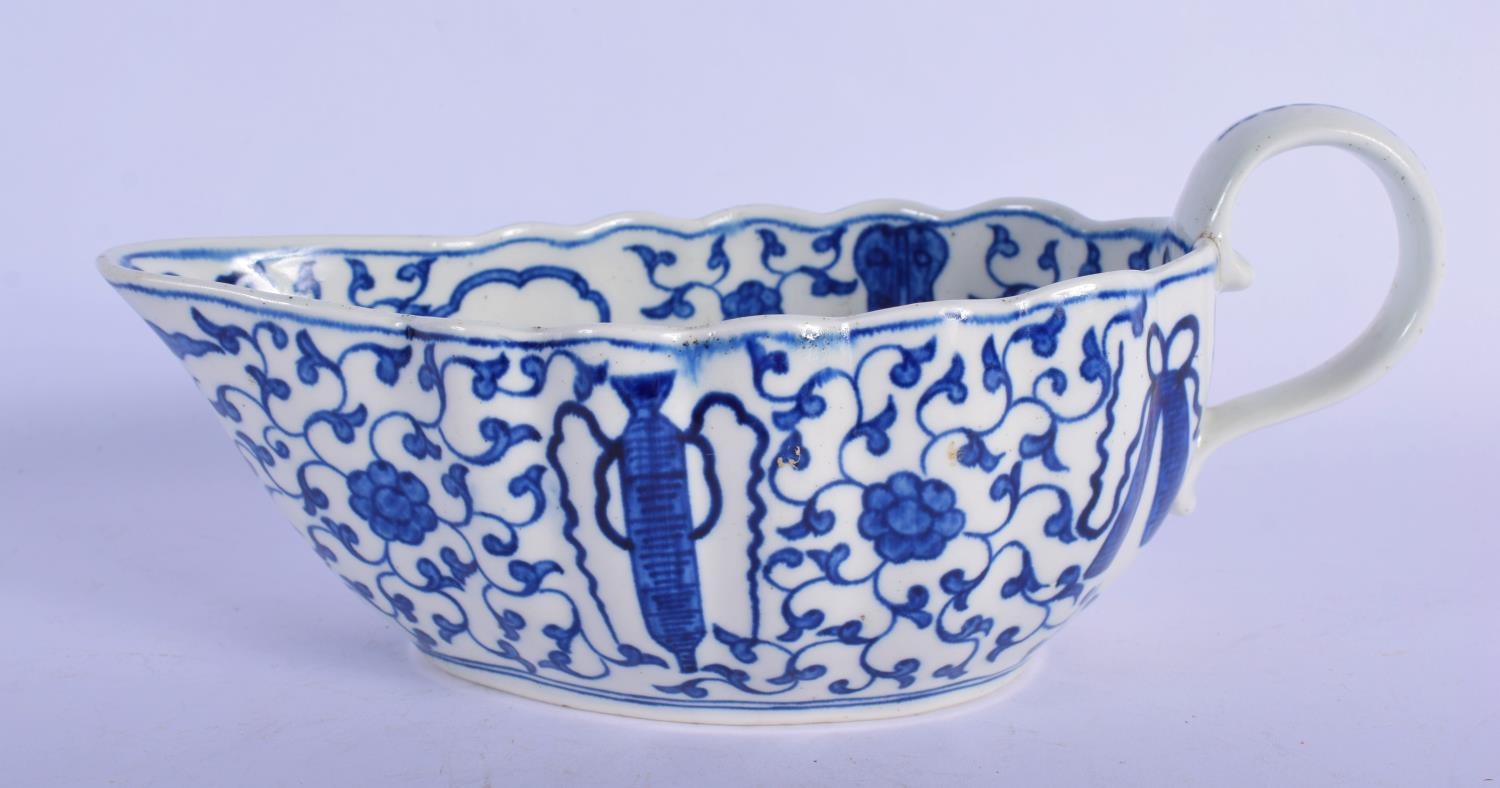 Worcester blue and white sauceboat c.1780, the fluted form painted in the Chinese manner with the Hundred Antiques pattern, pseudo script mark, The Hundred Antiques pattern is more commonly seen on flatwares and its appearance on a sauceboat is unusual. 26cm x 18cm