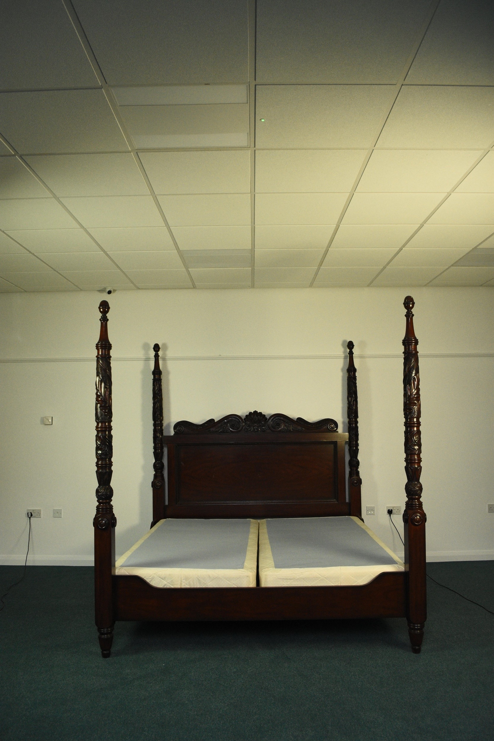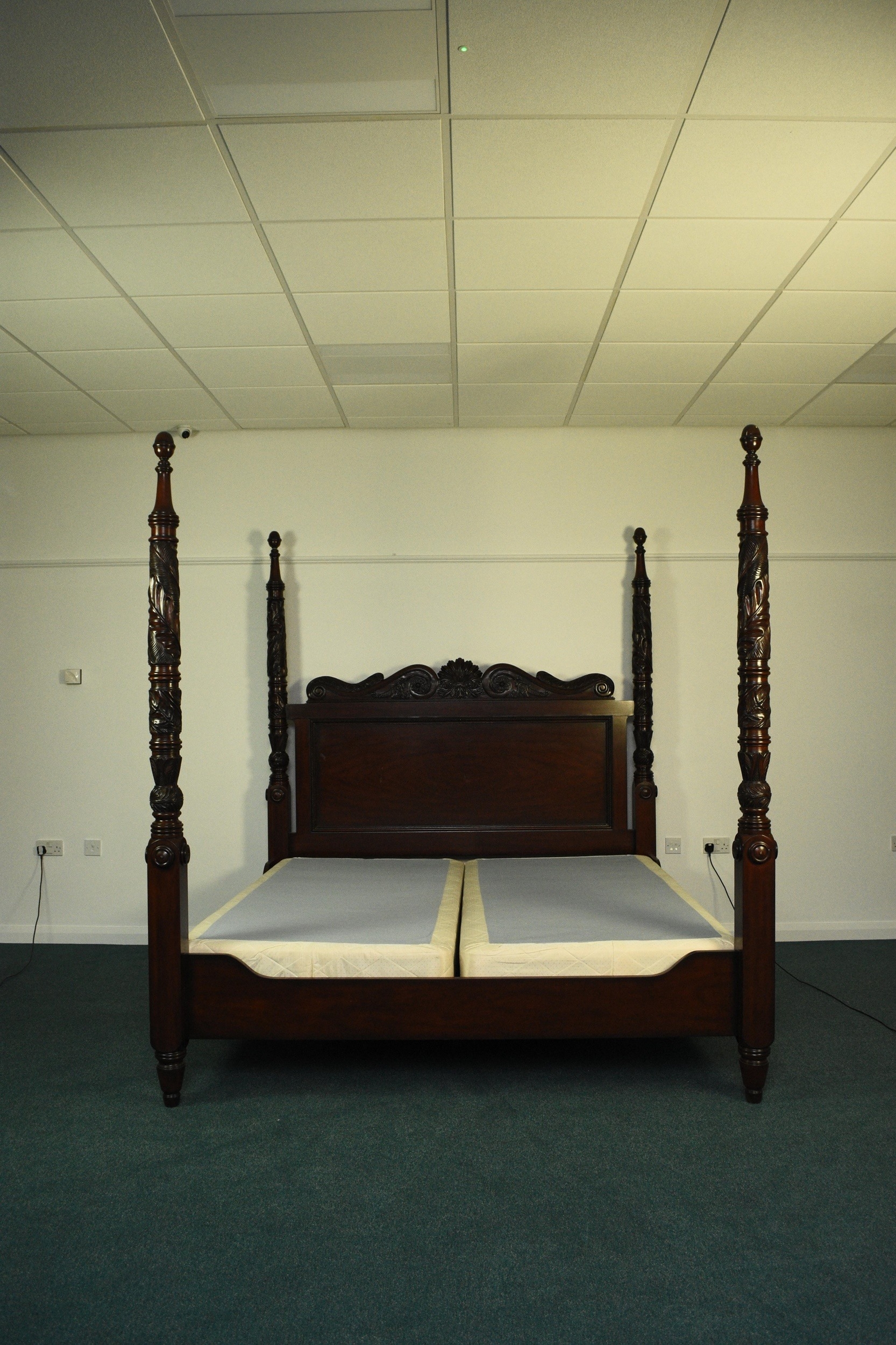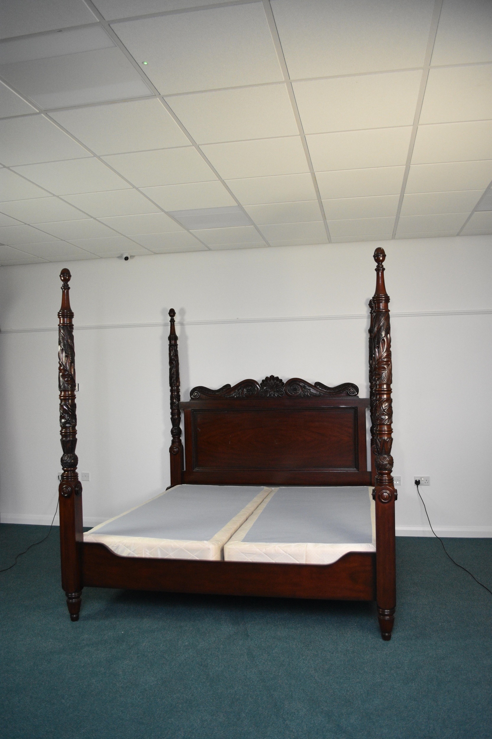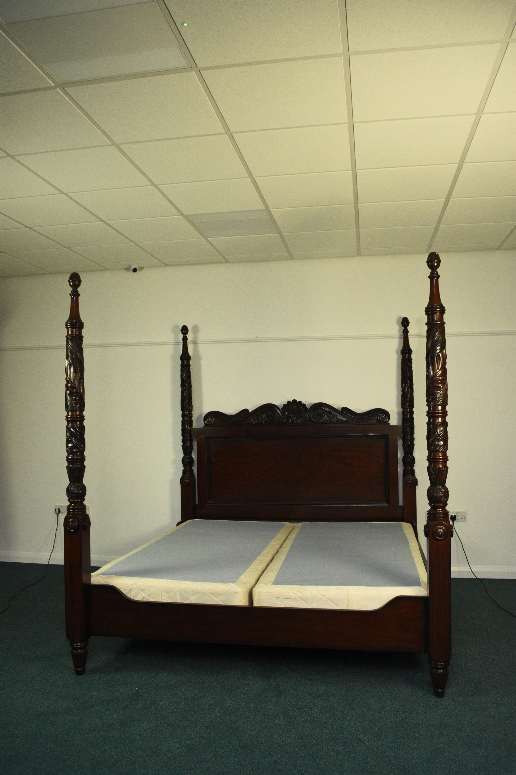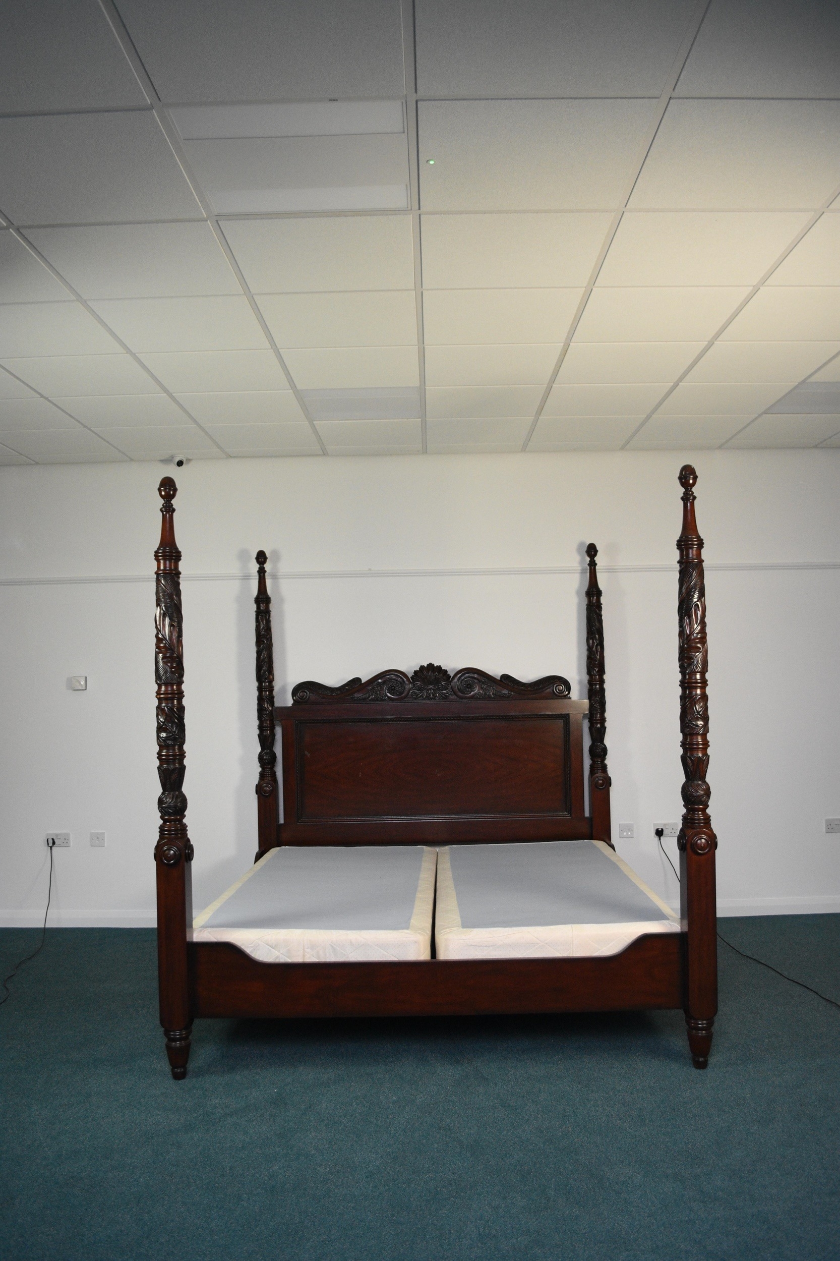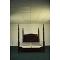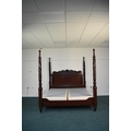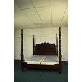 Ralph Lauren: A mahogany finish four-poster bed, late 20th century Carved and stained hardwood in the Victorian style, the headboard with foliate scroll cresting, the turned uprights with palm and acanthus carving terminating in turned finials. With upholstered bed base. 221cm wide x 229cm long x 224cm high Condition:Good condition overall. Some minor cosmetic marks.
