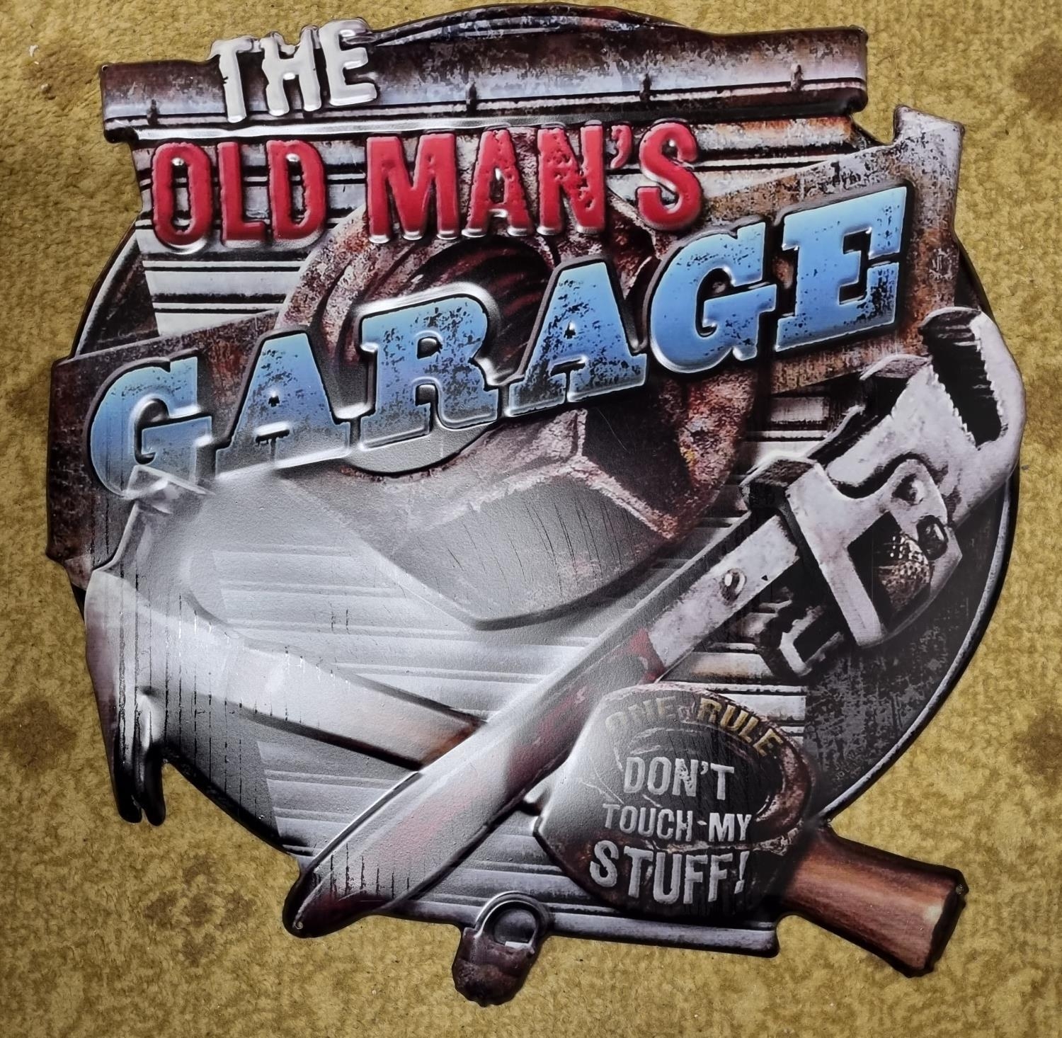 The Old Man's Garage Tin advertising Sign. 50 x 48 cms approx.