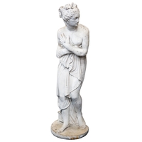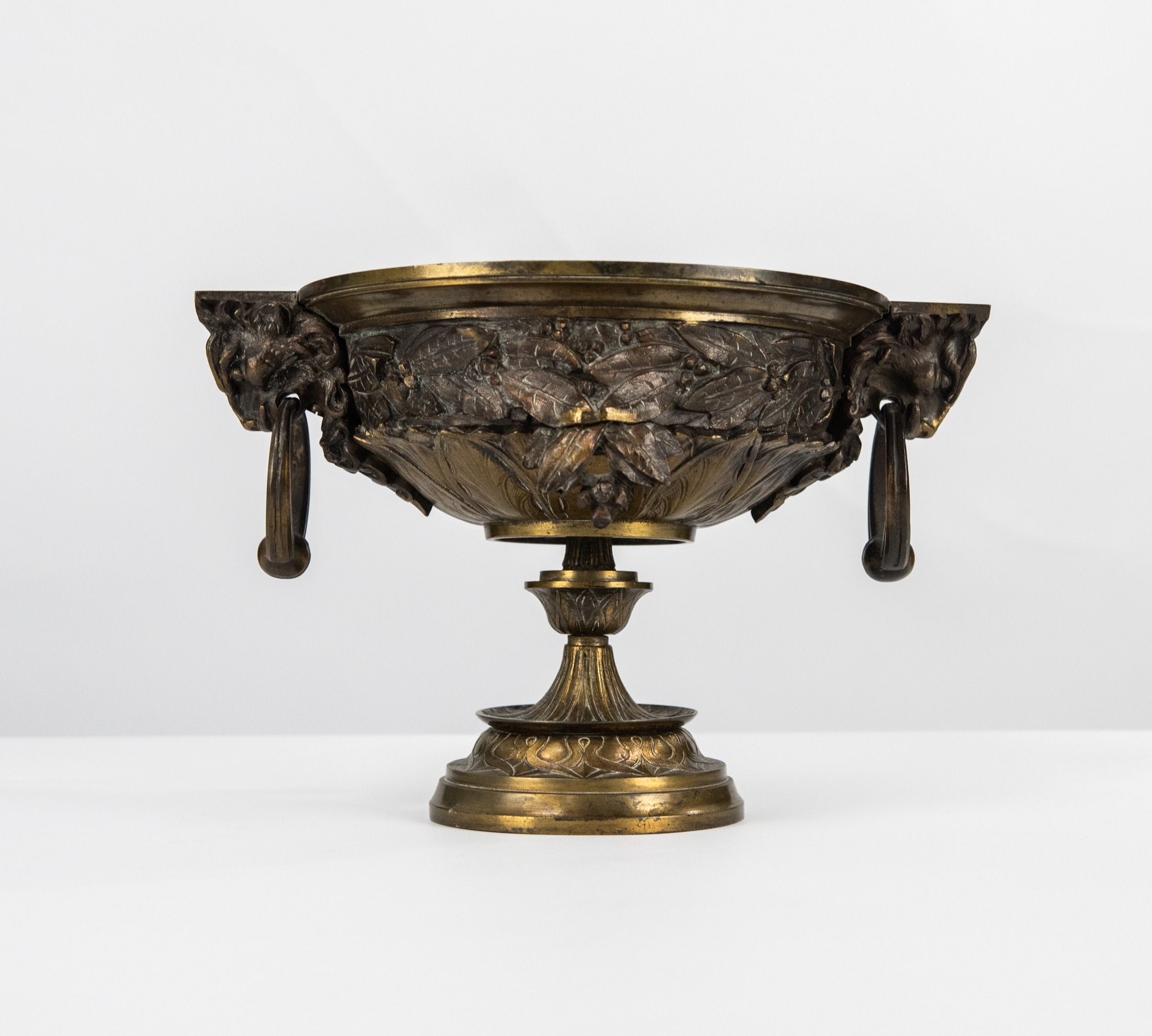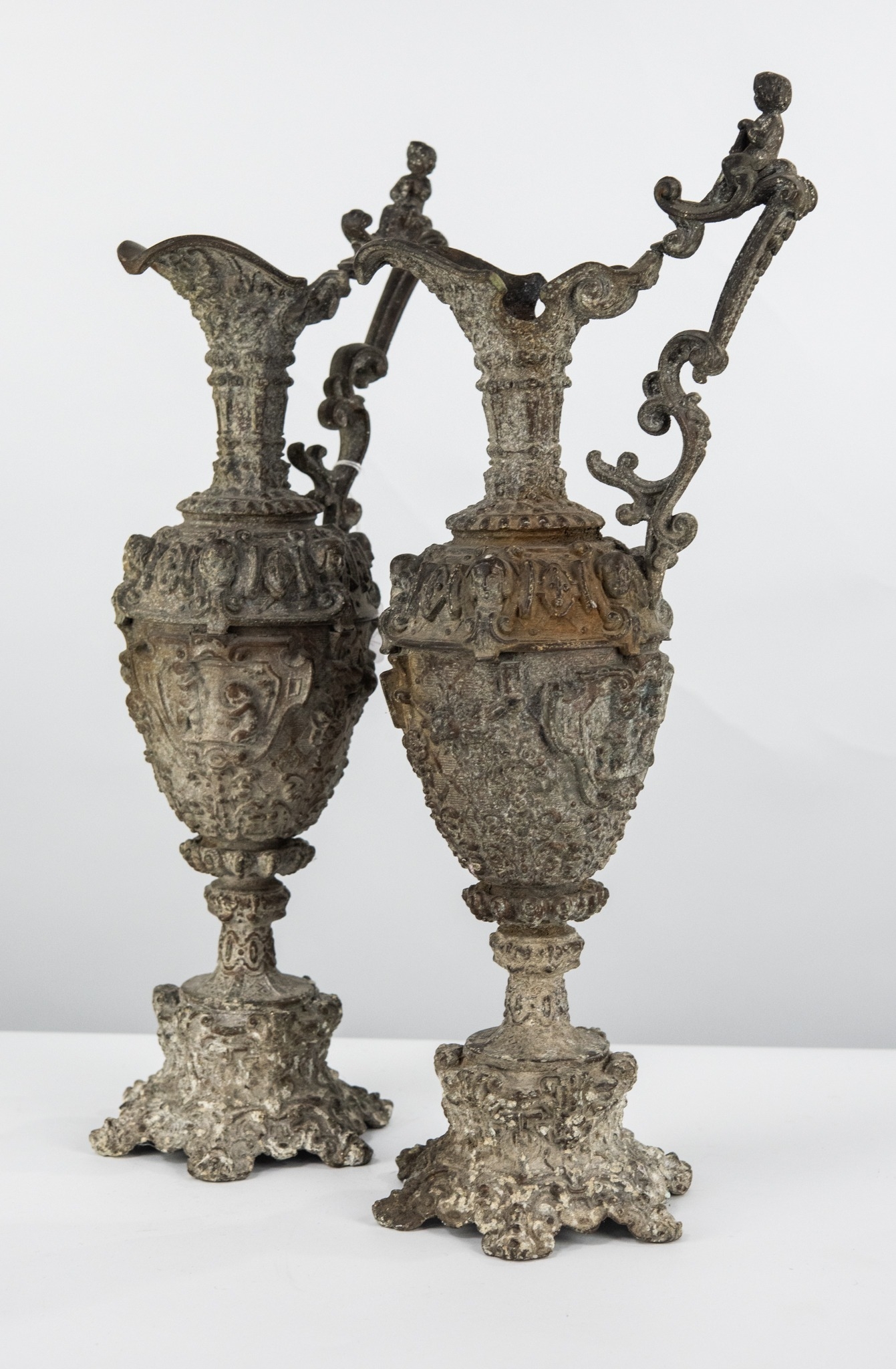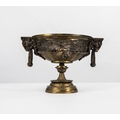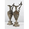EARLY TWENTIETH CENTURY CAST BRASS TWO HANDLED PEDESTAL DISH, with lion mask captive ring handles, meandering vine border and circular moulded base, 5 ¾” (14.6cm) high, 6 ½” (16.5cm) diameter, together with a PAIR OF RENAISSANCE REVIVAL CAST METAL EWERS, 17 ¼” (43.8cm) high, (3)