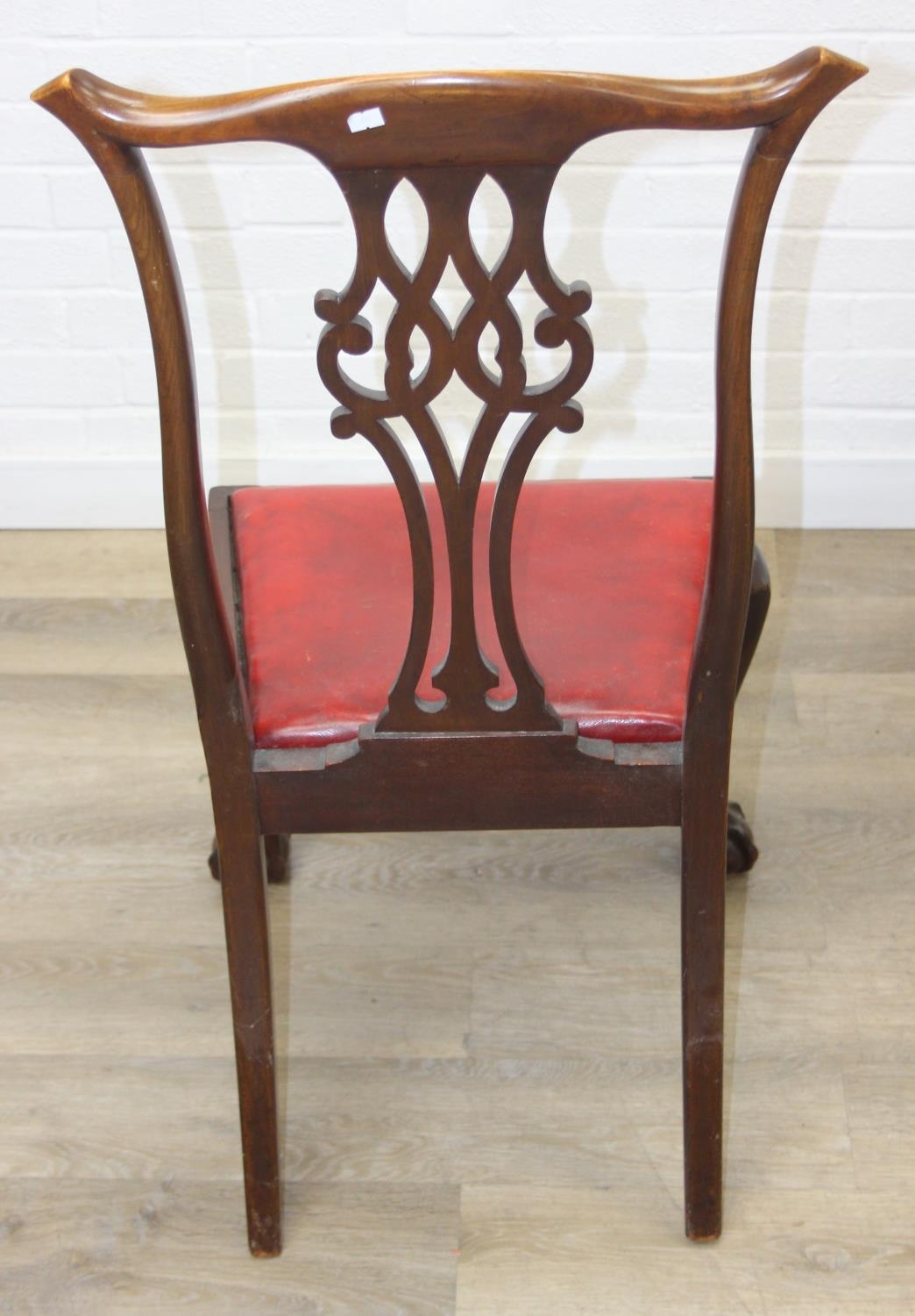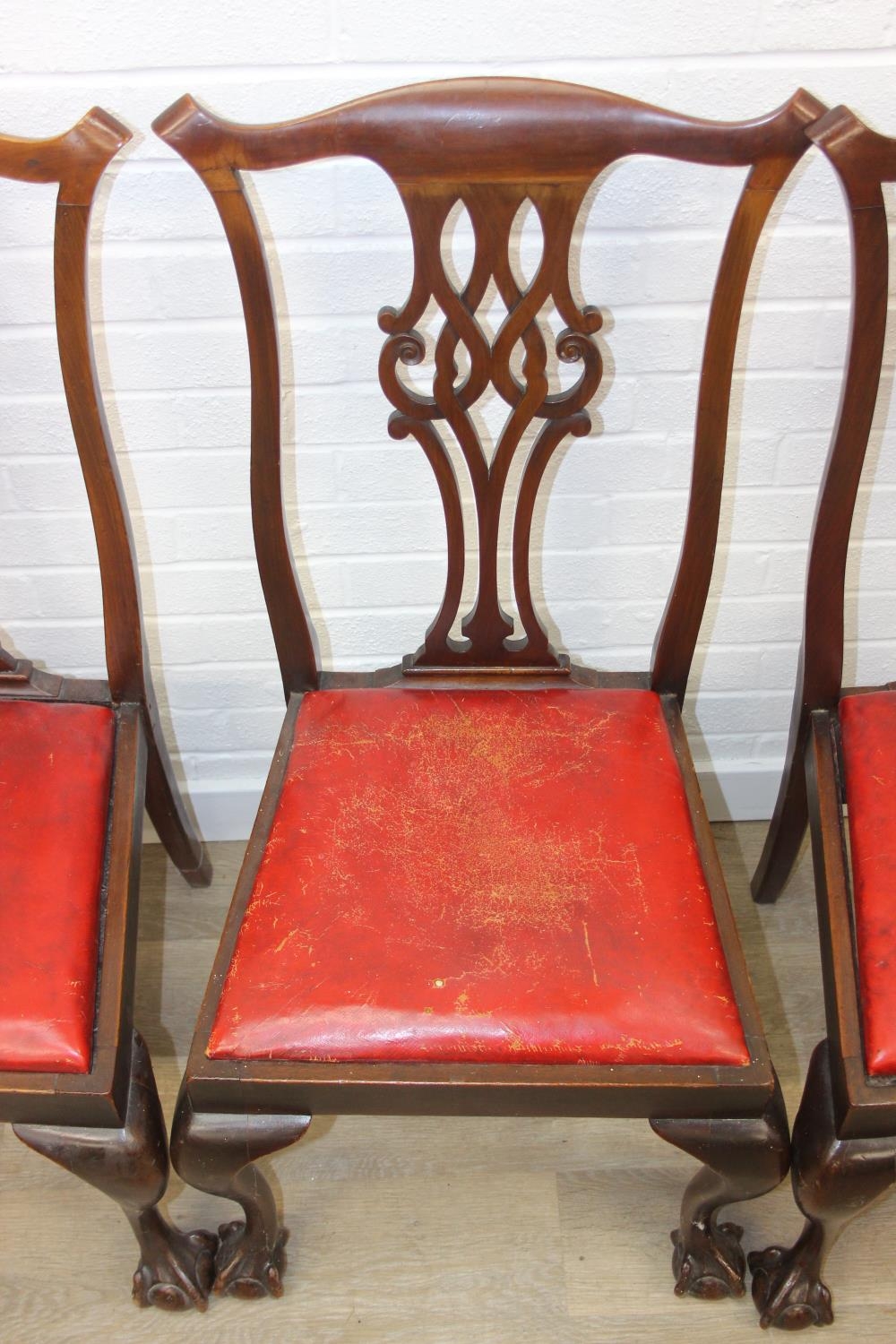 Set of four antique Chippendale style chairs with red leather upholstery and decorative carved backs, each 100cm tall [4]
