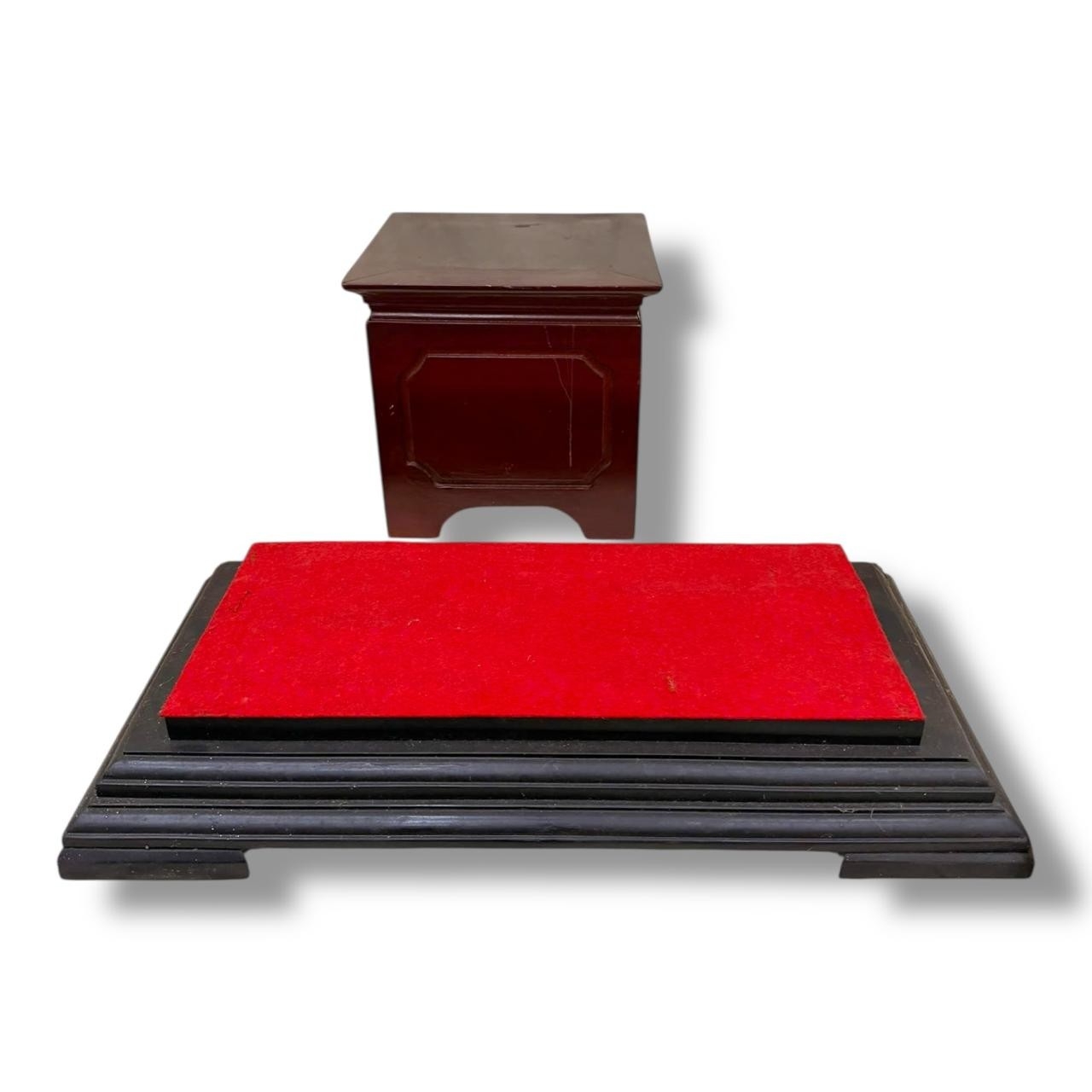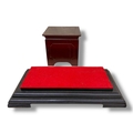 A Wooden Display Stand with Red Felt Top.