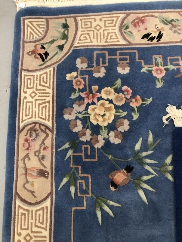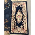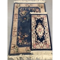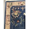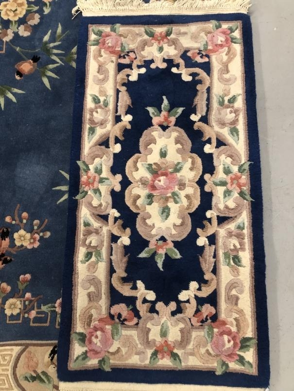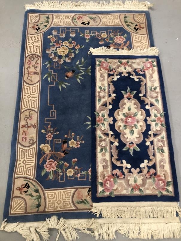 Carpets & Rugs: Chinese hand washed, the first blue ground with avian and floral decoration in blues, greens, yellows and pinks. 75ins. x 48ins. The second, smaller, blue ground with floral decoration. 48ins. x 24ins. (2)