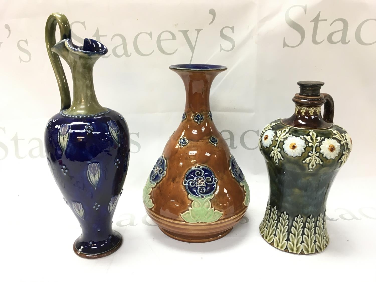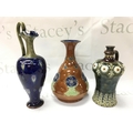 Royal Doulton Lambeth stoneware vases including a claret jug, Whiskey flagon. No obvious damage or restoration. 23 to 30cm tall approximately. This lot cannot be posted