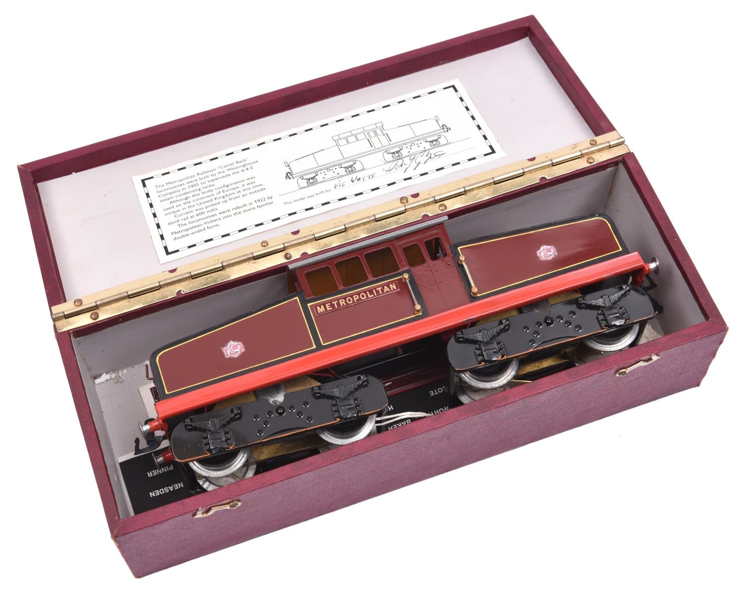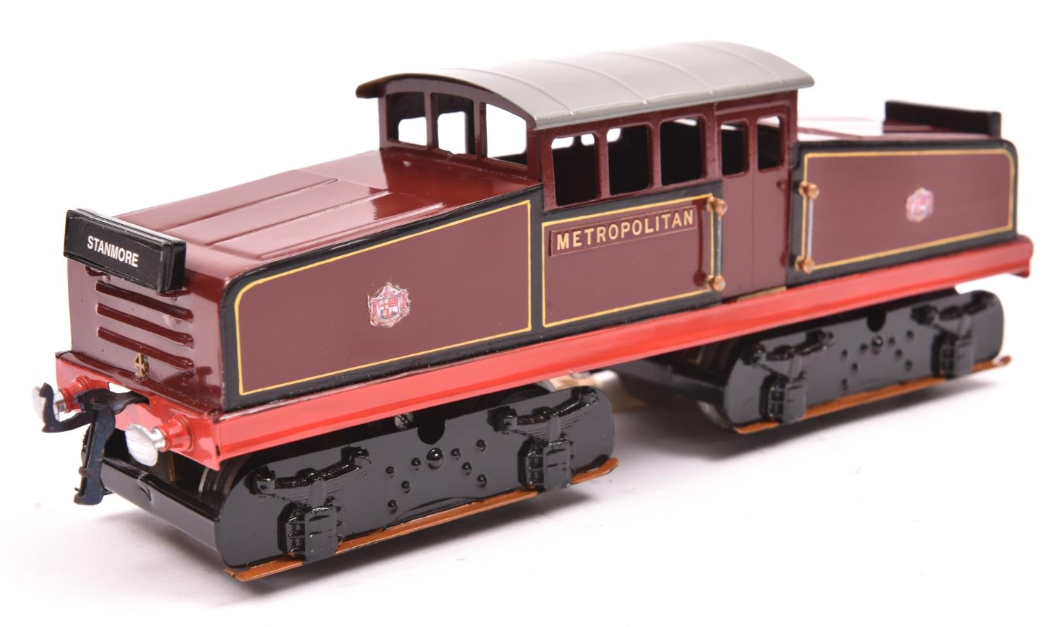 An O gauge electric tinplate Metropolitan Railway Westinghouse Bo-Bo electric locomotive, 4, in lined maroon livery. This model was built as either part of a small run or one off. For 3-rail running. Boxed. VCG. £60-80