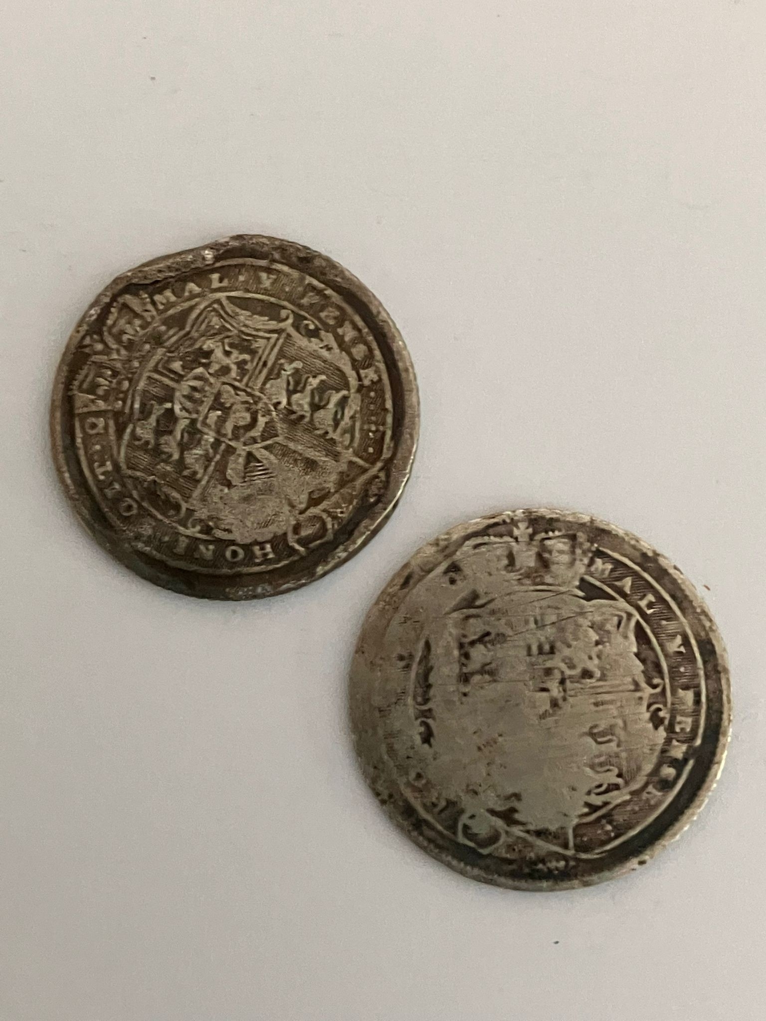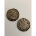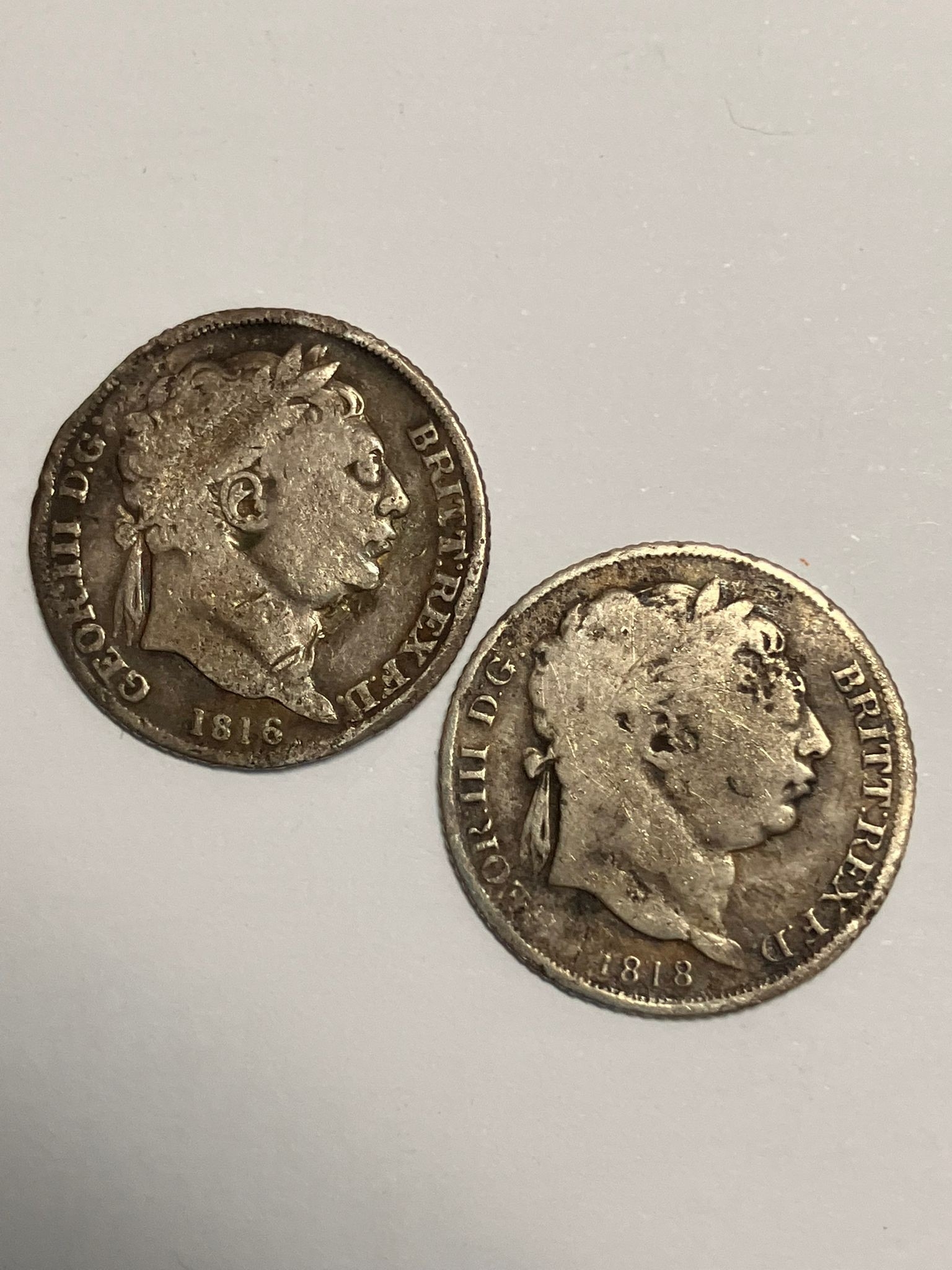 2 x GEORGE III BULLHEAD SILVER SIXPENCES coins. 1816 & 1818. Fine condition to heads (obverse), Shield side (reverse) worn.