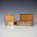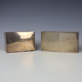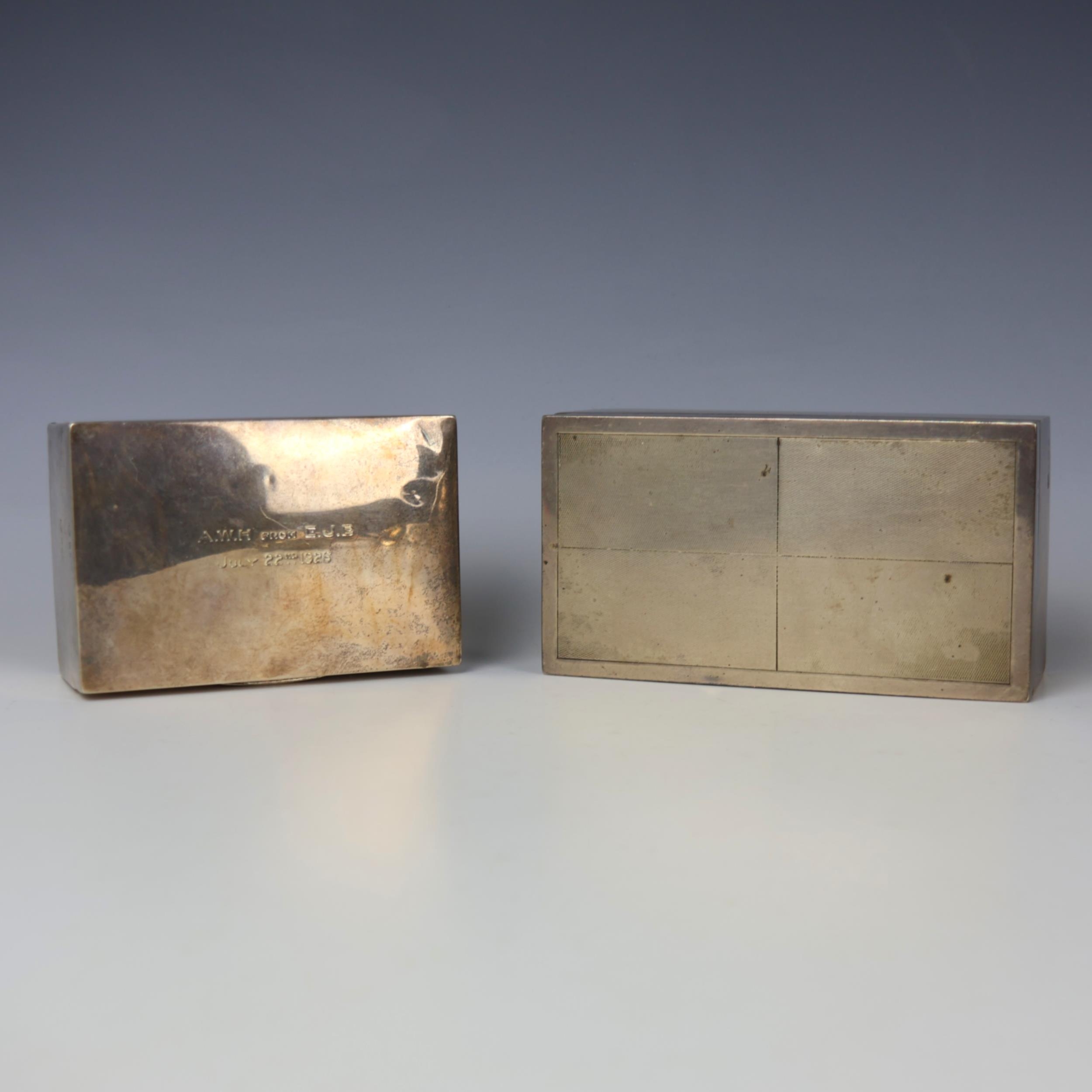 A George V silver cigarette box, Mappin & Webb Ltd, Birmingham 1925, of rectangular form with engraved checkboard style design above a presentation engraving 'vires acquirit eundo AWH from No4 Company RMC' 17cm wide, with a further Goldsmiths and Silversmiths example (2)